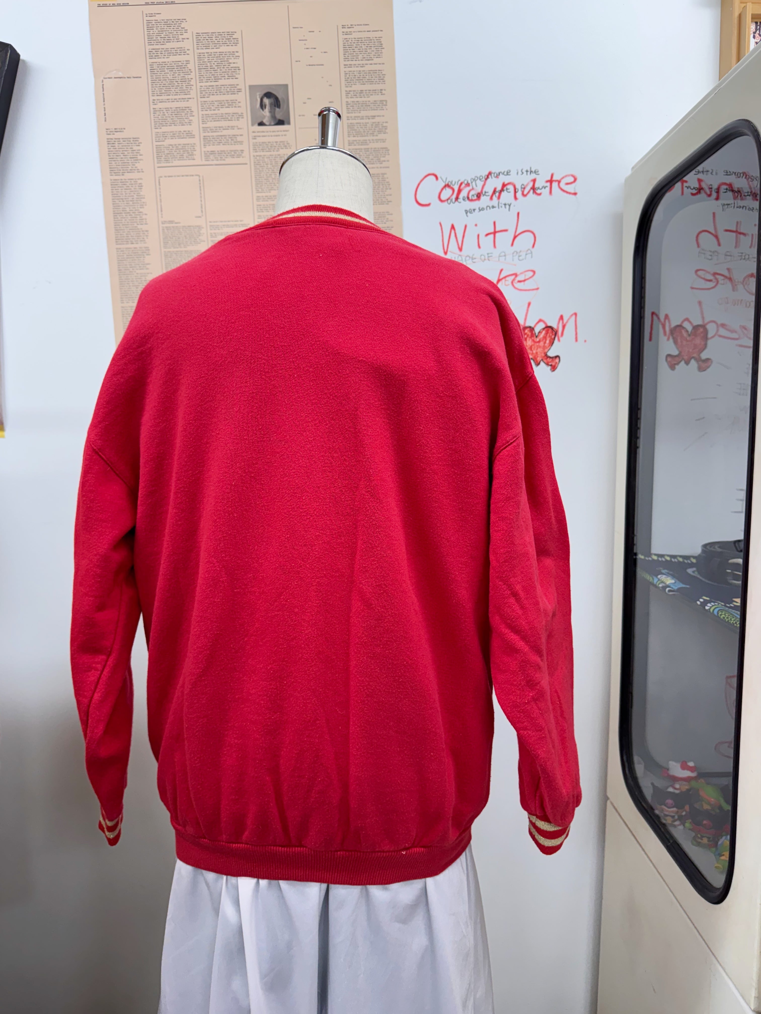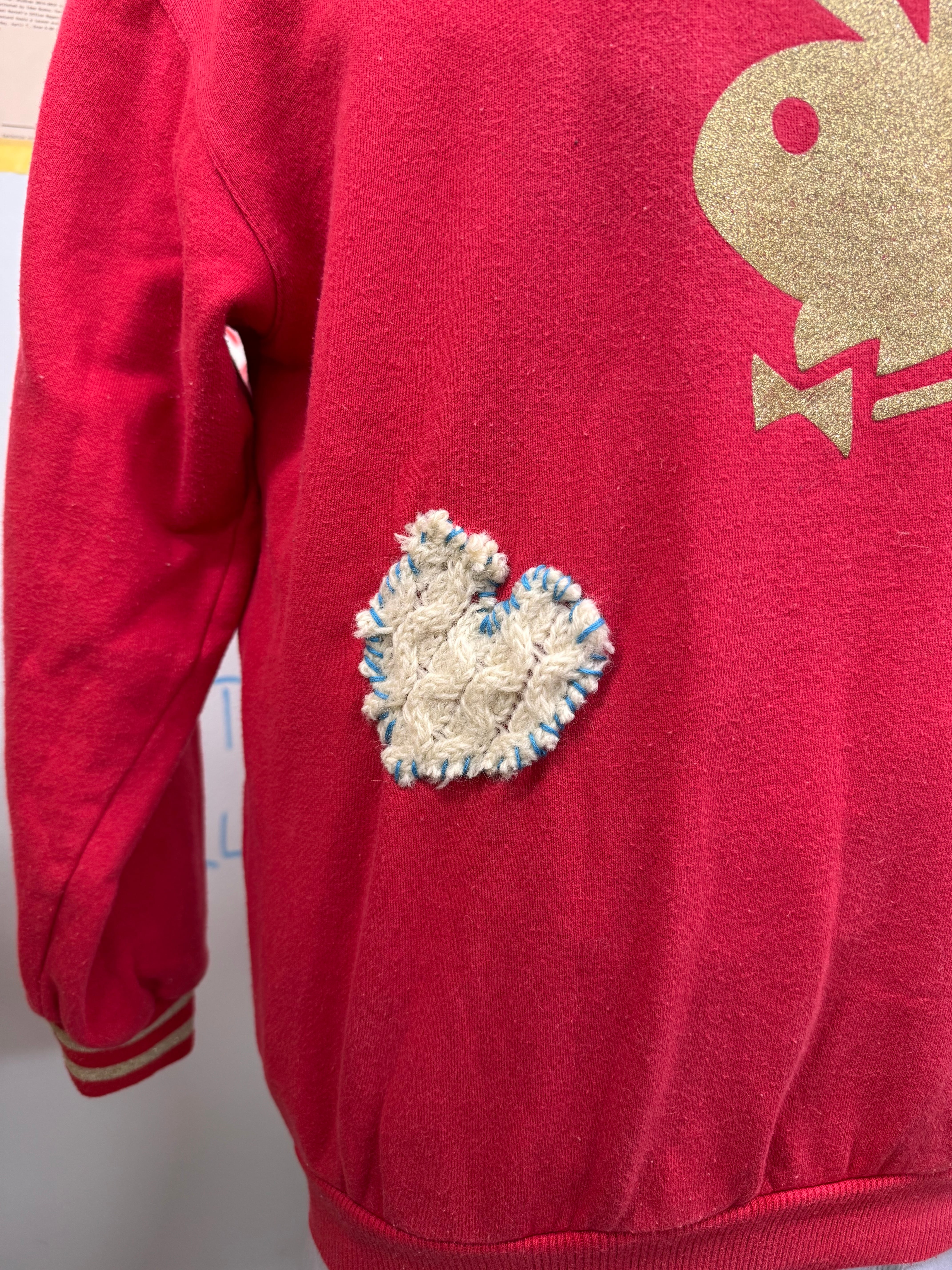 tamago storeにてヴィンテージのフィッシャーマンセーター端切れをハートにカットし付けています。