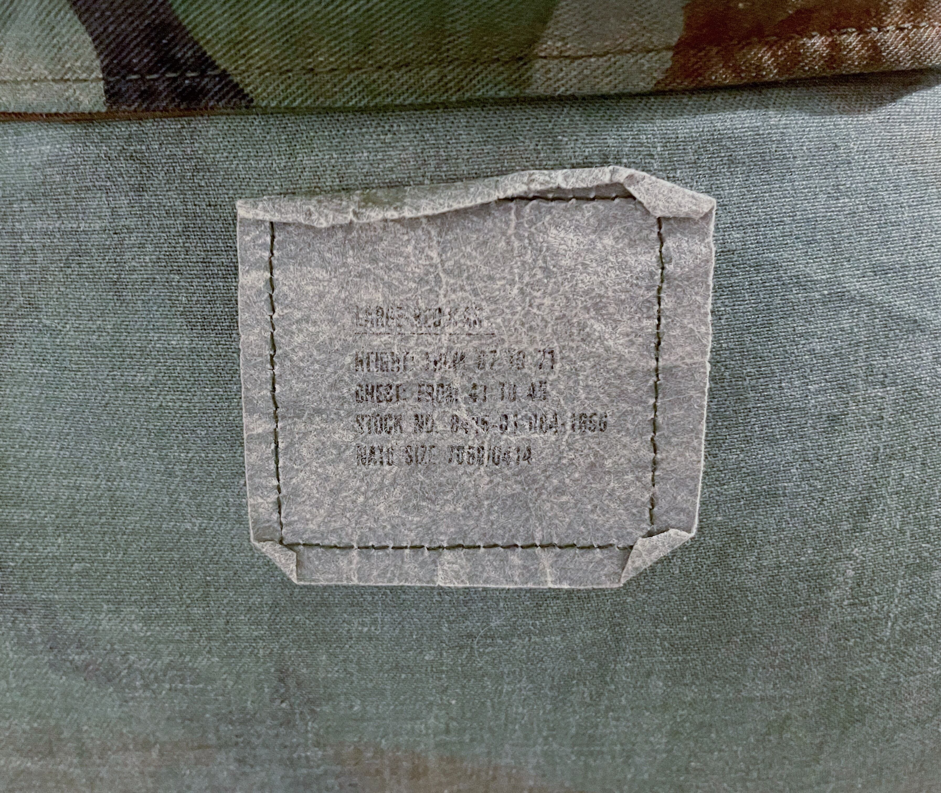 おそらく青の染料で染めているのか、裏地が微妙に青くなっており、全体的にウッドランド特有の緑では無くくすんだ色合いが特徴的なアイテム。
