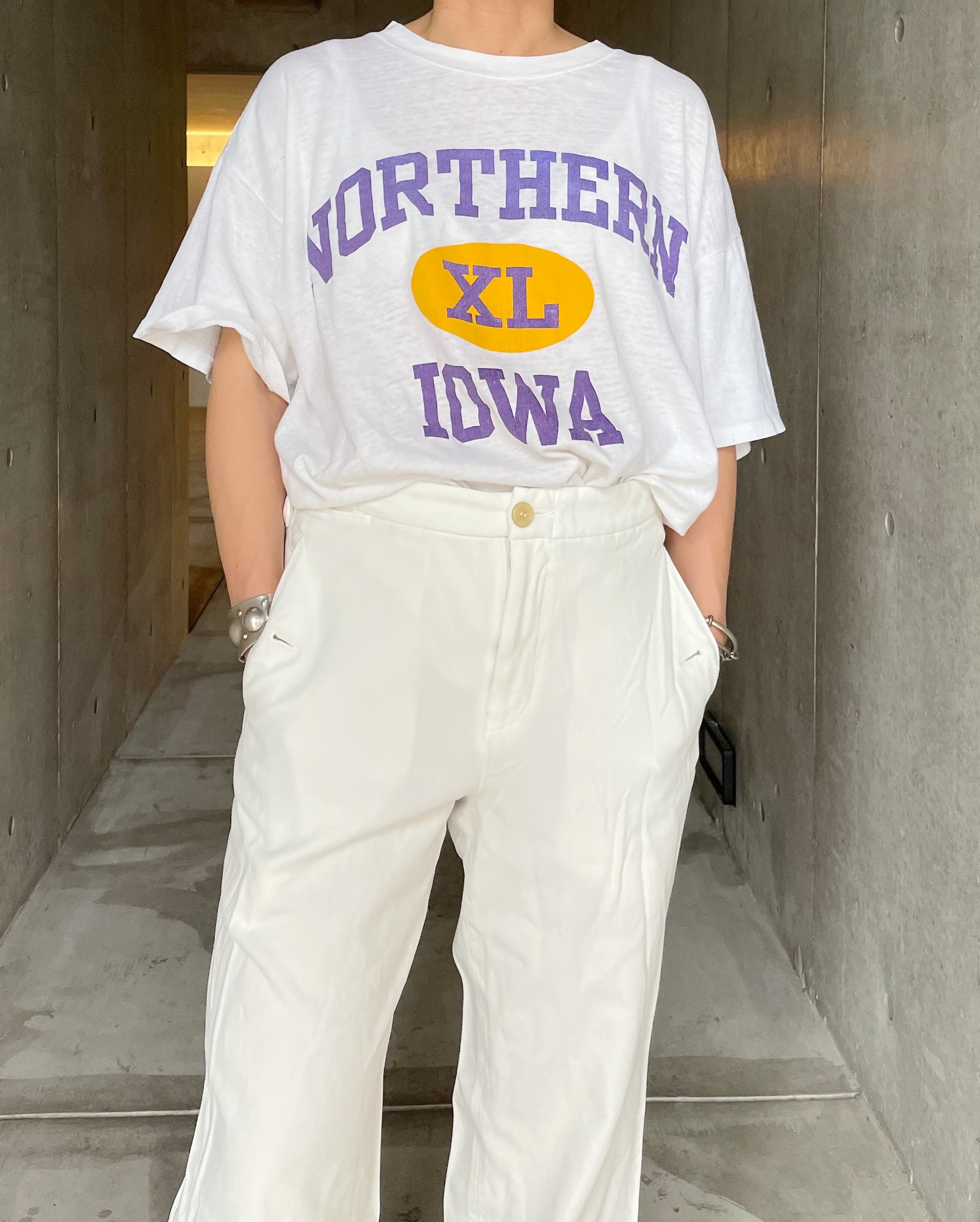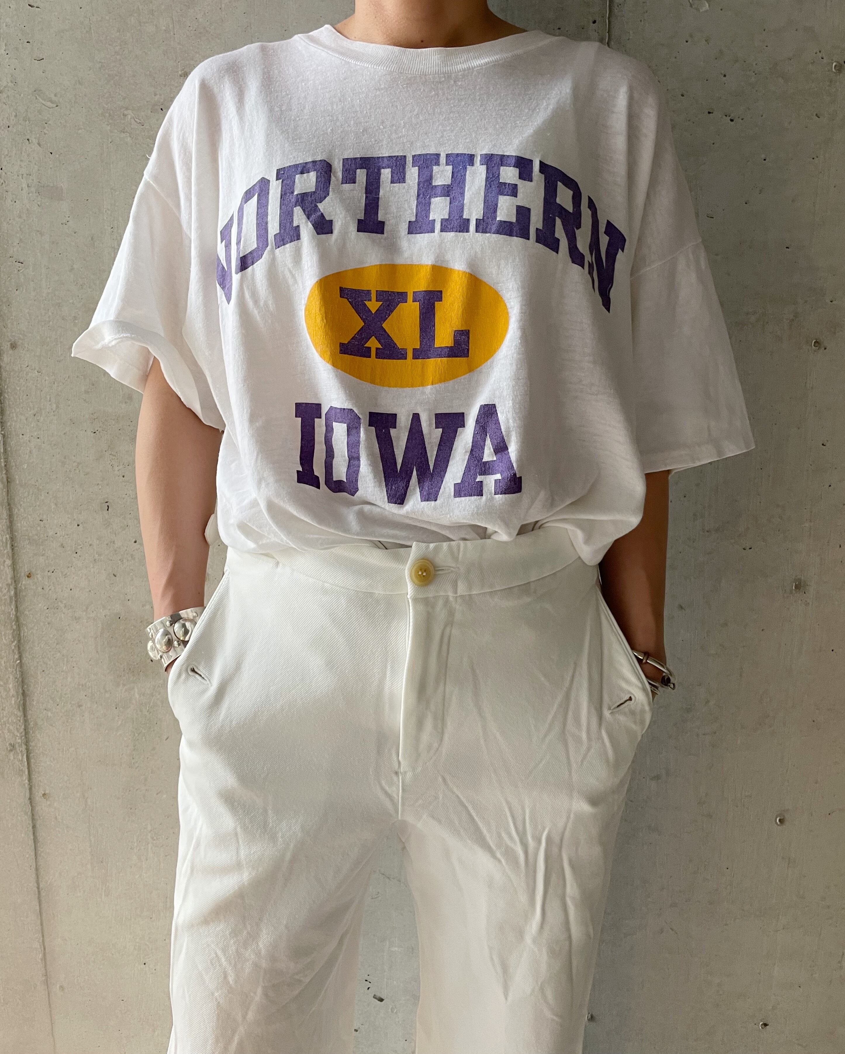 繰り返される洗濯により綿溶けが起きて、生地が少し薄くなり、独特な魅力を醸し出しているカレッジプリントTシャツ
