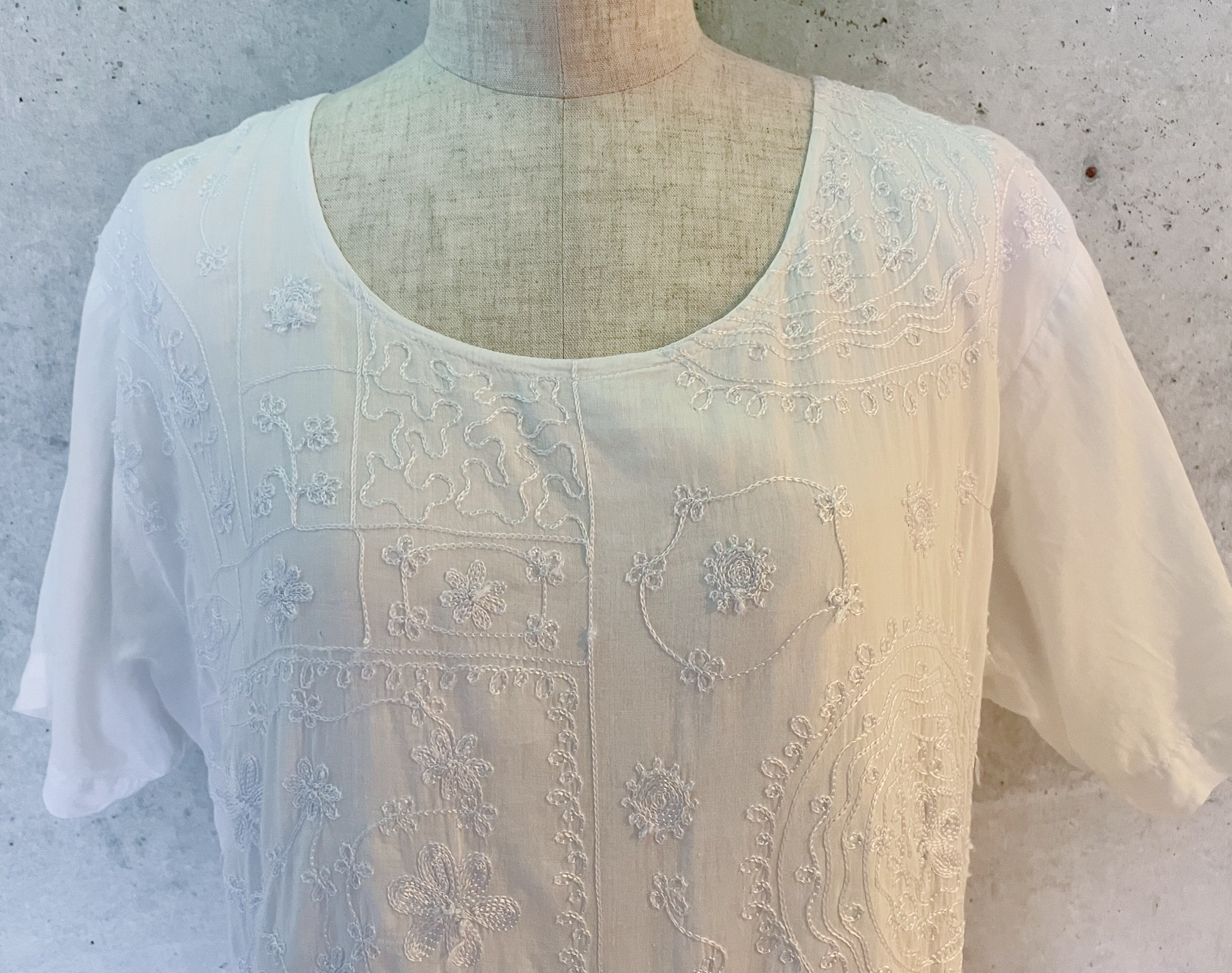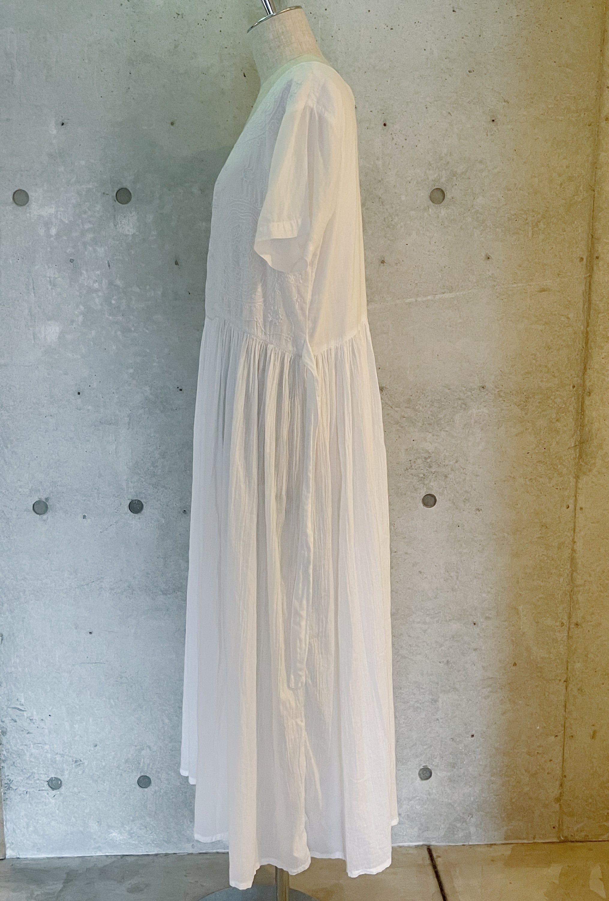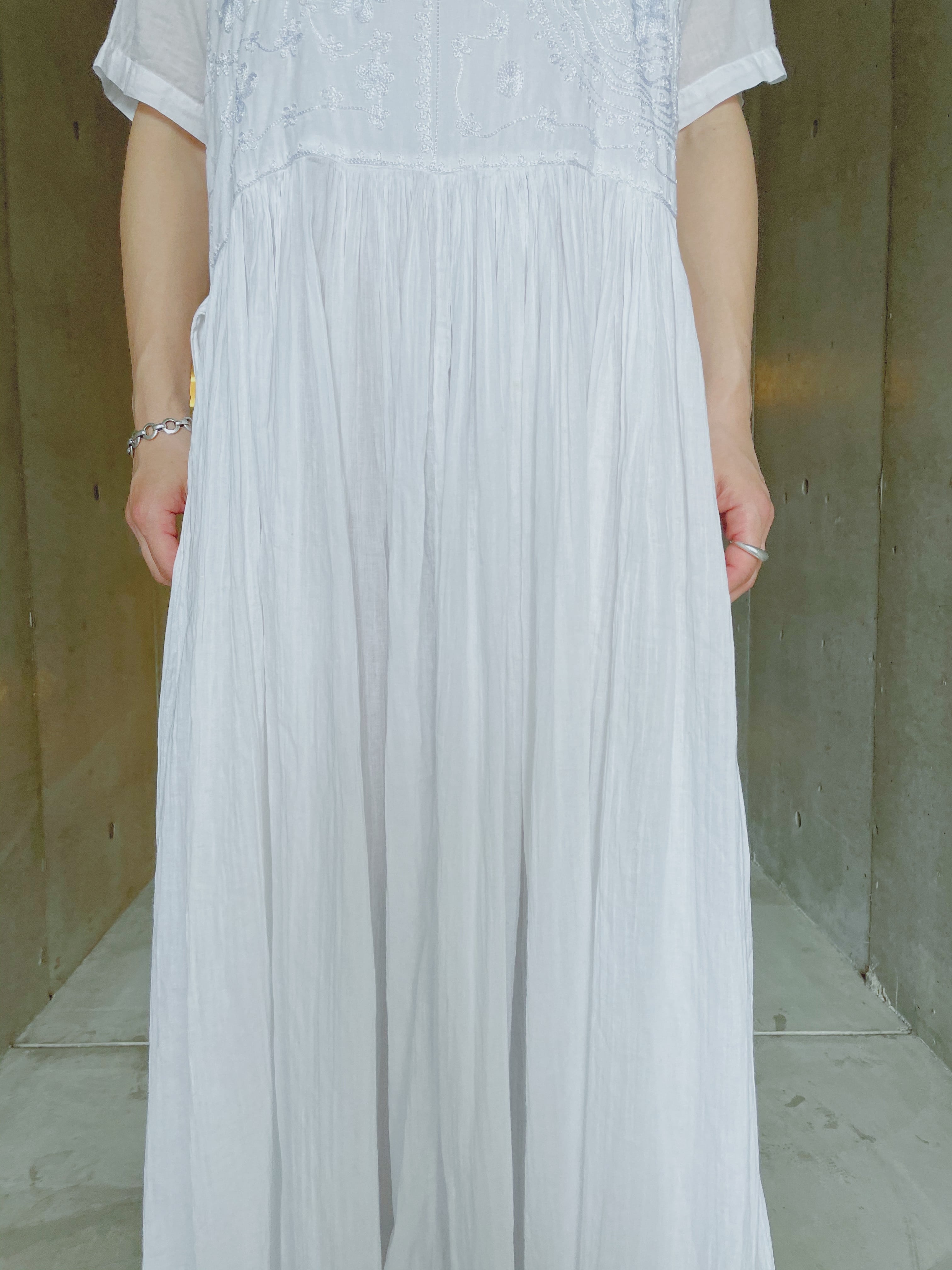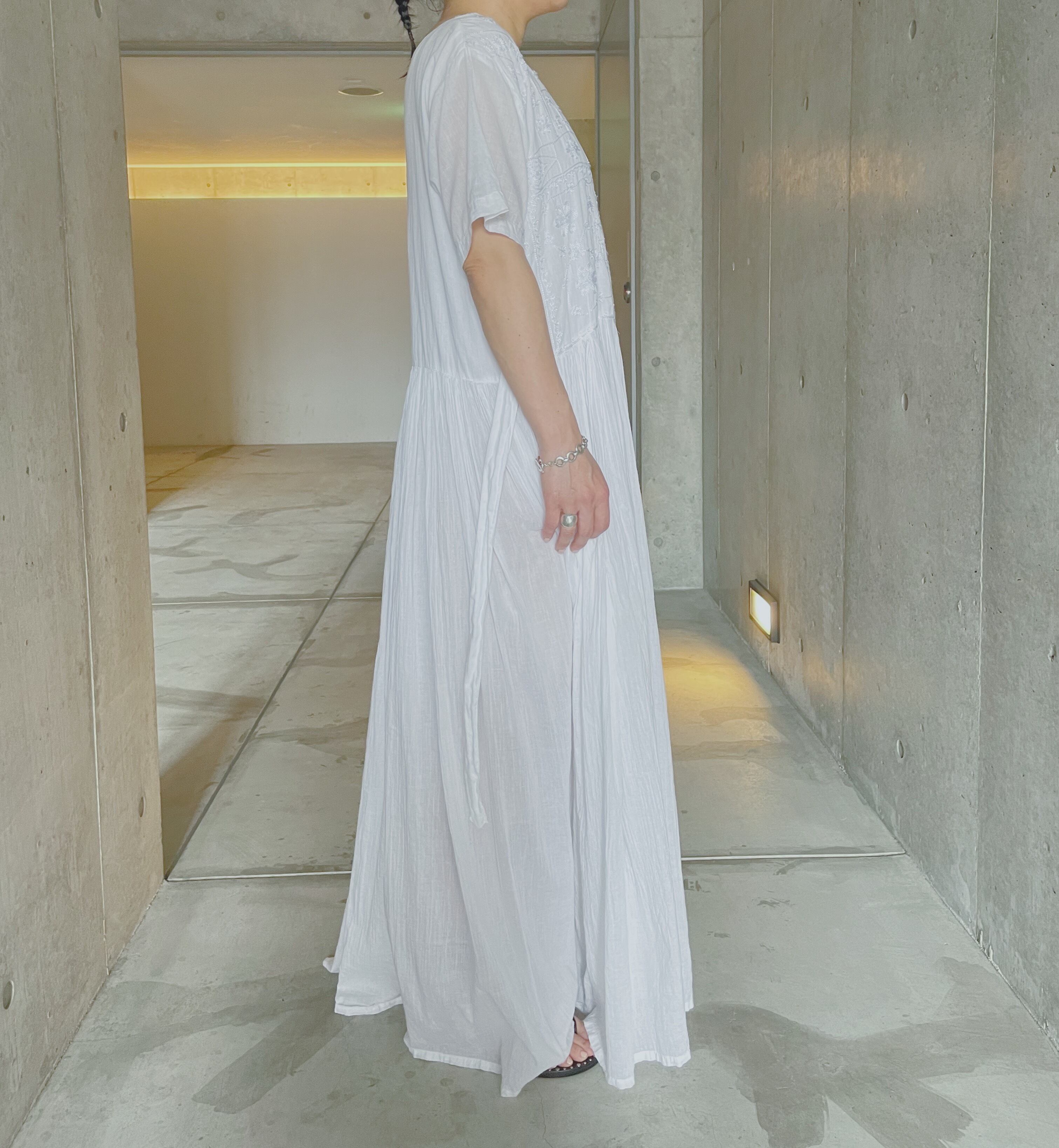 左右で異なるデザインの刺繍が施されたマキシ丈ワンピース