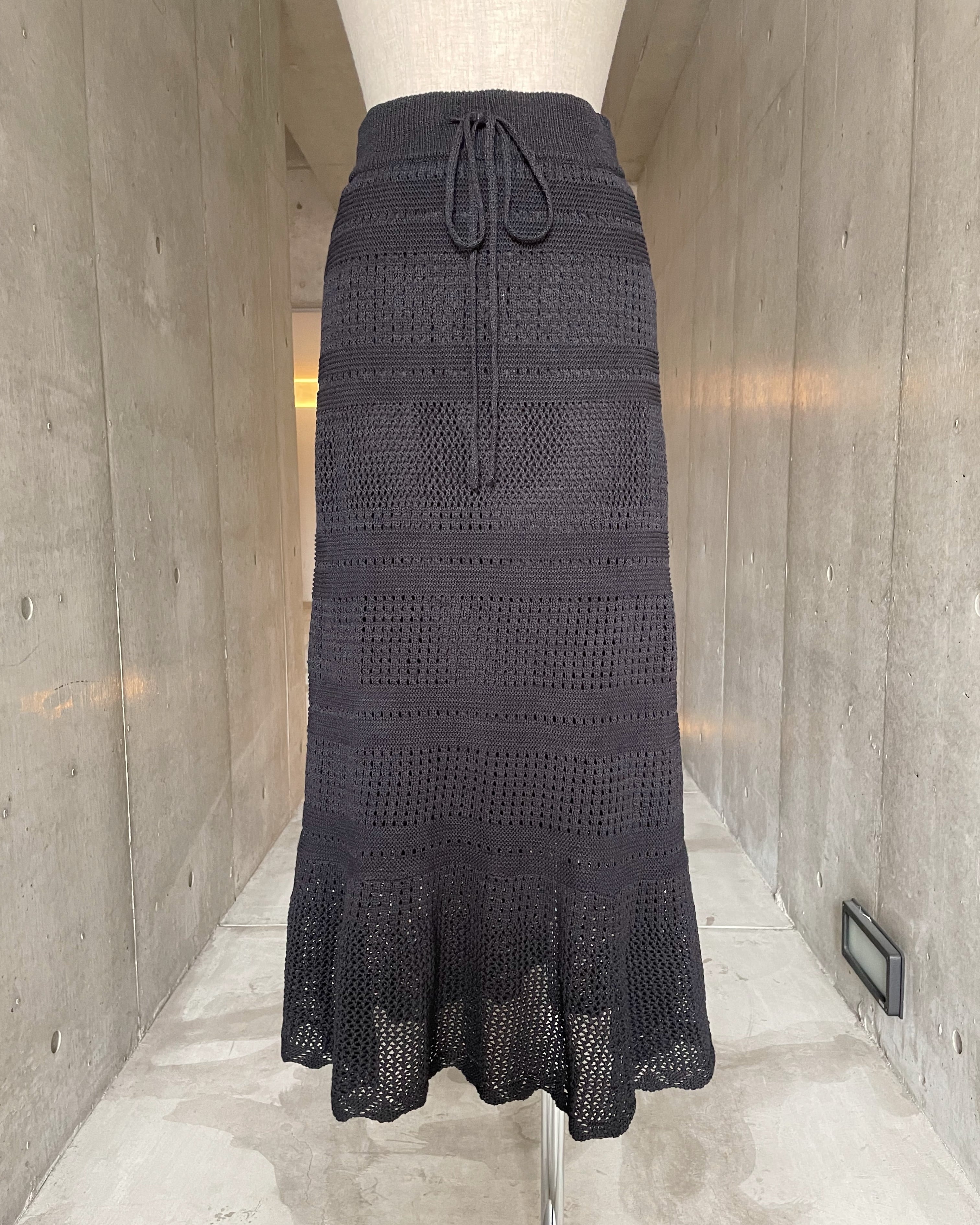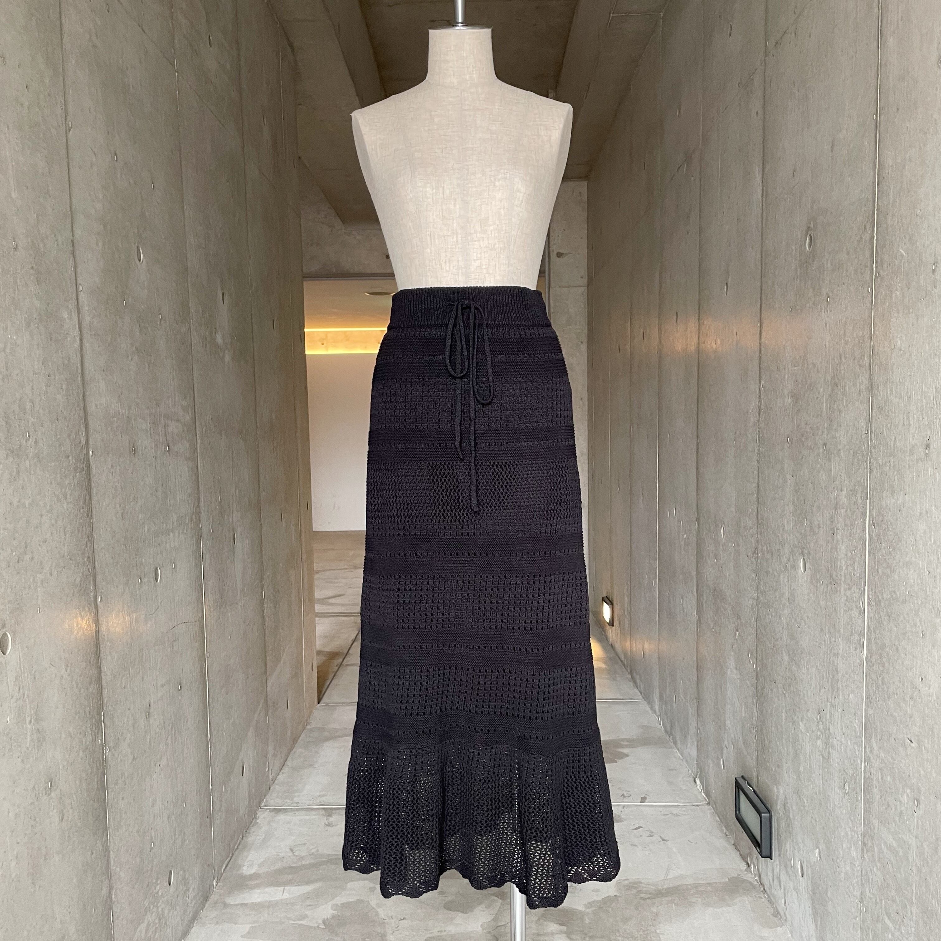 様々な編みの技法を用いて作られたニットスカート。素材はおそらくコットンなので通年通して使って頂けます。