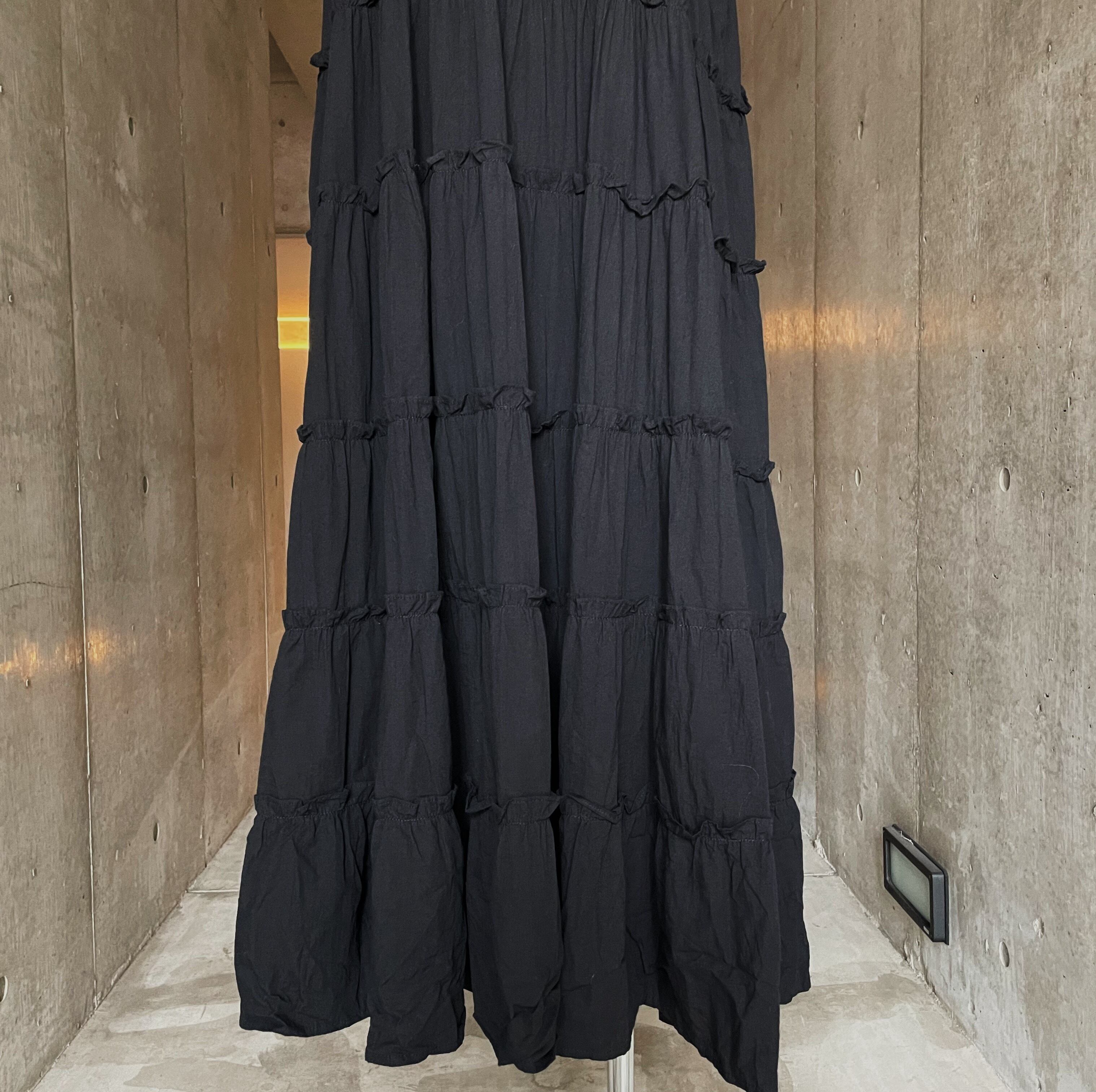裾にかけてフレアになっており、段々になったデザイン面白いドレス ノースリーブ仕様で脇周りにもゆとりがあるデザインなのでインナー次第で季節問わずに使って頂けます。 レディースモデル身長:153cm condition:特に目立ったダメージなし SIZE:Free material:cotton 全て平置き採寸です。 肩幅:41.5cm チェスト:50cm 総着丈:121cm