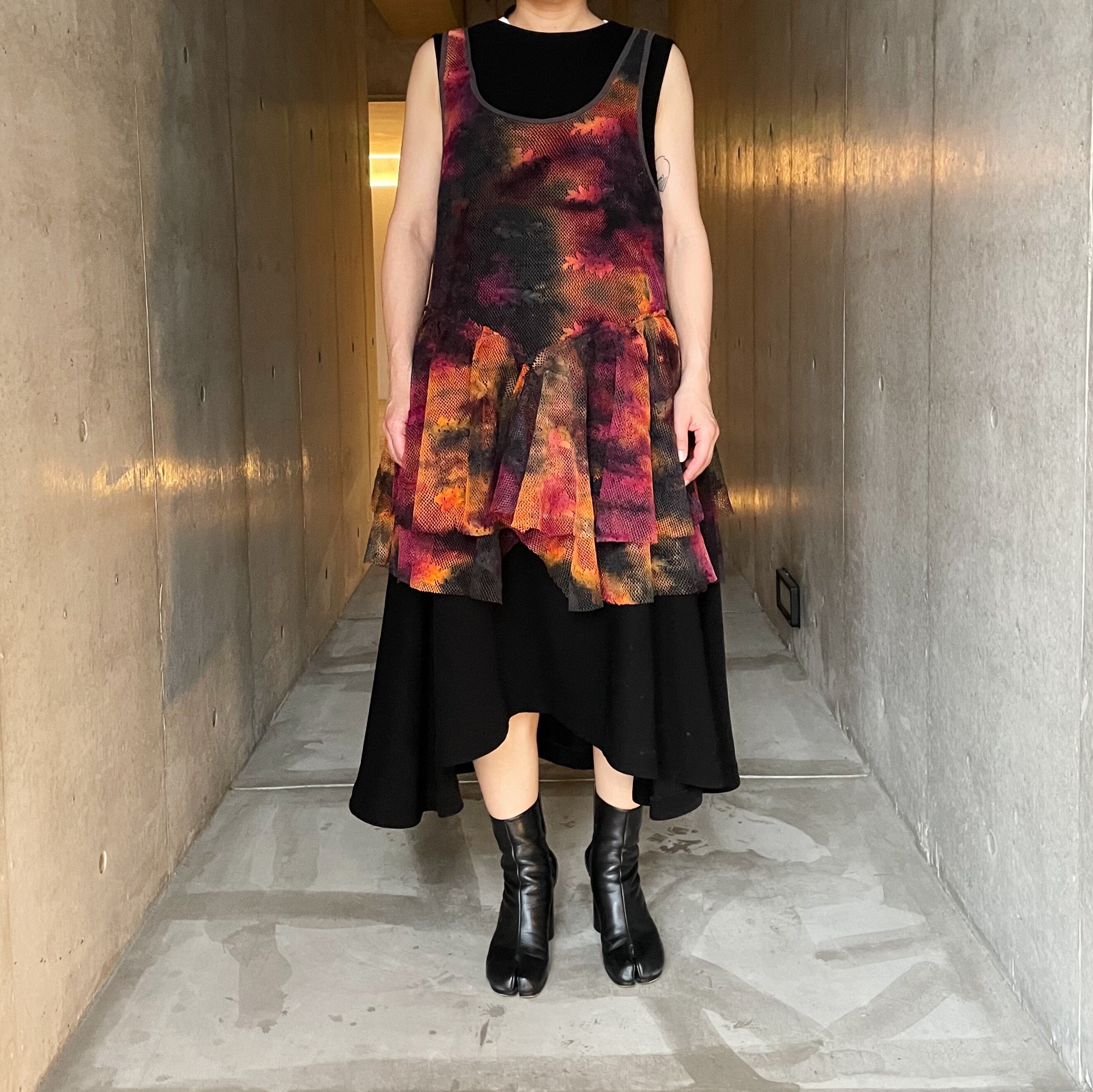 裾に掛けてボリュームのあるフリルデザインと独特なプリントが特徴的なタンクトップ ワンピースにレイヤードのほか、Tシャツを上から重ねて裾から出したレイヤードコーディネートも素敵です 着用 レディースモデル身長:153cm SIZE:M 全て平置き採寸です。 肩幅:28cm チェスト:42cm 着丈:(肩紐部分から)81cm