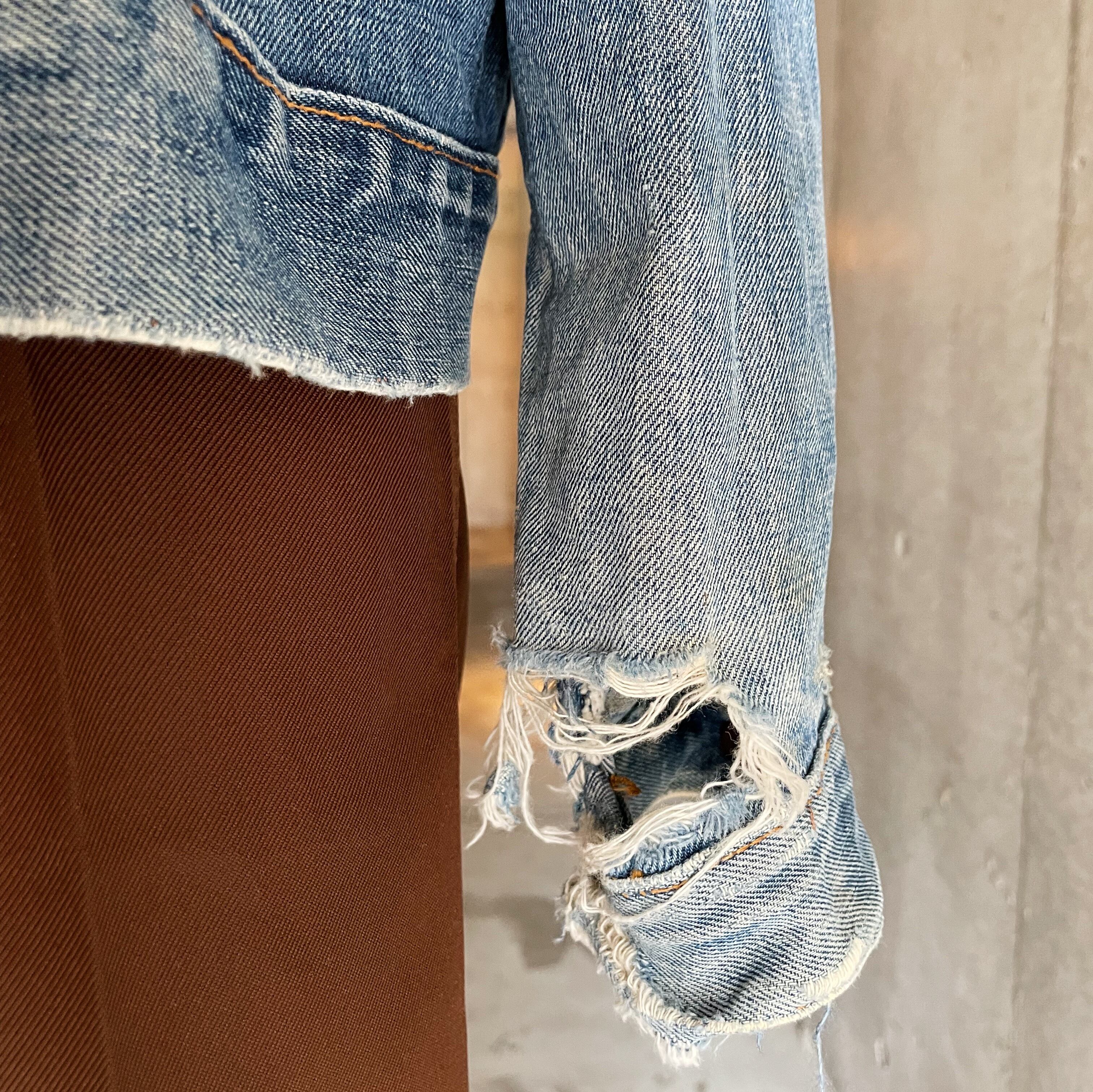 状態は決して綺麗では無いですが、大きめのサイズにハードなダメージにて完成された唯一無二のデニムジャケットで新しいコーディネートを楽しんで頂きたい一枚です。
