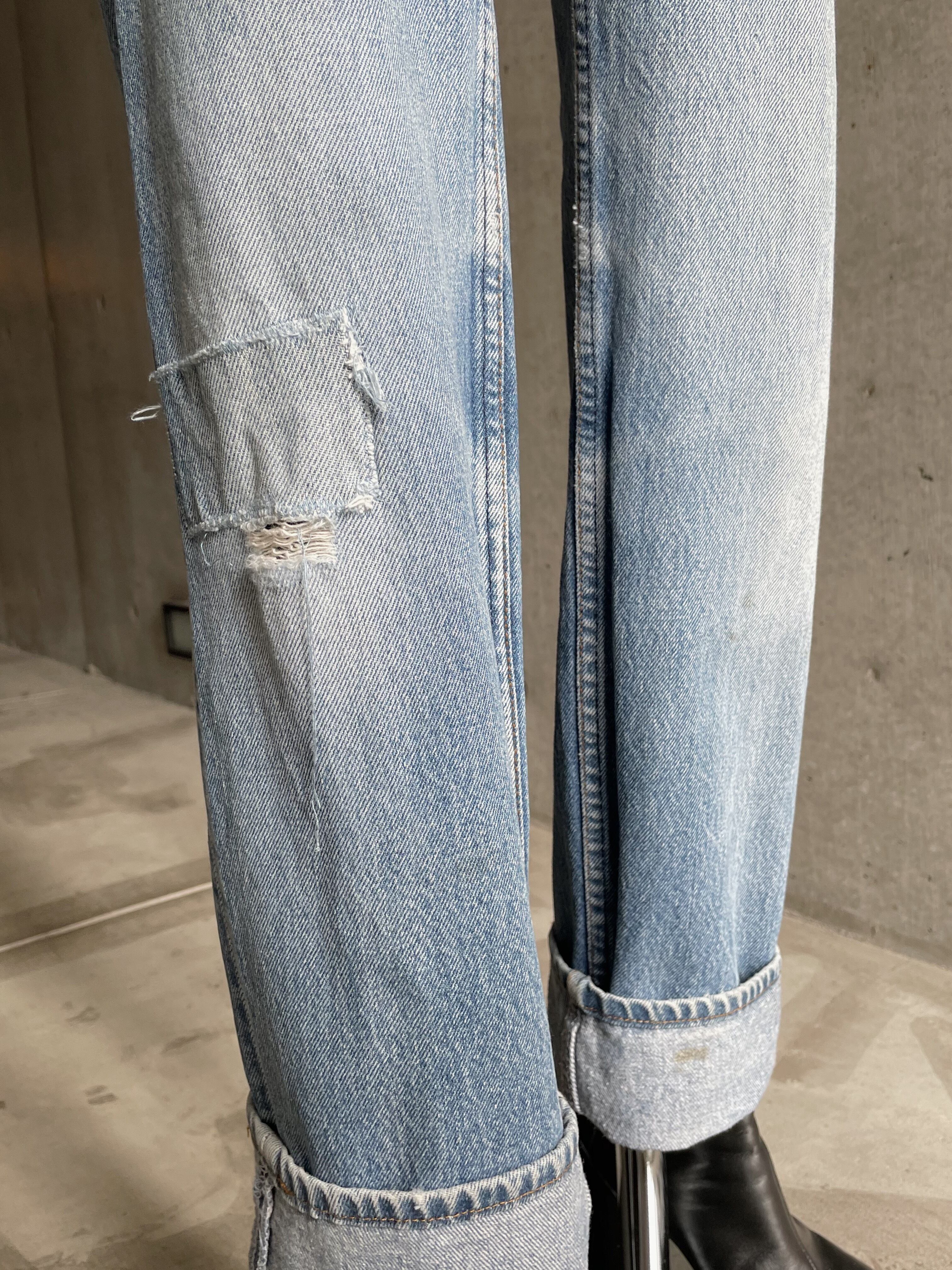 絶妙な色落ち具合に加え、右膝下のリペアもポイントです。