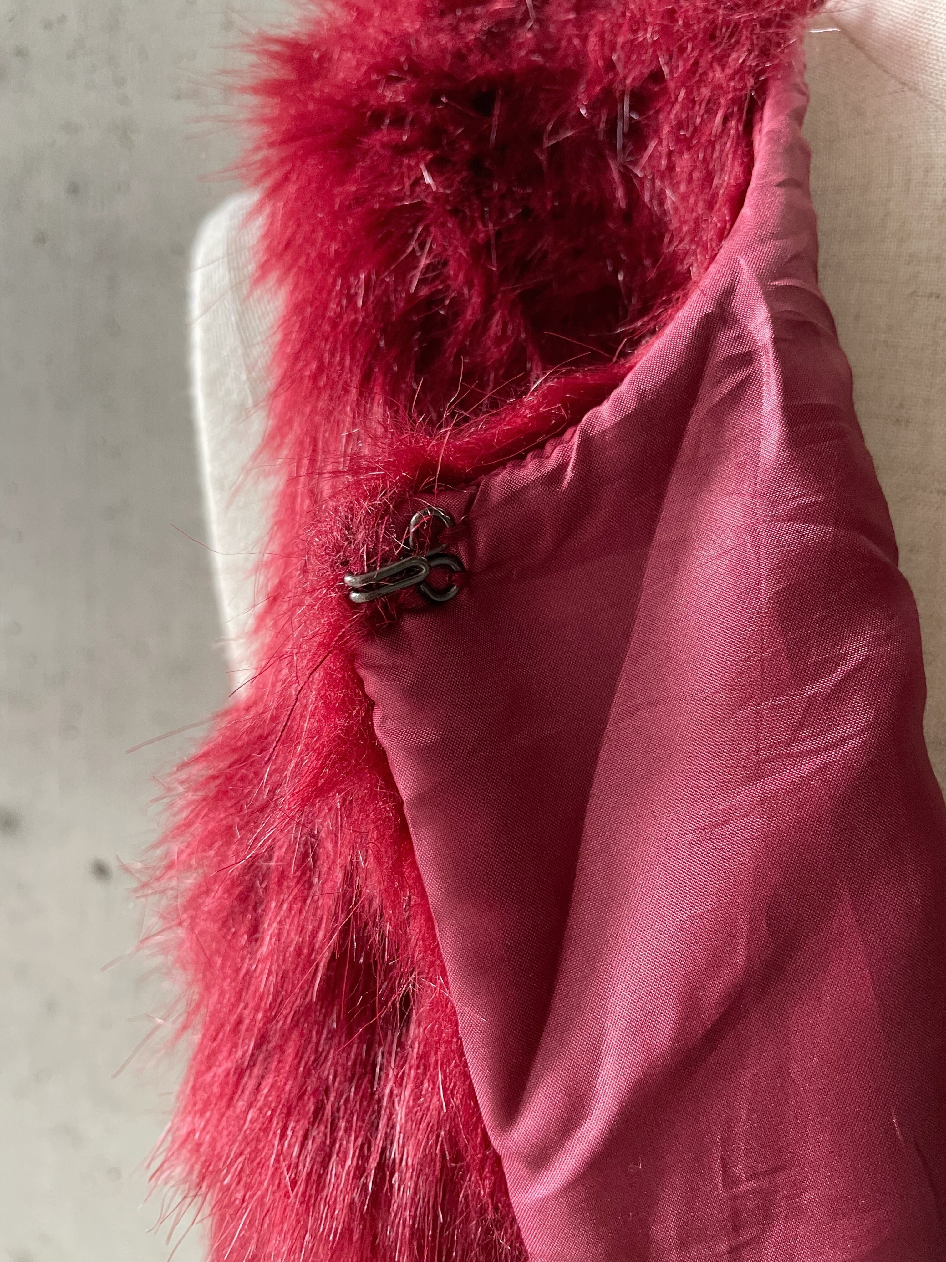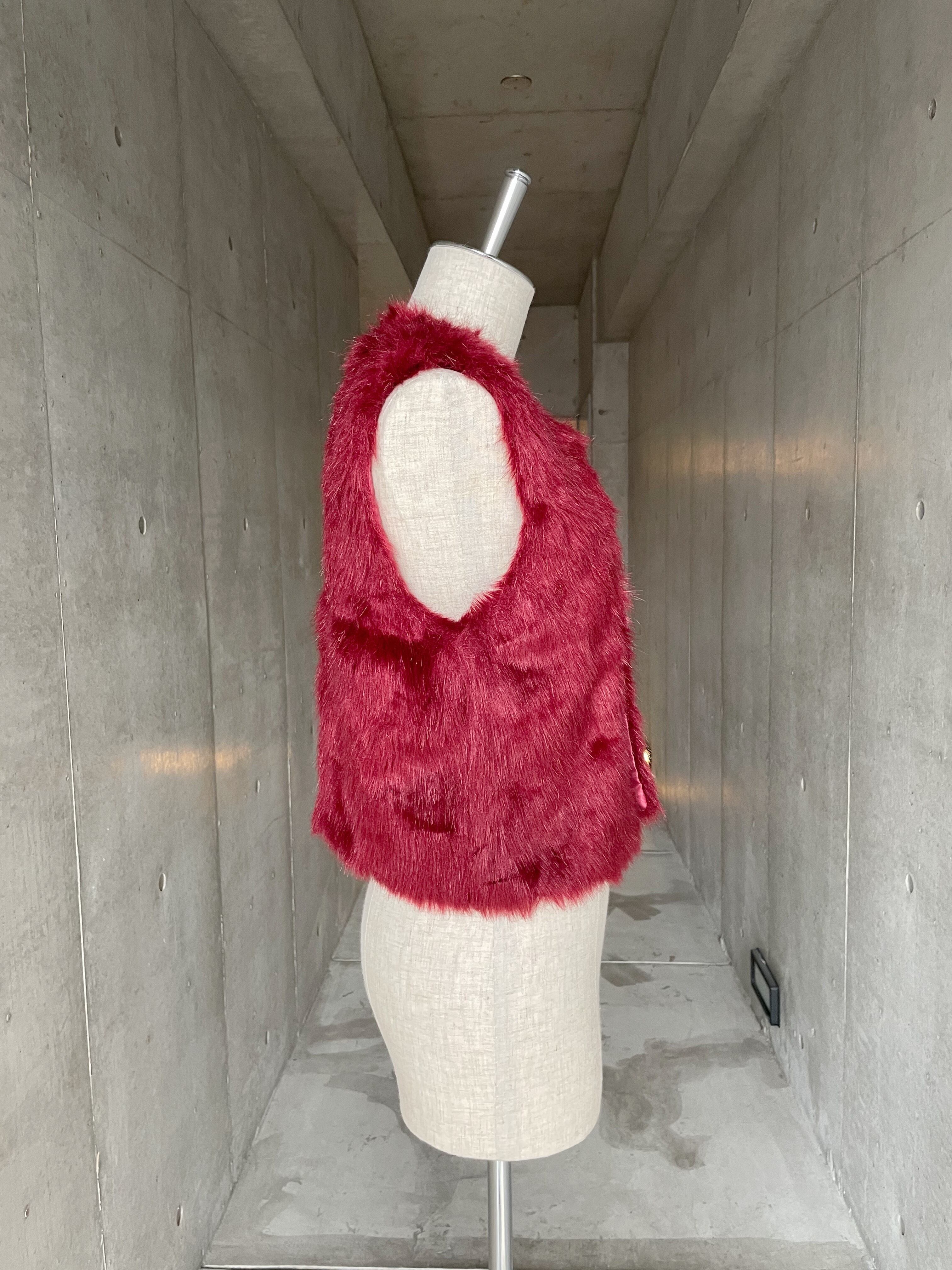 バーガンディカラーが目を惹くフェイクファーベスト