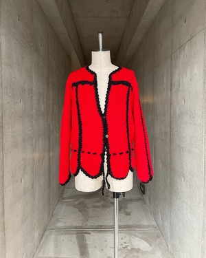 おそらくホームメイドと思われる鮮やかな赤色が目を惹くニットカーディガン
