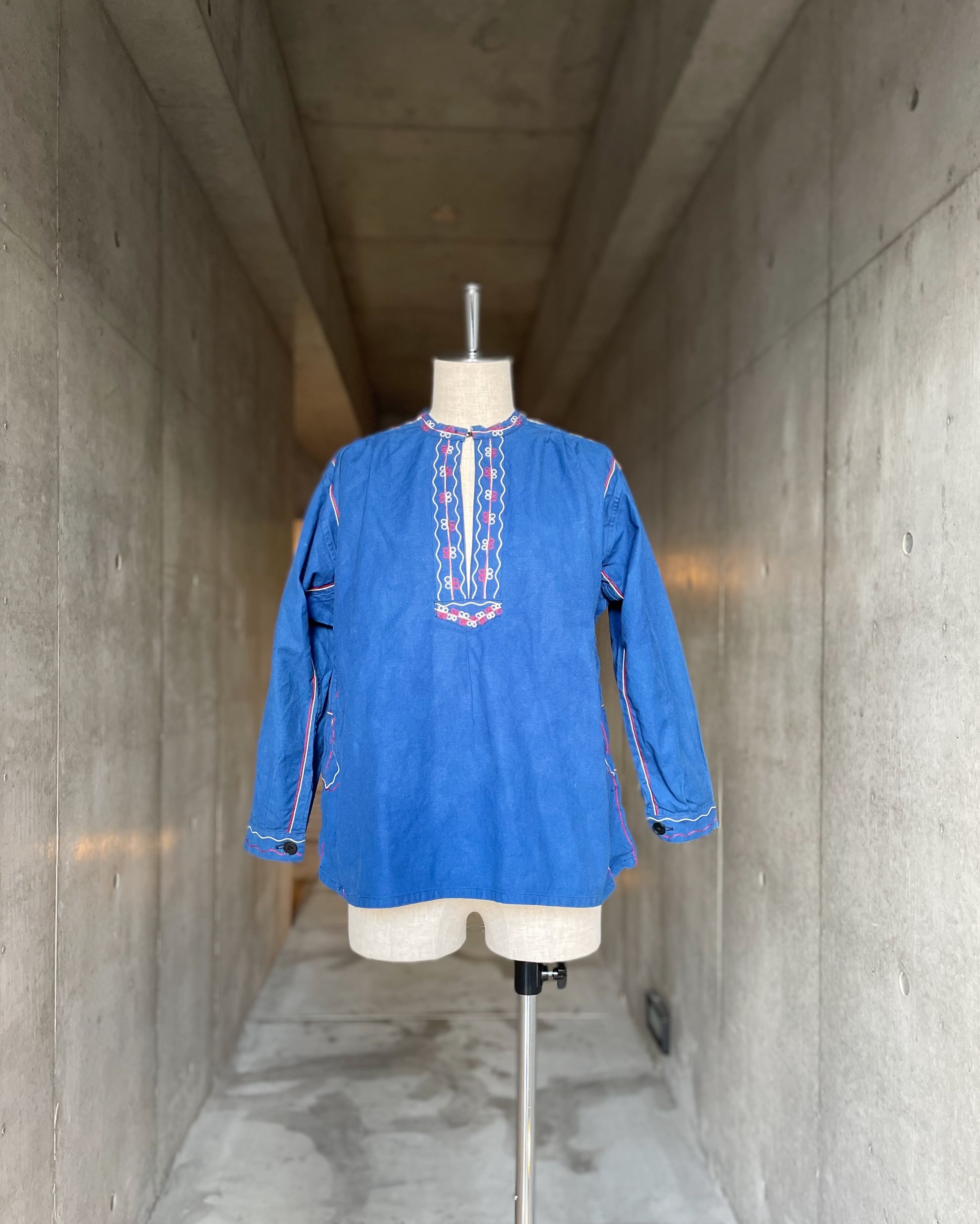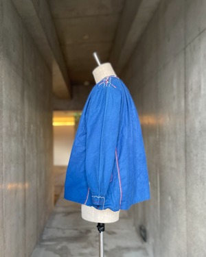 少しくすんだブルーに赤と白で構成されたオリエンタル調の刺繍が映えるペザントブラウス