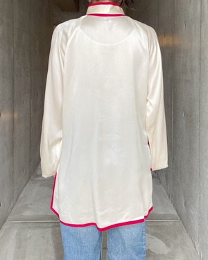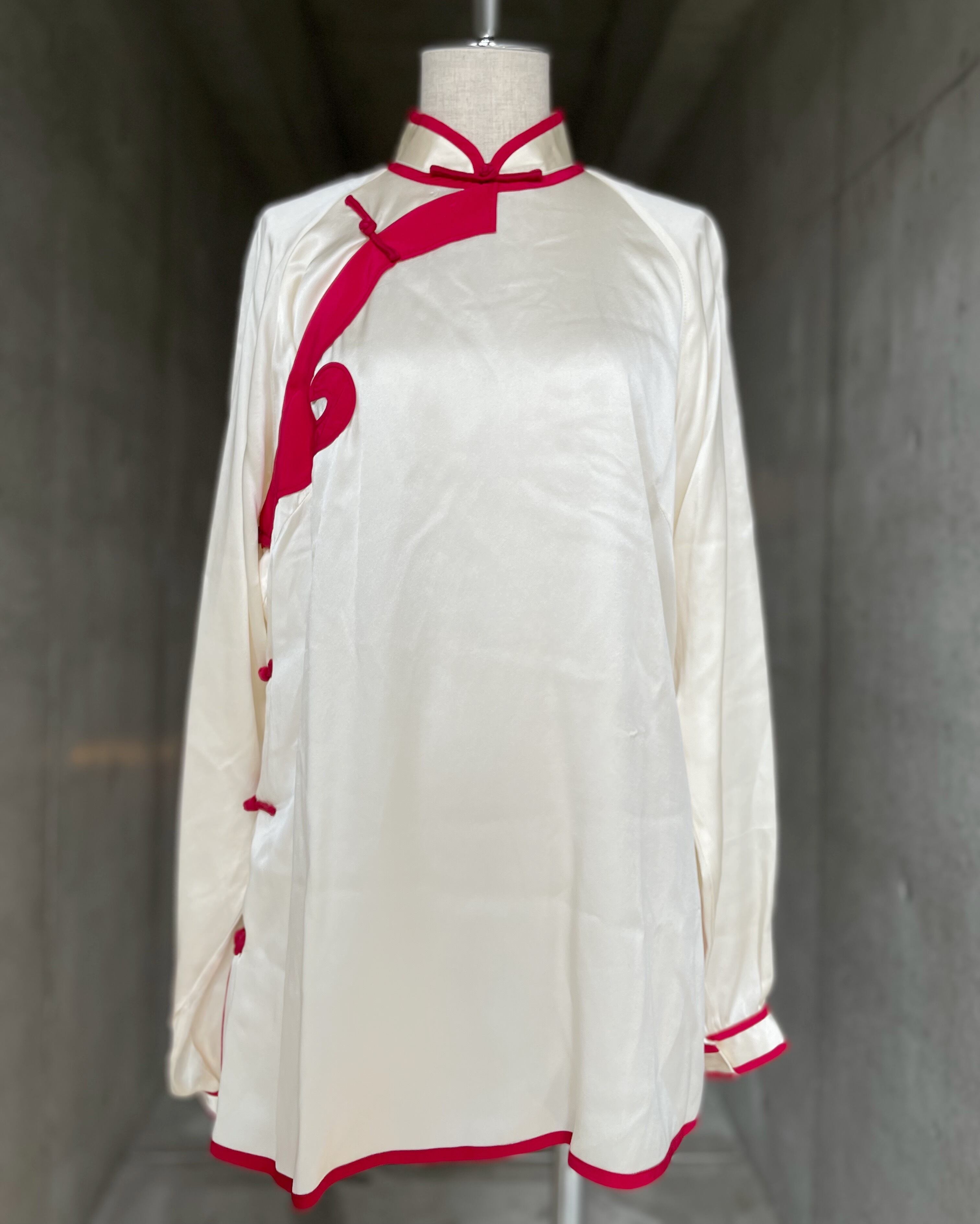 〜80年代頃までのシルクは素材自体の質も良く、滑らかな肌触りが特徴的で染色が施されていないシルク特有のアイボリーカラーに赤のパイピングのみとチャイナシャツの中でもシンプルなデザインで着やすいのもポイントです。