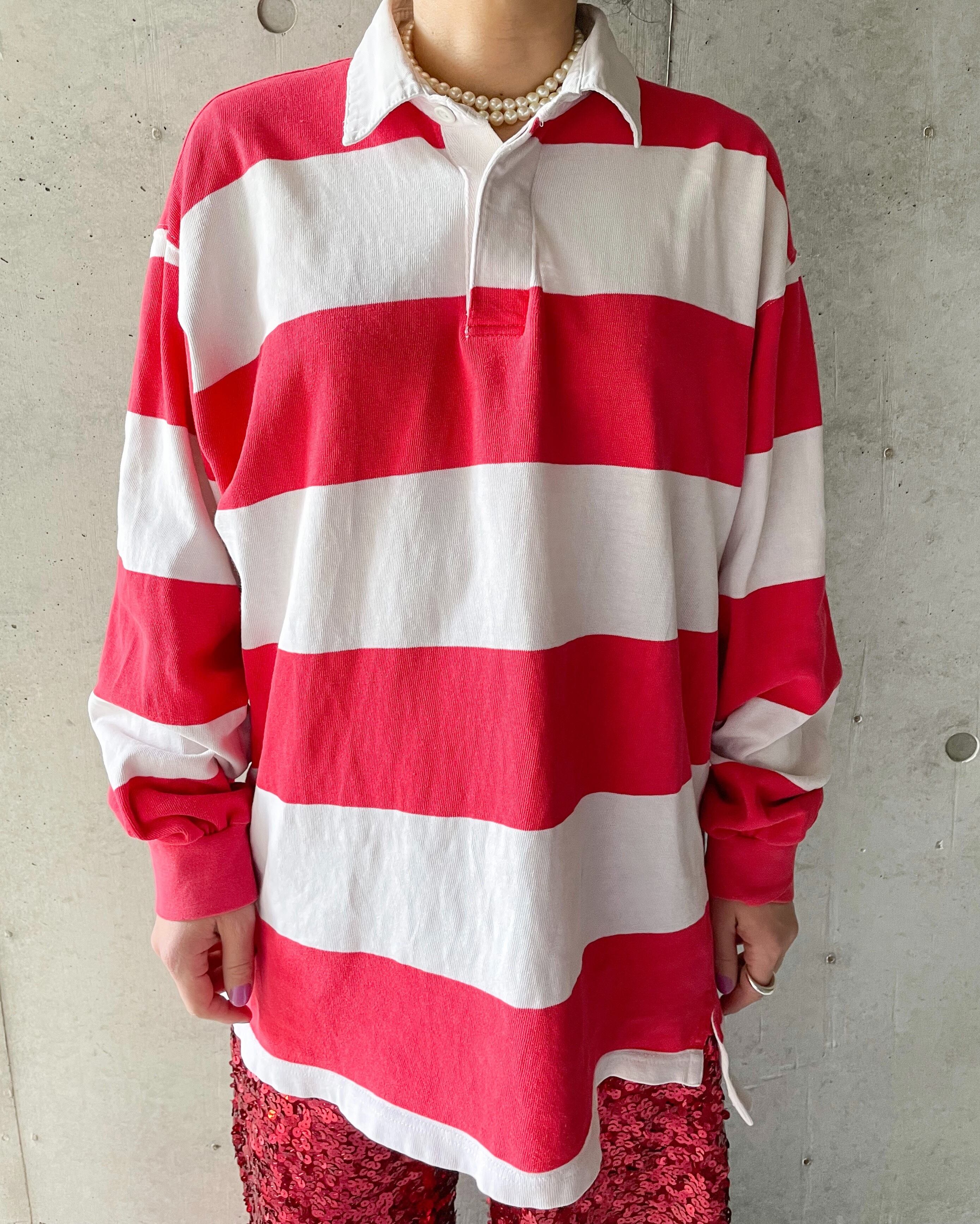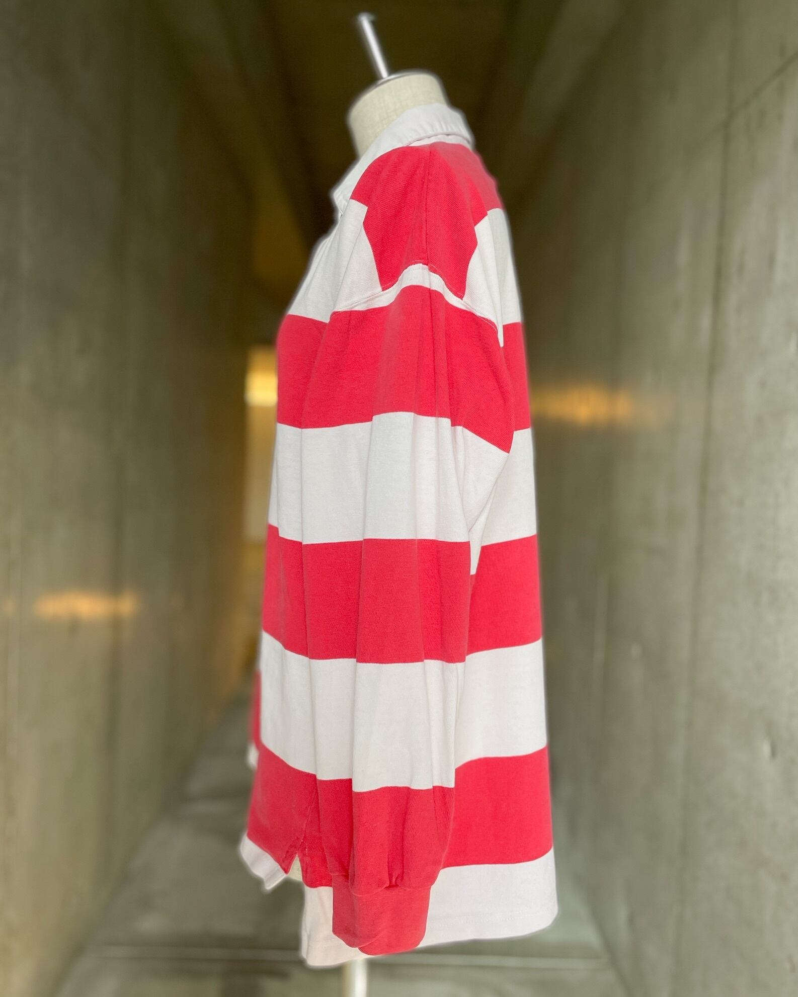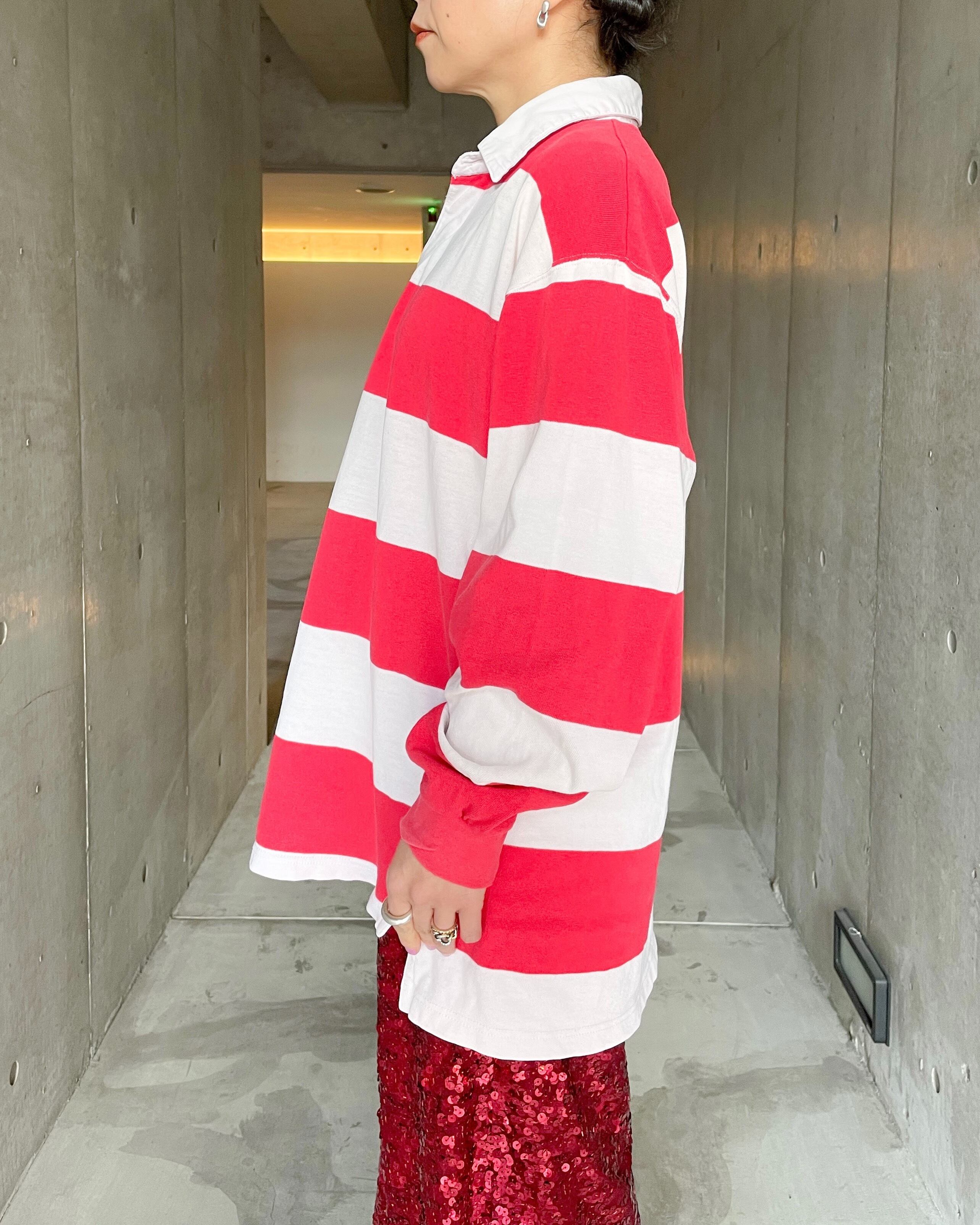 今期の気分に寄り添うラガーシャツ。全体の使用感に加えて赤色がフェードし、ピンクに近い色合いになっているのも素敵です