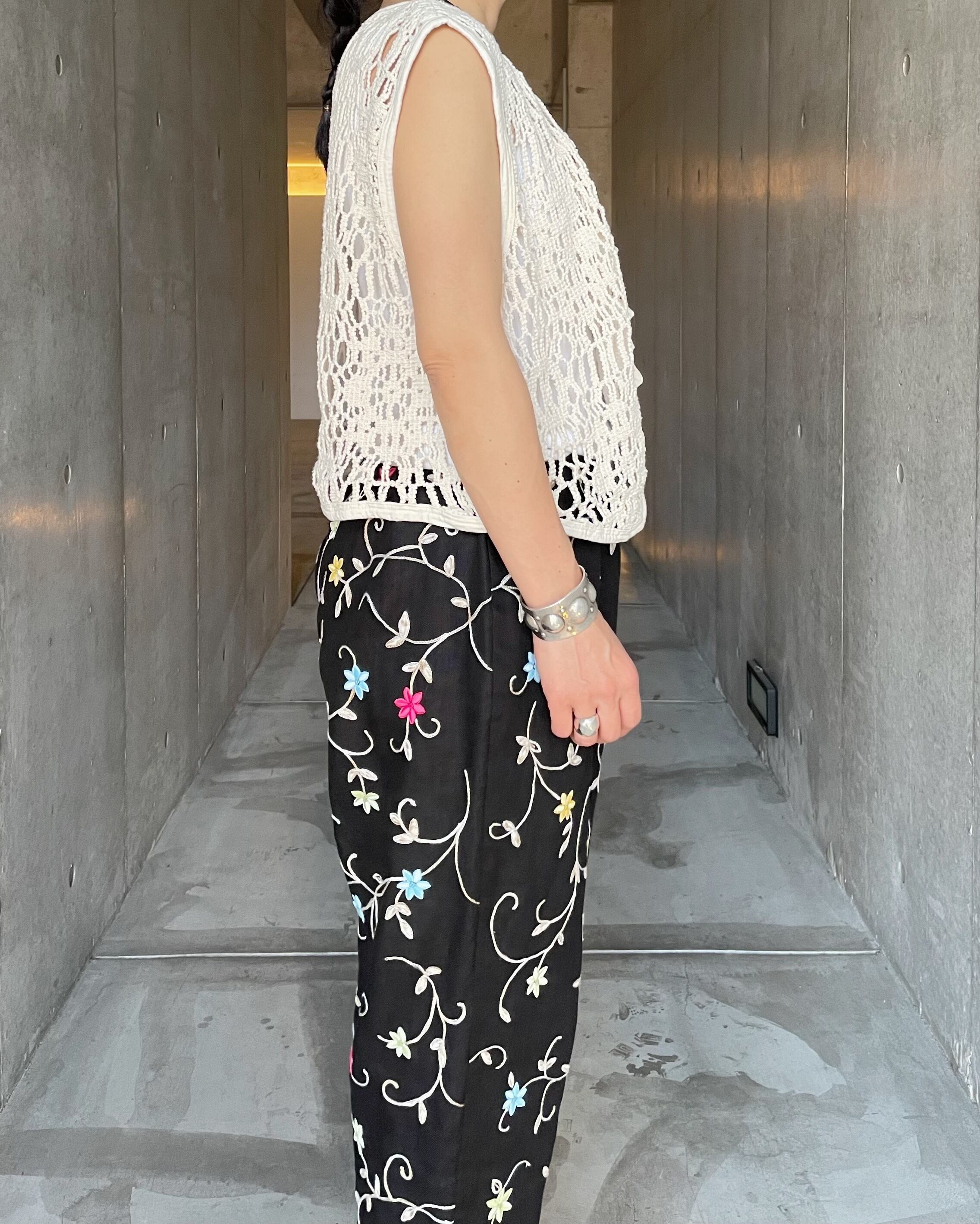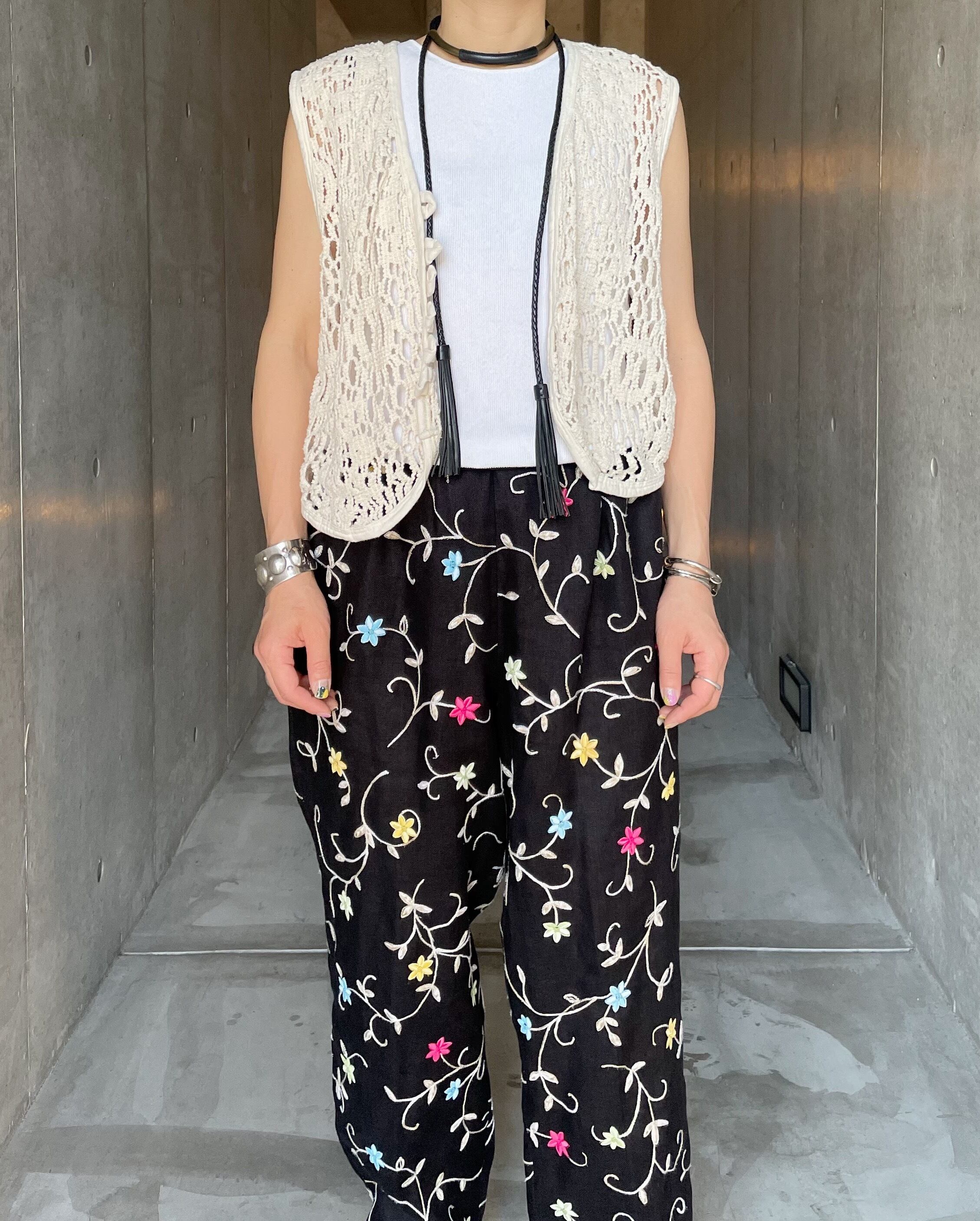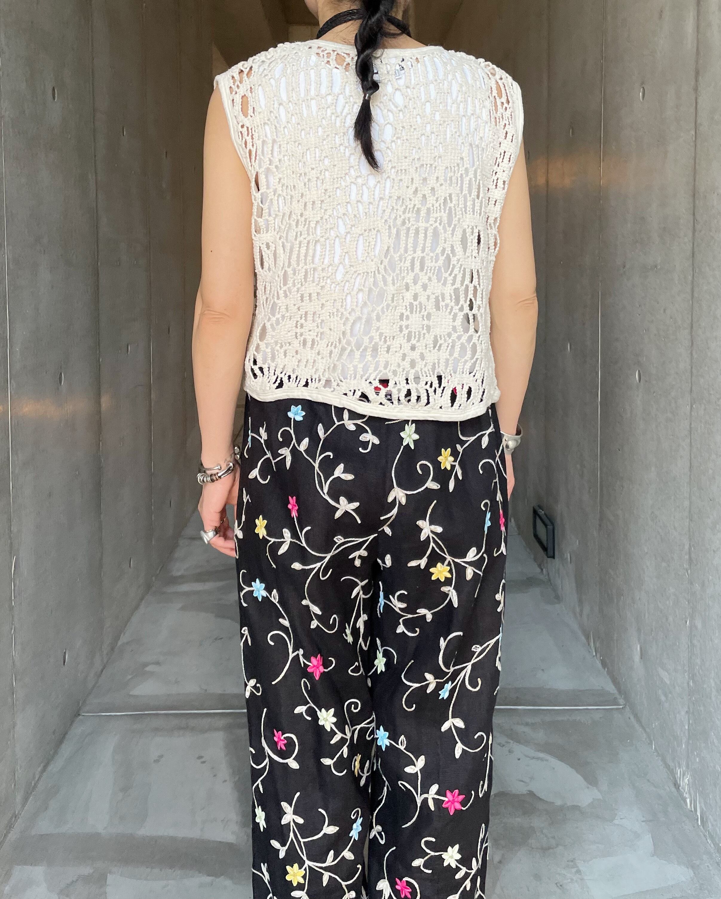 右側に施されたボタン掛けに見えるフープが、実は装飾の為だけに作られたディテール…と言う可愛さに加えてクスッと笑わせてくれるレースデザインニットベスト