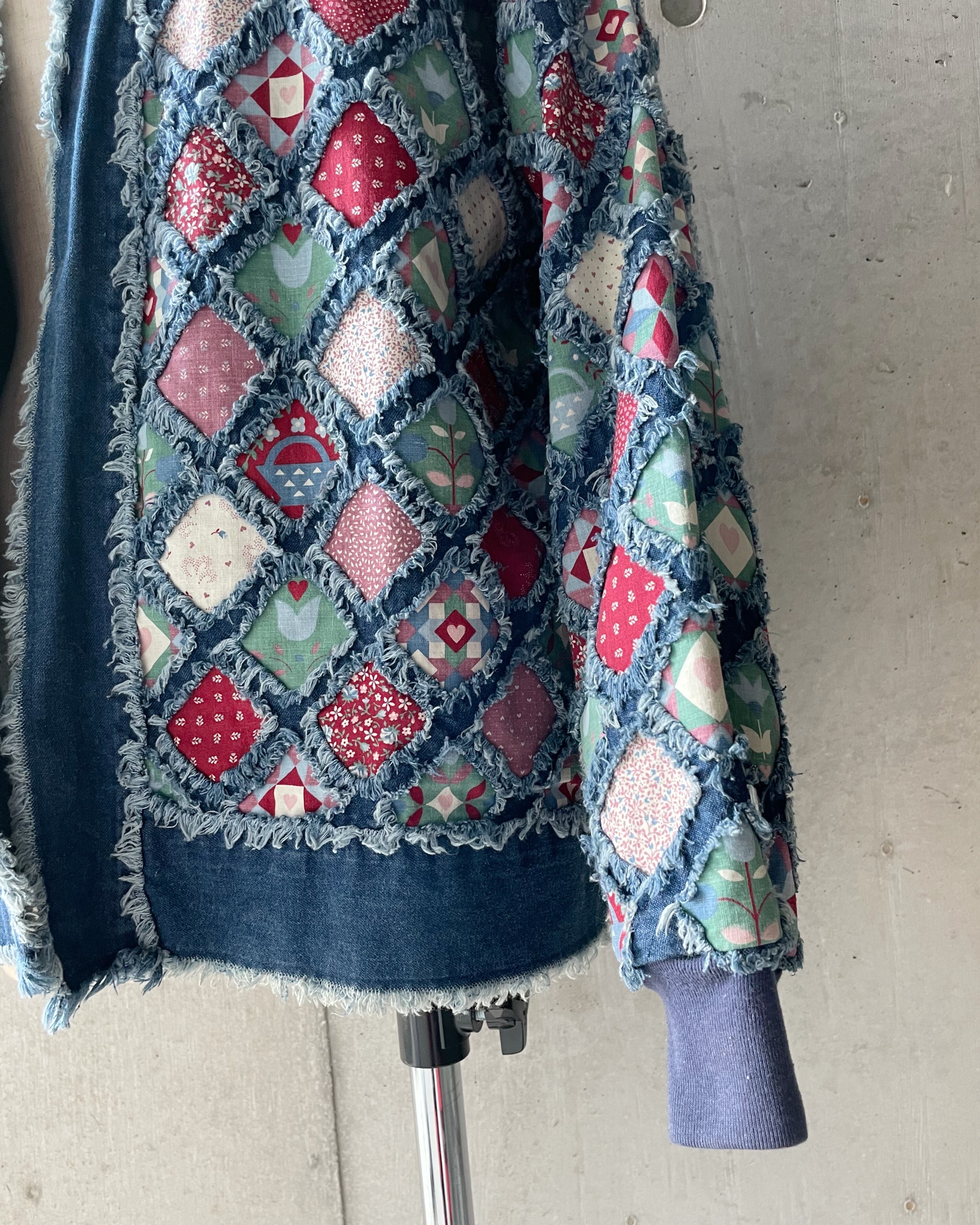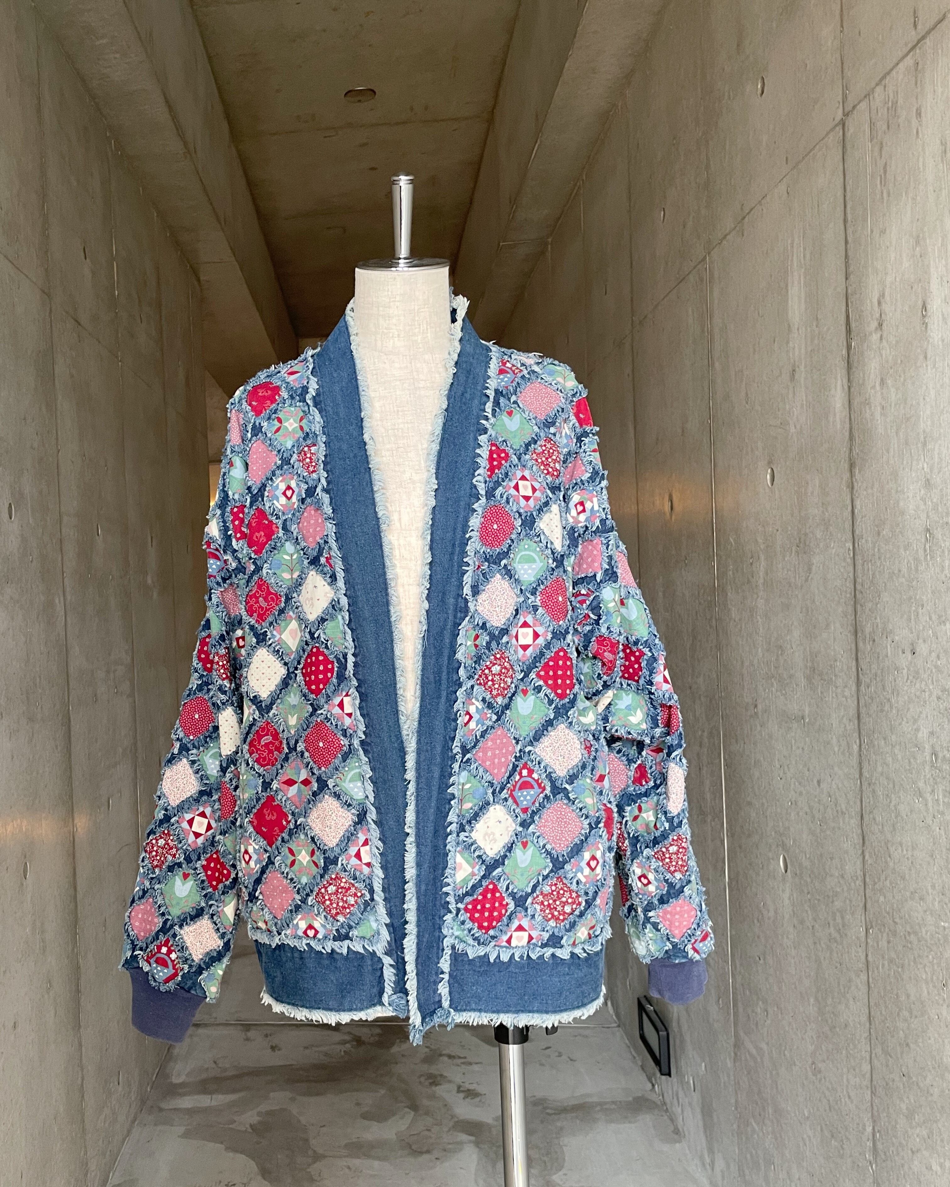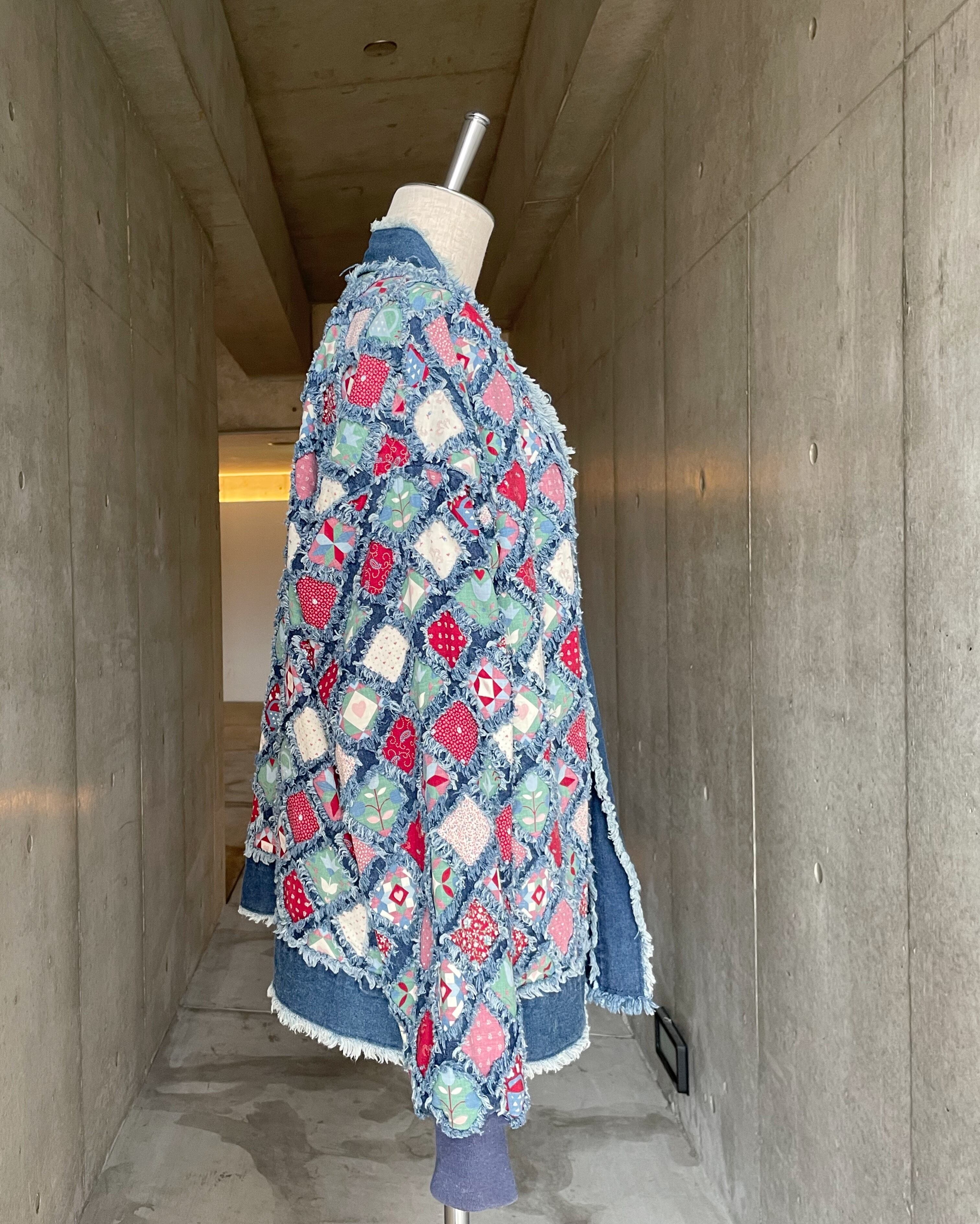 身頃全体を異なる絵柄を加えた菱形よパッチワーク調のデザイン、日本の羽織りである半纏のシルエットに袖はリブ仕様というアメリカらしいユニークなデザインジャケット