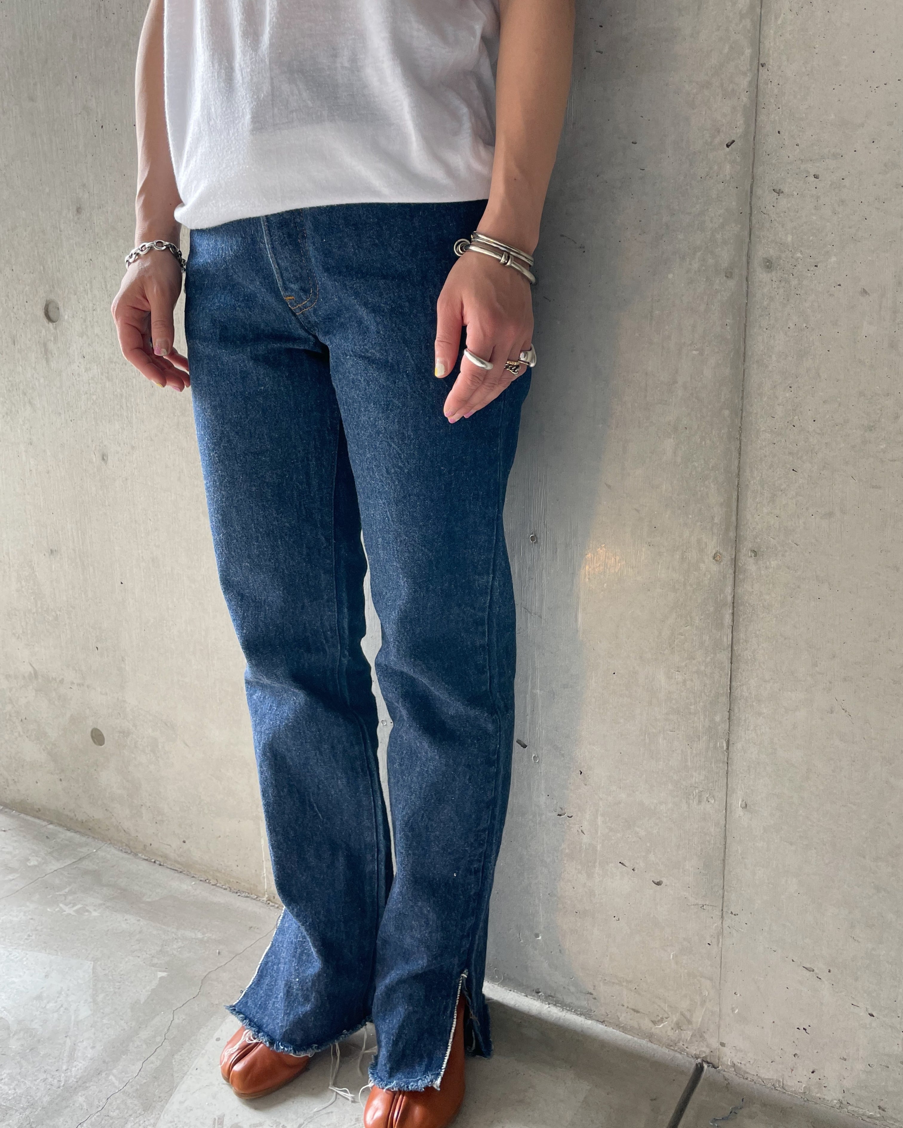 買い付け当時から後ろポケットは取り外した加工が施されていたので、加えて裾を切りっぱなし、サイドスキッパーにし、更に雰囲気のある一本に仕上げました。
