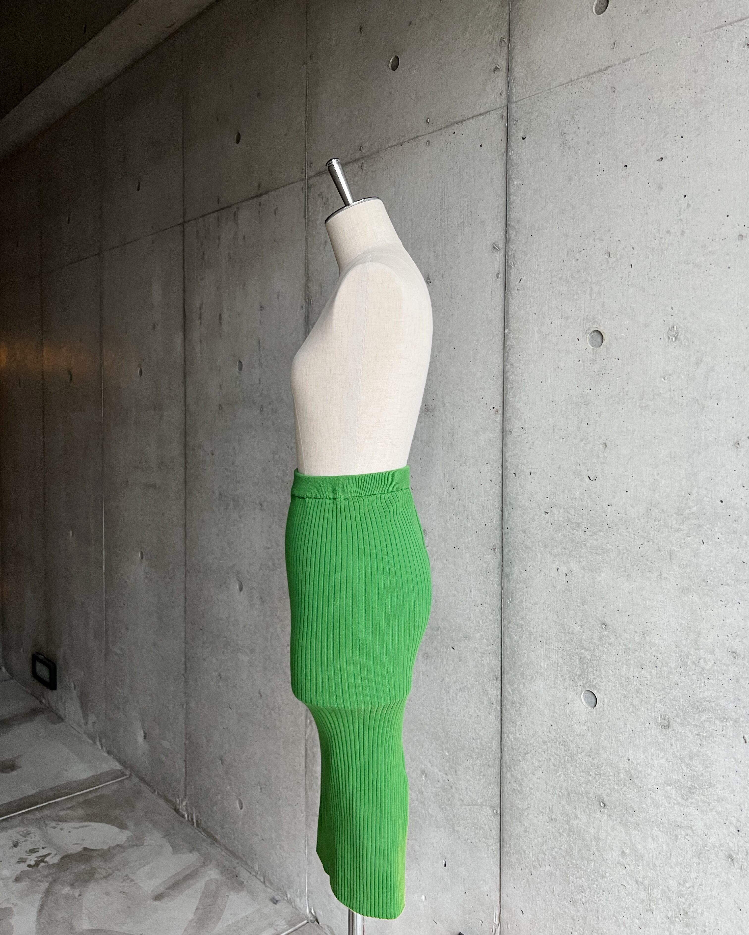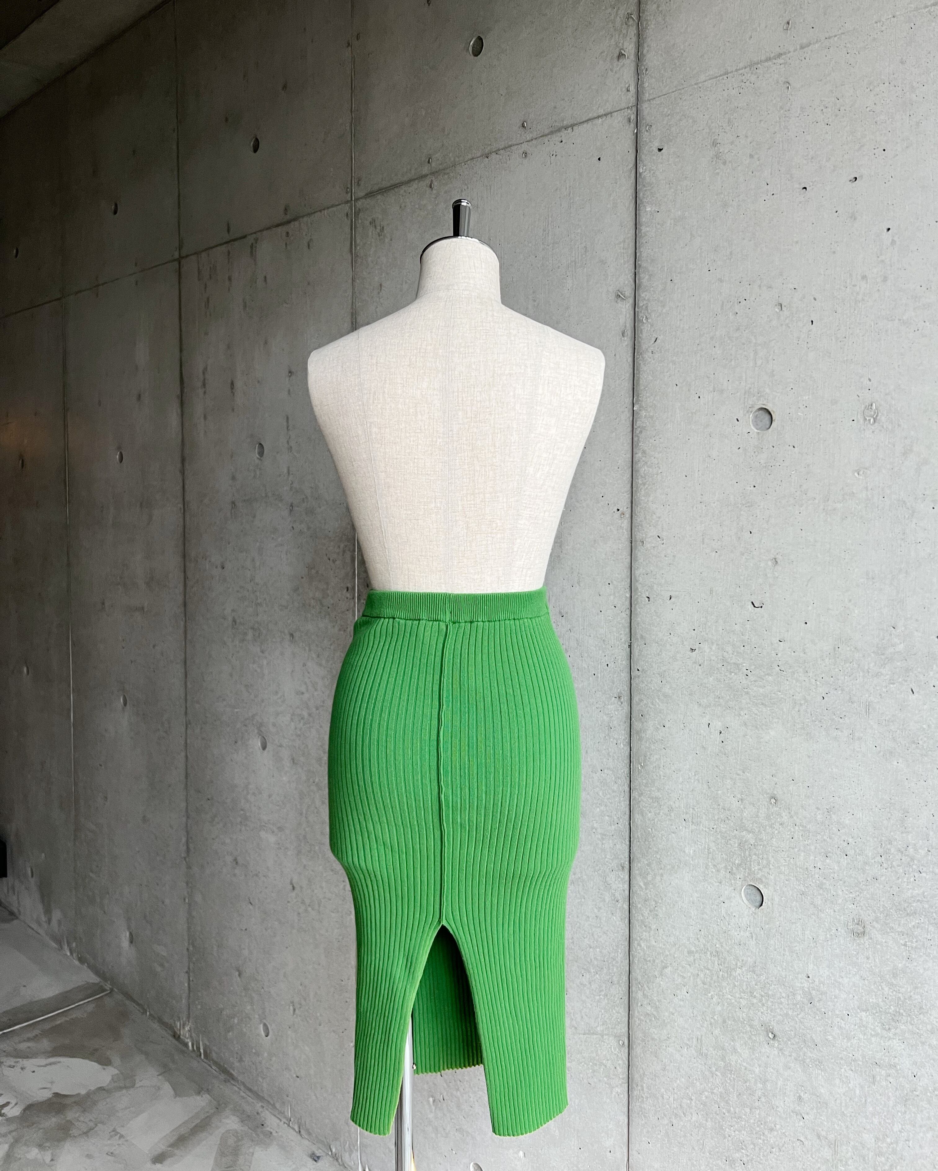鮮やかなグリーンが目を惹くリブニット。スカートでありながらトップスとしても使えるデザインから同ブランドらしさを感じさせます