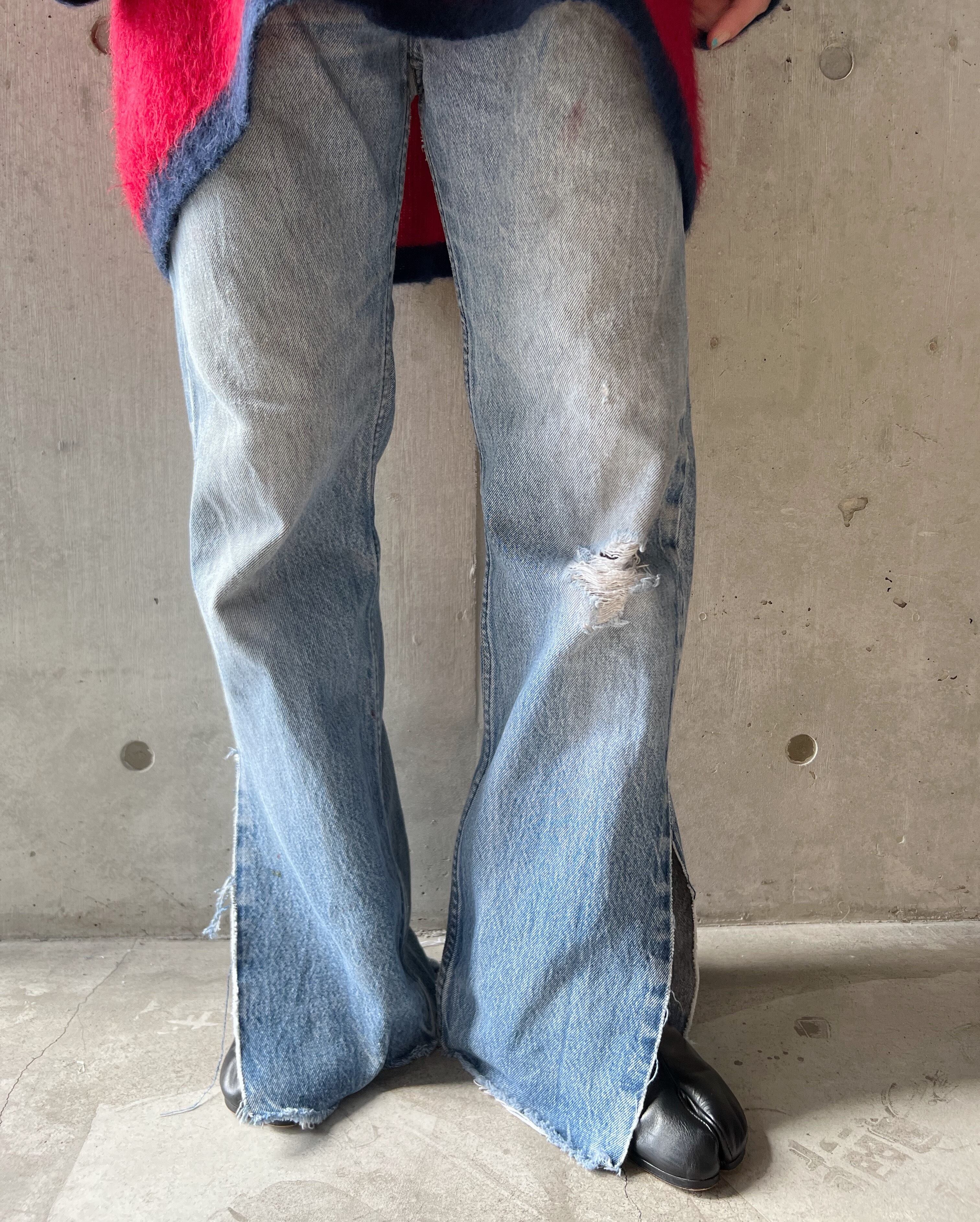 サイドを切り開き、フレアシルエットに仕上げる事でTHEデニムなシルエットである501がフレアになりまた違った表情を演出。