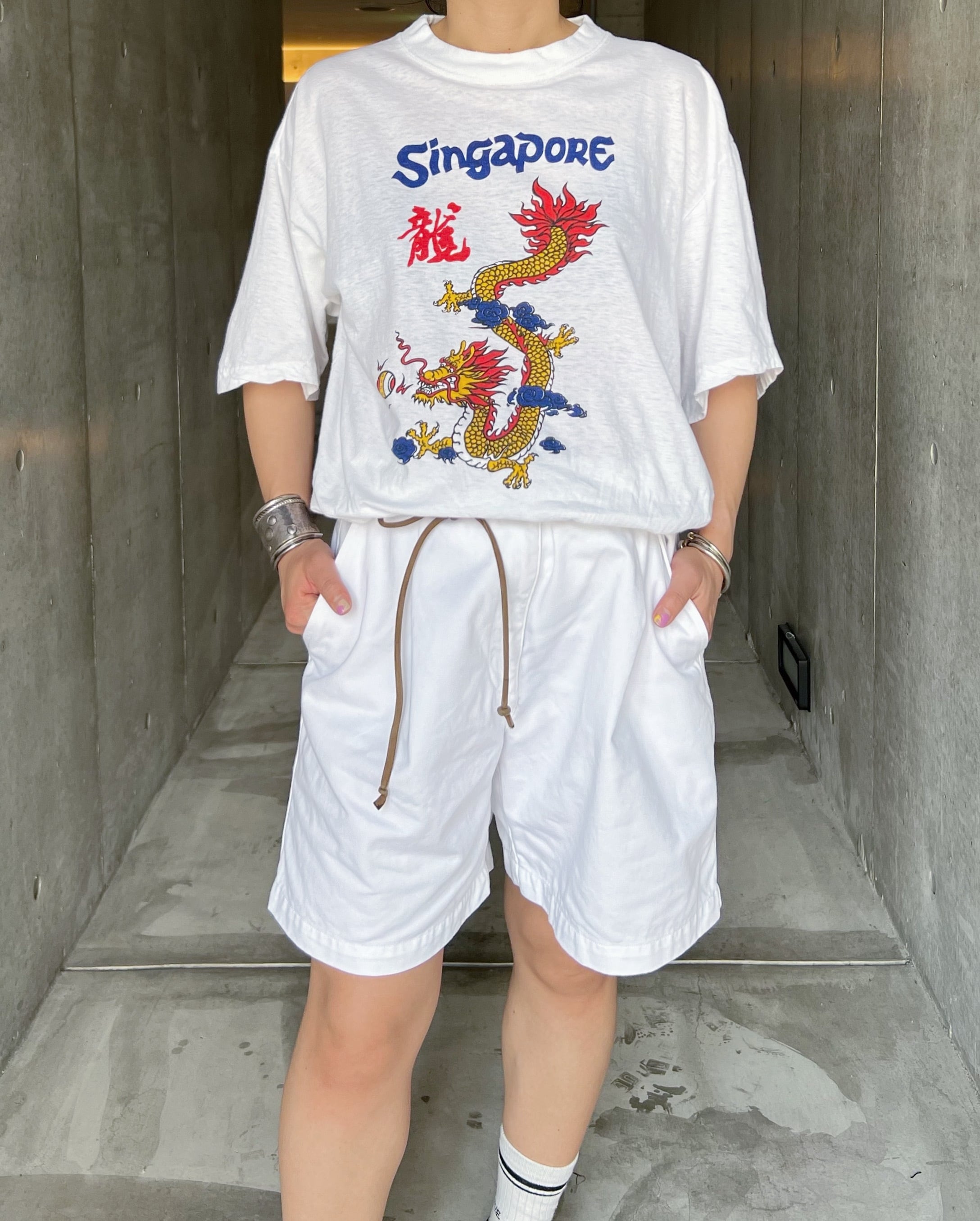 オリエンタルな雰囲気漂う配色で描かれた少しマヌケ面な龍が程よいアクセントとなったスーベニア(お土産)Tシャツ。染み込みプリントならではの独特なフェード感も相まってプリントのインパクトに拍車が掛かっています。