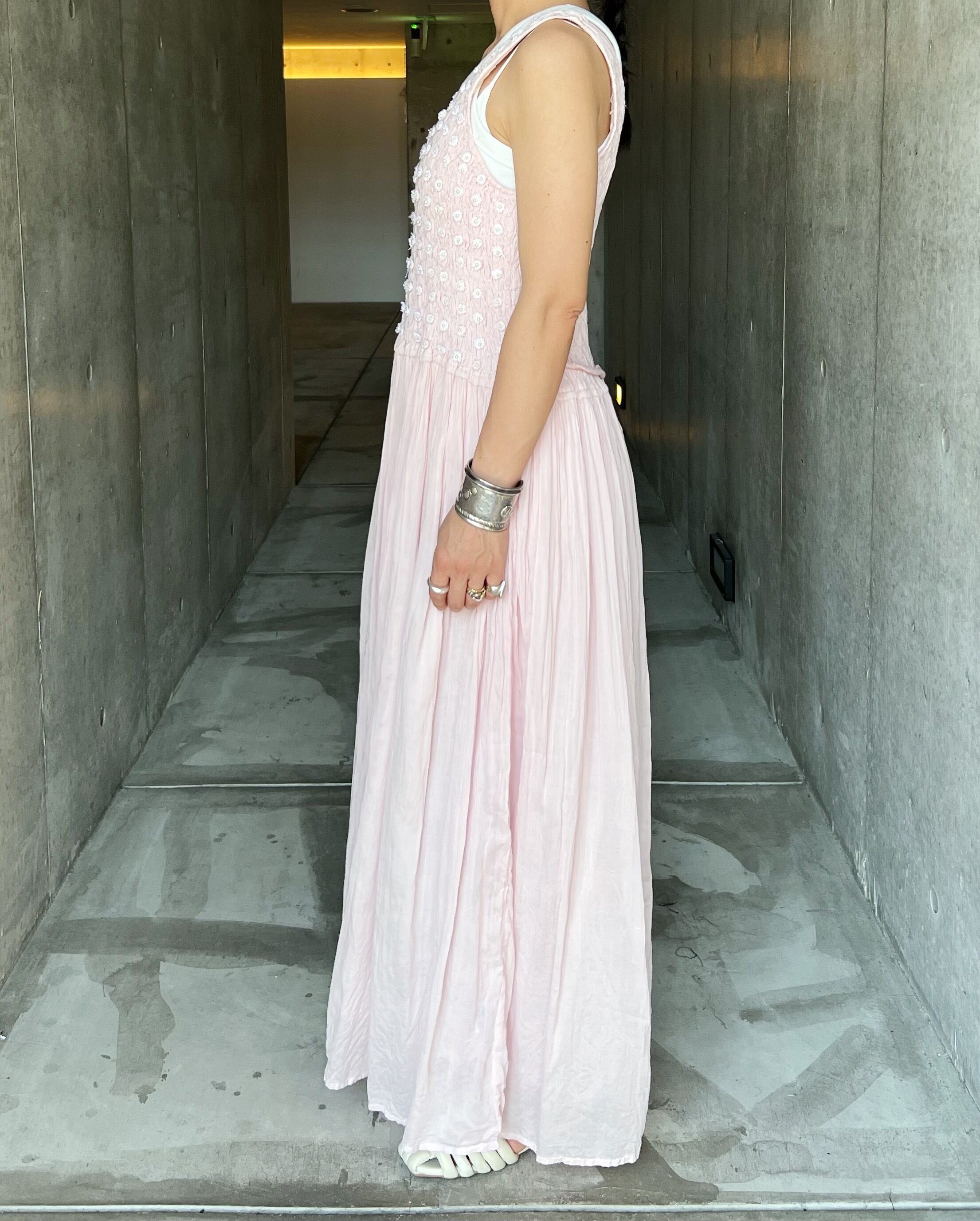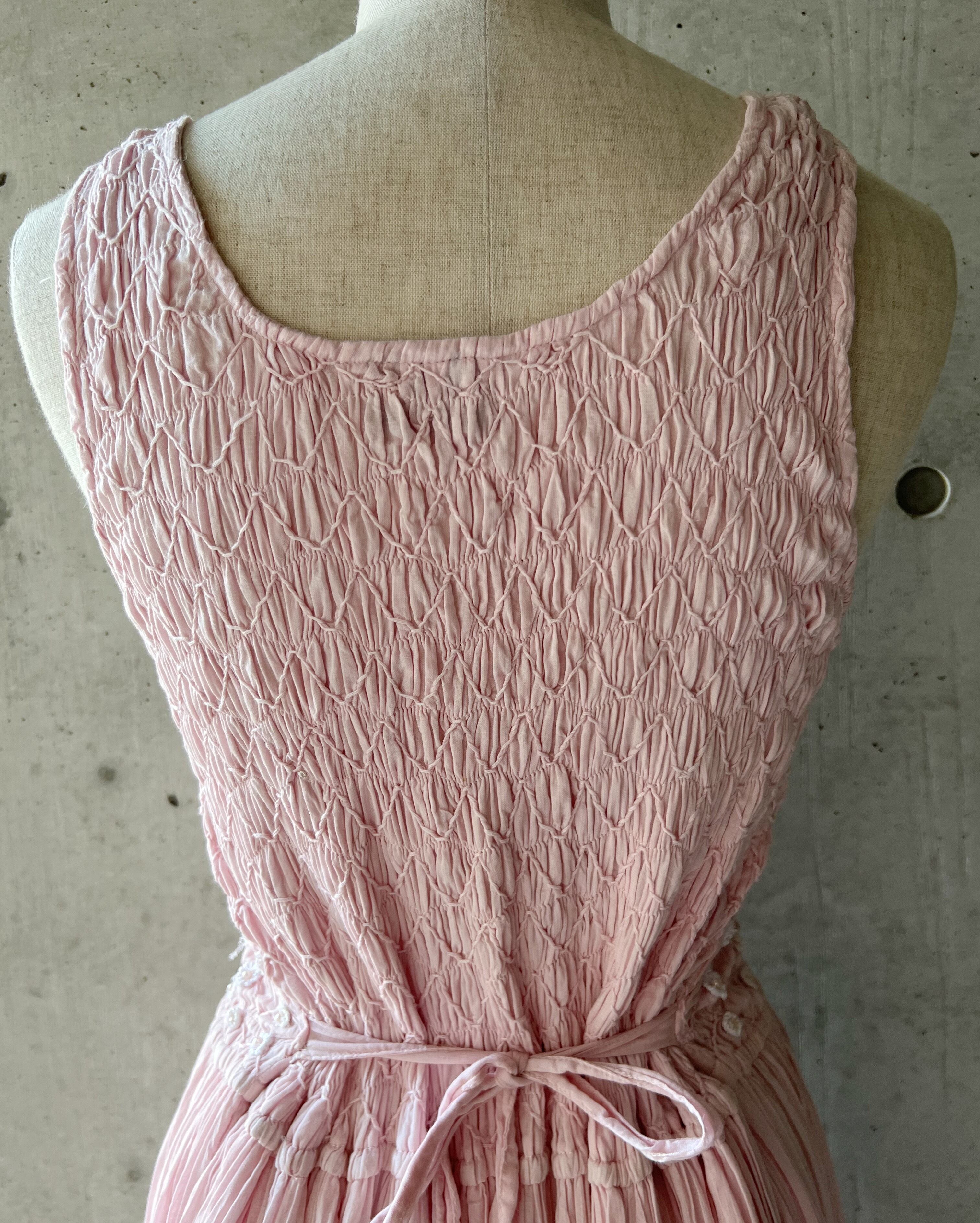 淡いピンク色に合わせた肌触りの良い柔らかいコットンが着心地の優しいプリーツドレス