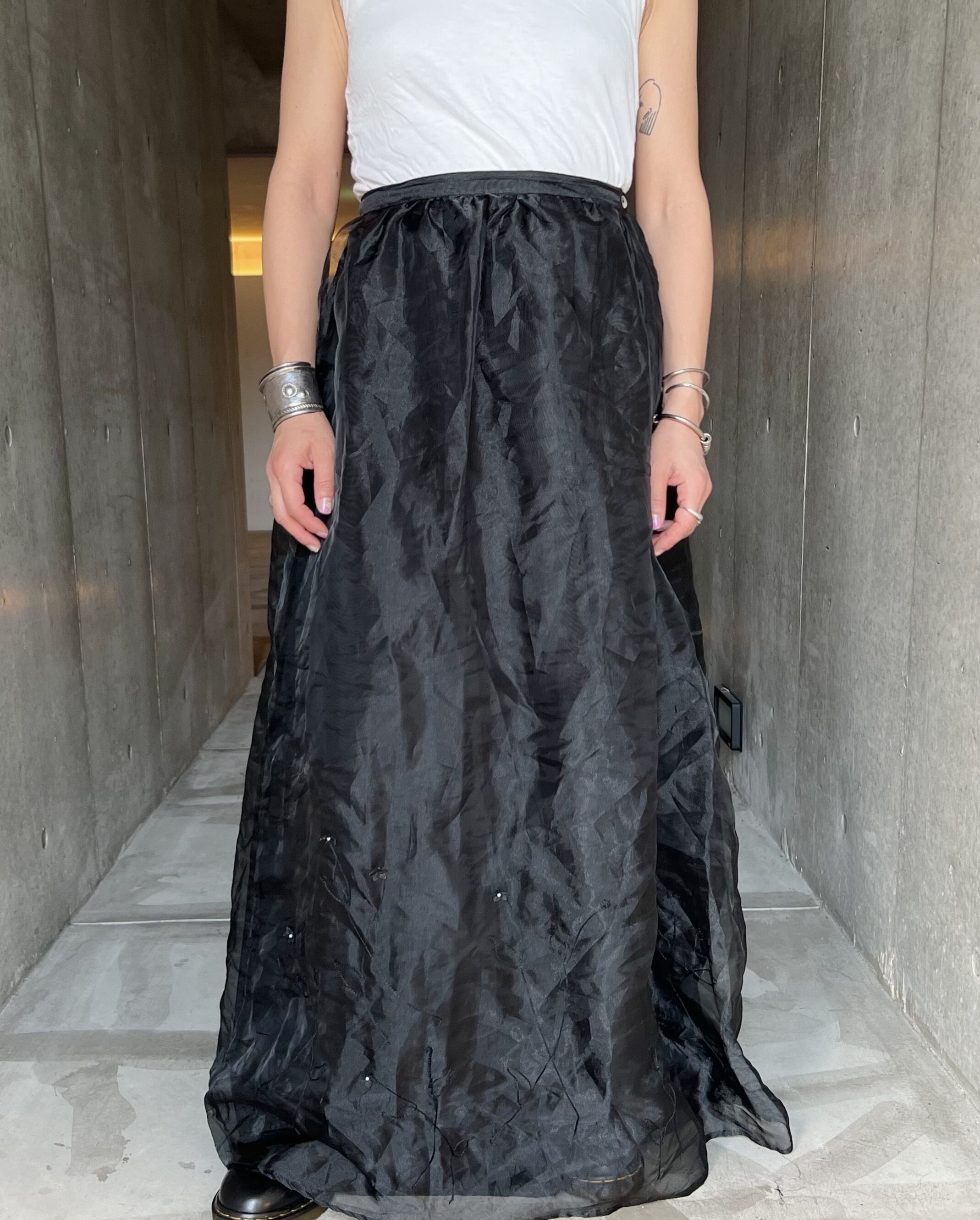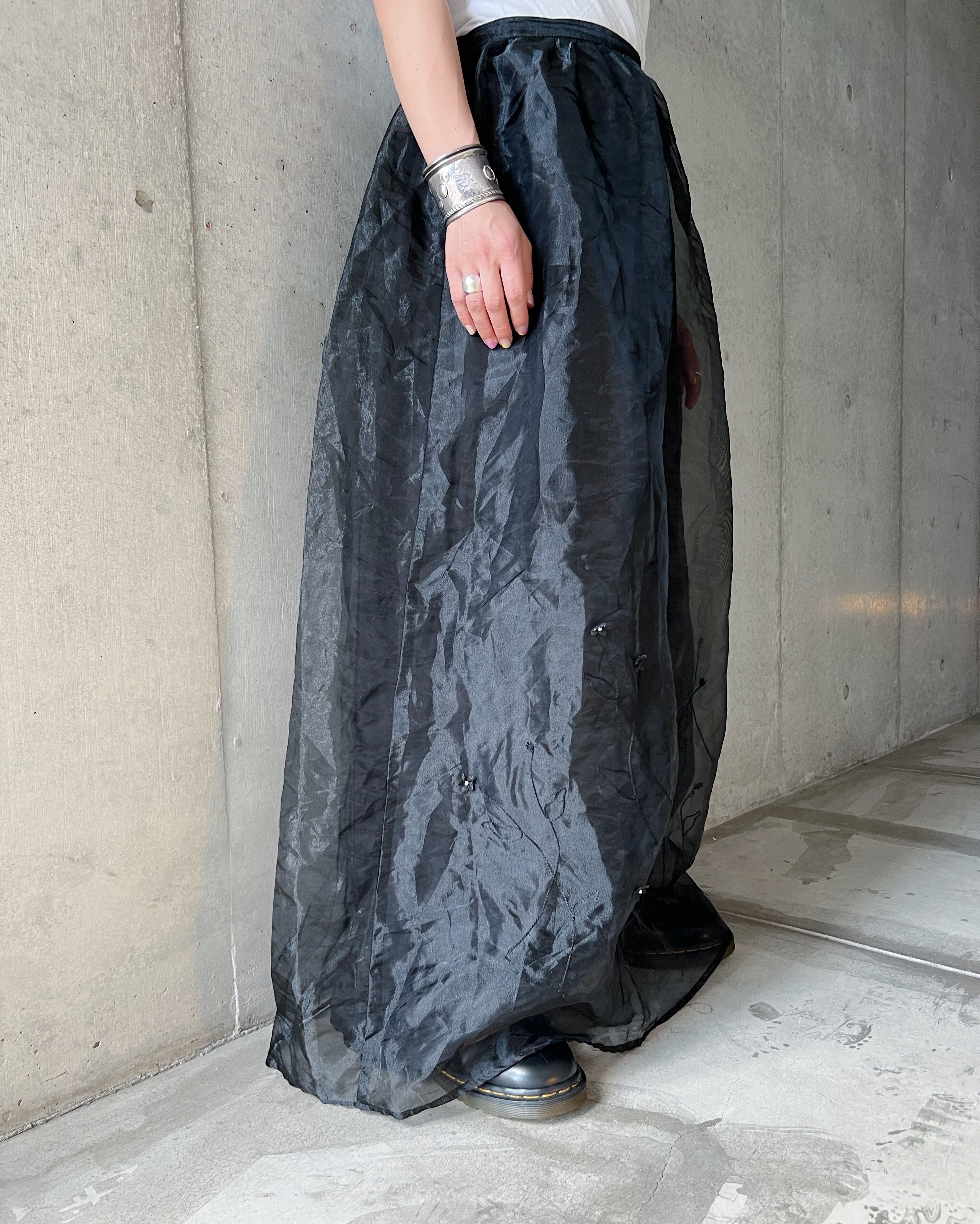 裏地が付いているので暑い季節は一枚で。涼しい季節や寒い季節にはデニムの上からレイヤードで。と、通年使えるチュールスカート
