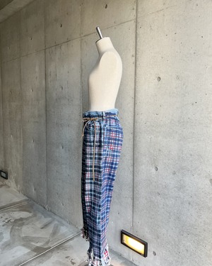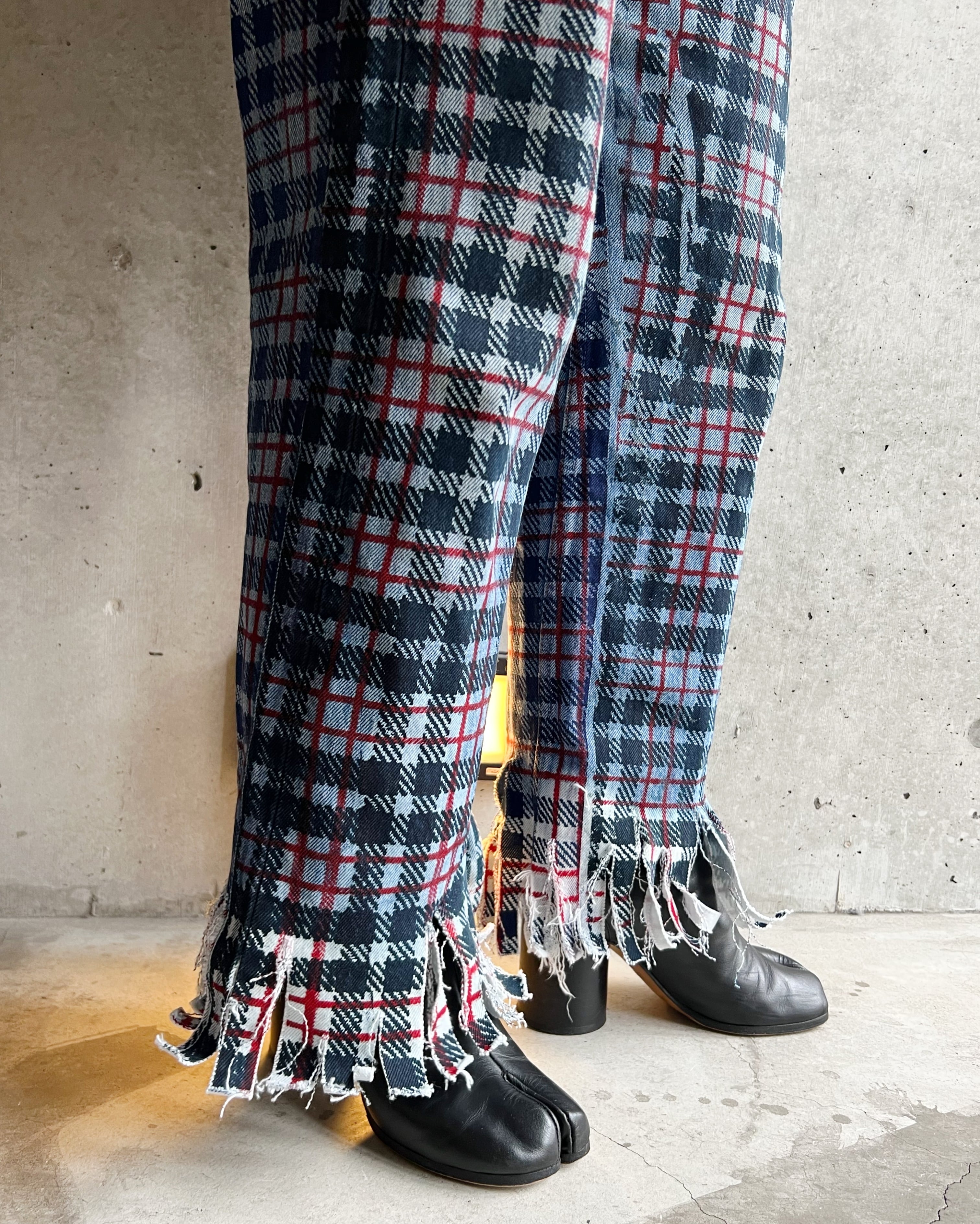 ベースに使っているLevi's 501の履き込まれた風合いにタータンチェックをシルクスクリーンでプリントを施された同モデル