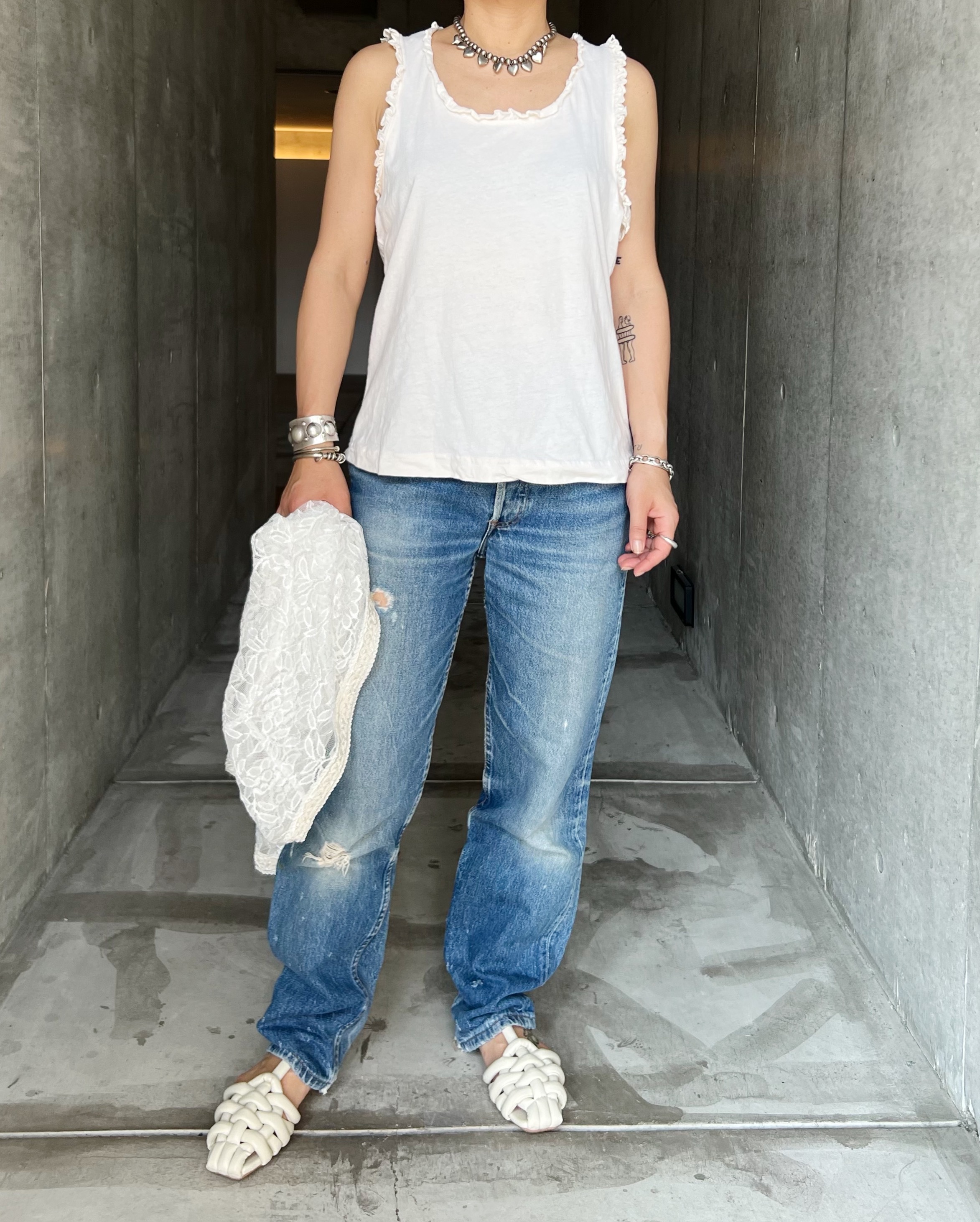 夏場はデニムにサンダルで合わせ、涼しい季節には上記のように長袖とのレイヤードで楽しんで