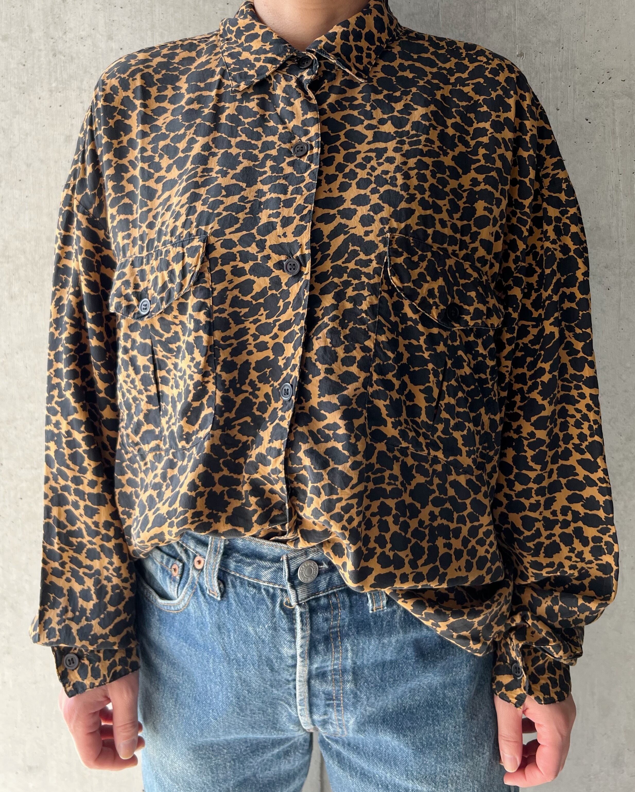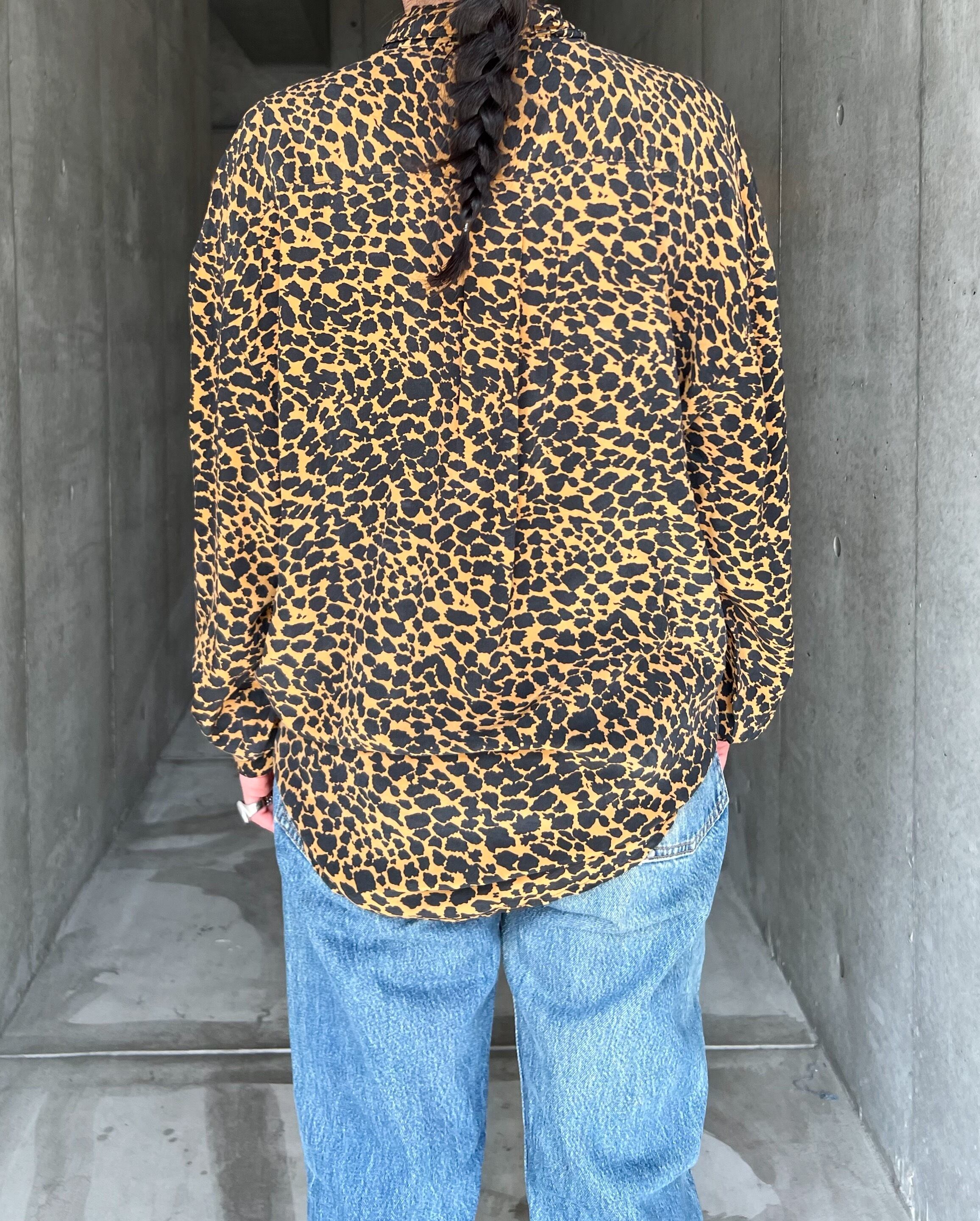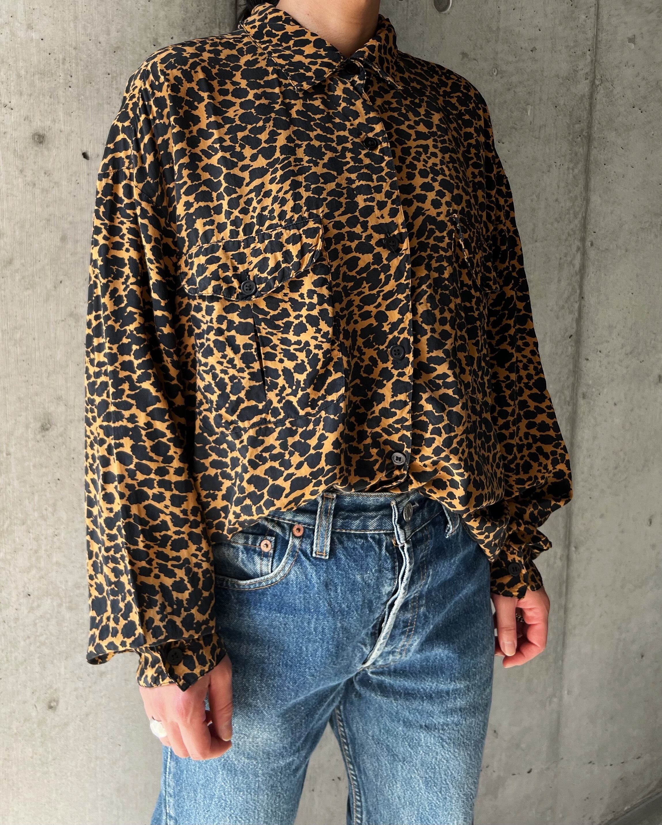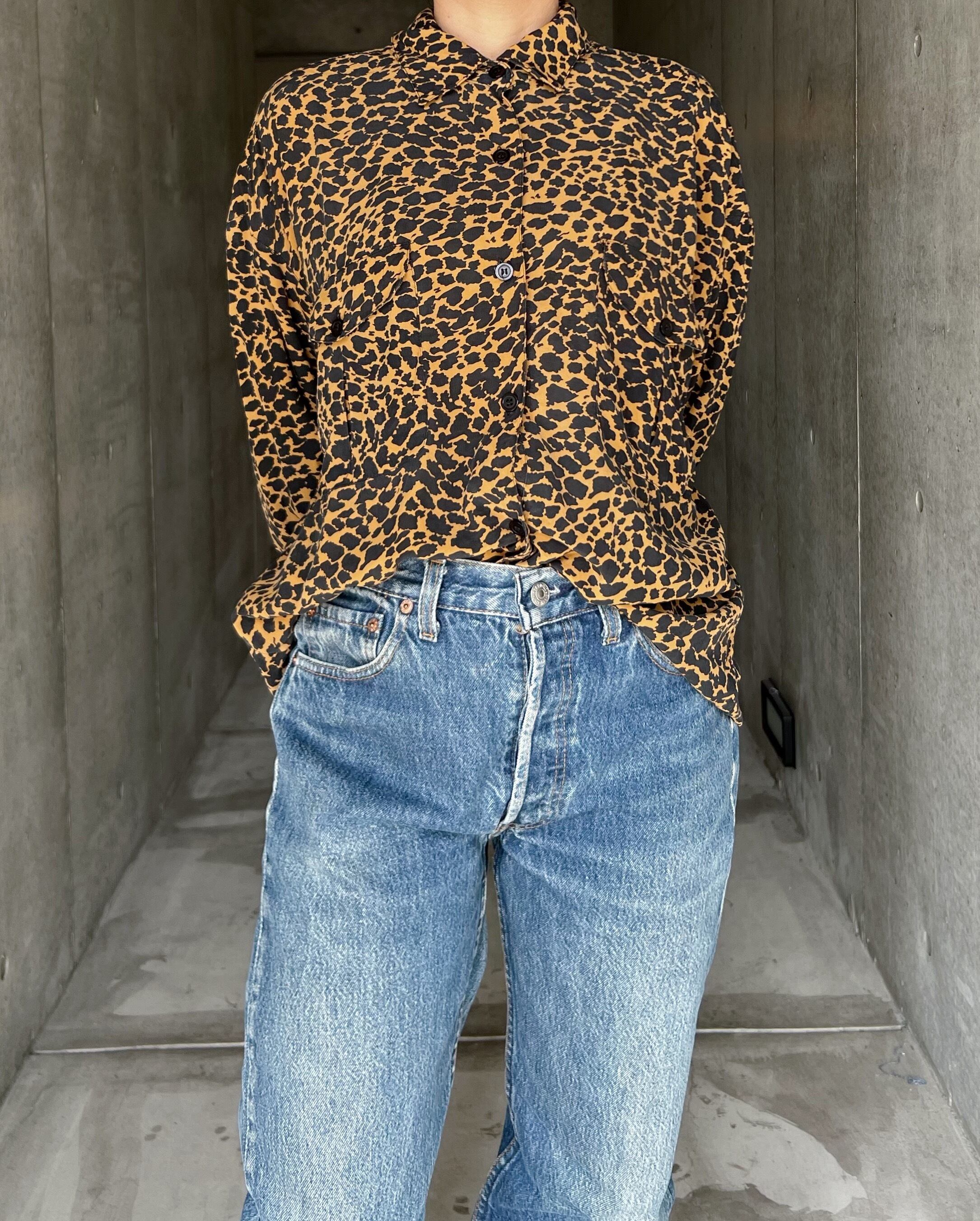 80〜90年代特有の適度な厚みとハリのあるシルク素材を用い、同素材特有のツヤ感は抑えたプリントシャツ