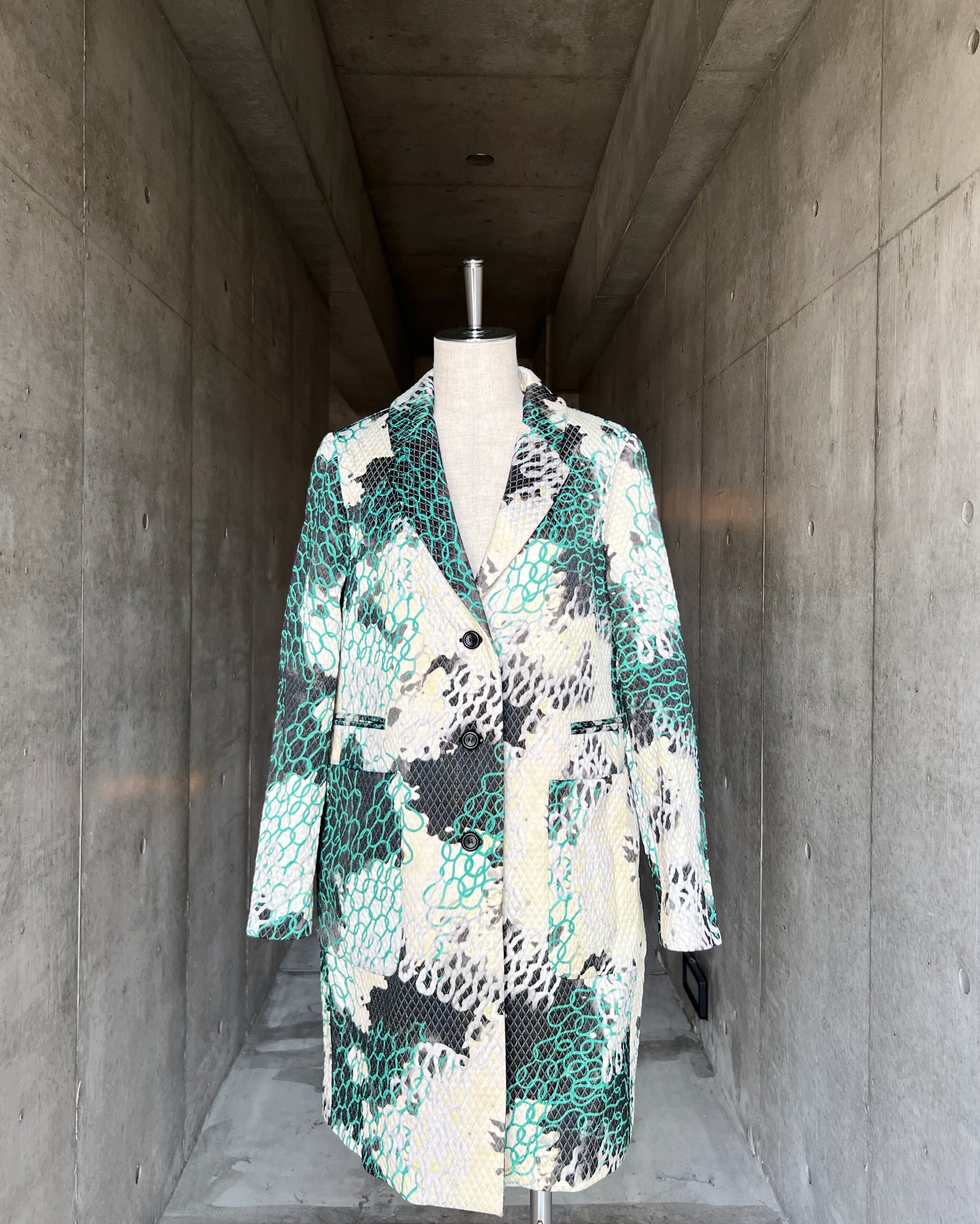 黒をベースに花のような抽象画の総柄プリントがユニーク珍しいデザインのチェスターコート