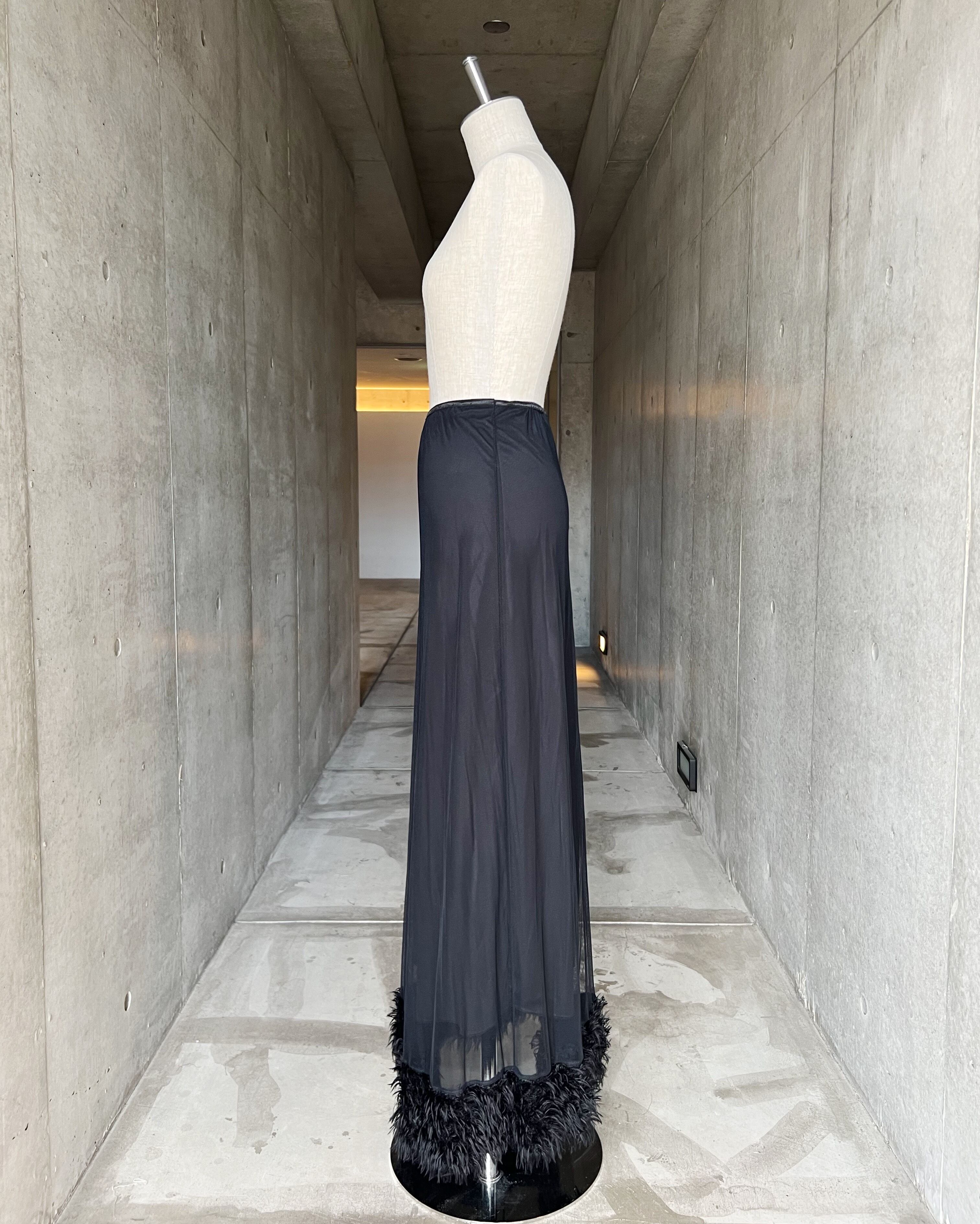 インナーの付いたシースルーの軽やかなボディに対し、裾にファーを施したユニークなバランスのロングスカート