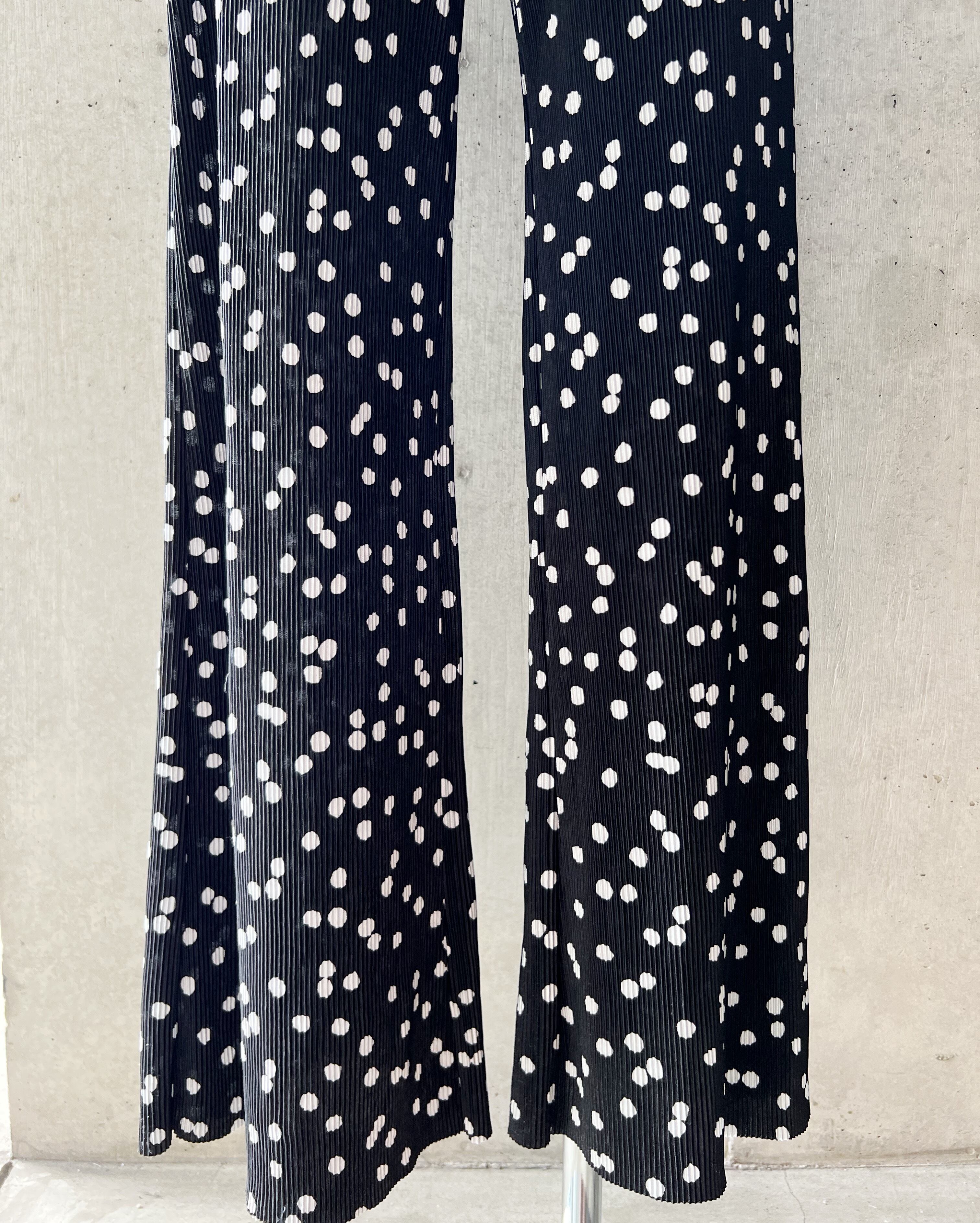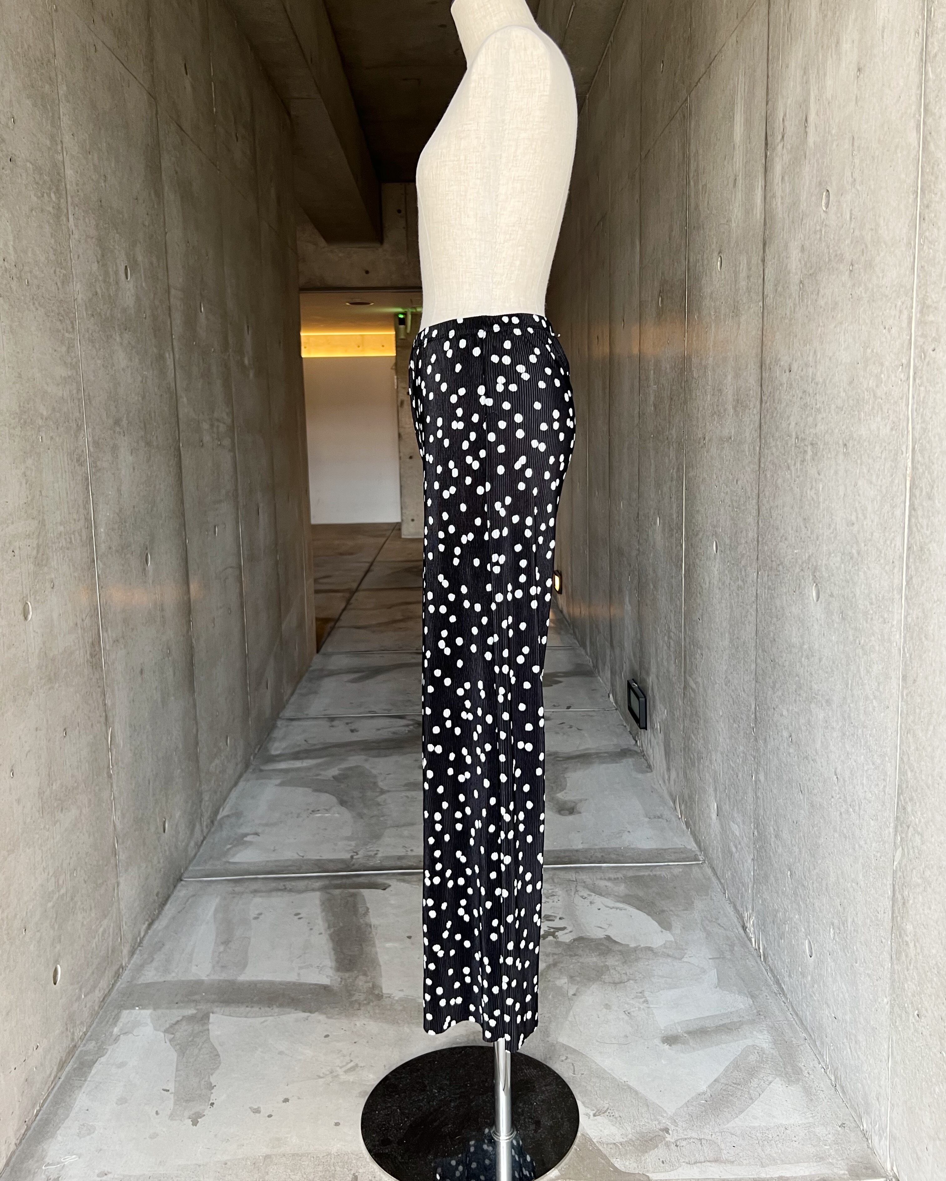 不規則に配置されたドット柄がキッチュなモードの雰囲気を漂わせるプリーツパンツ