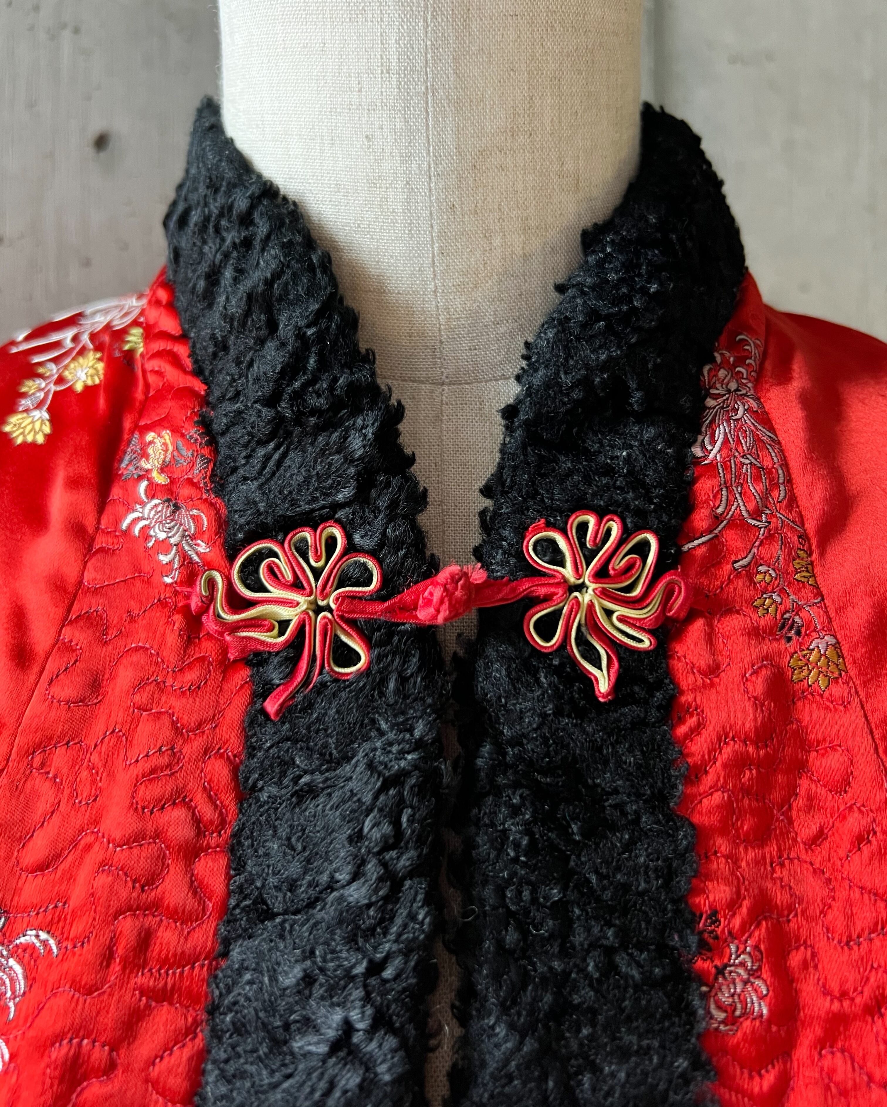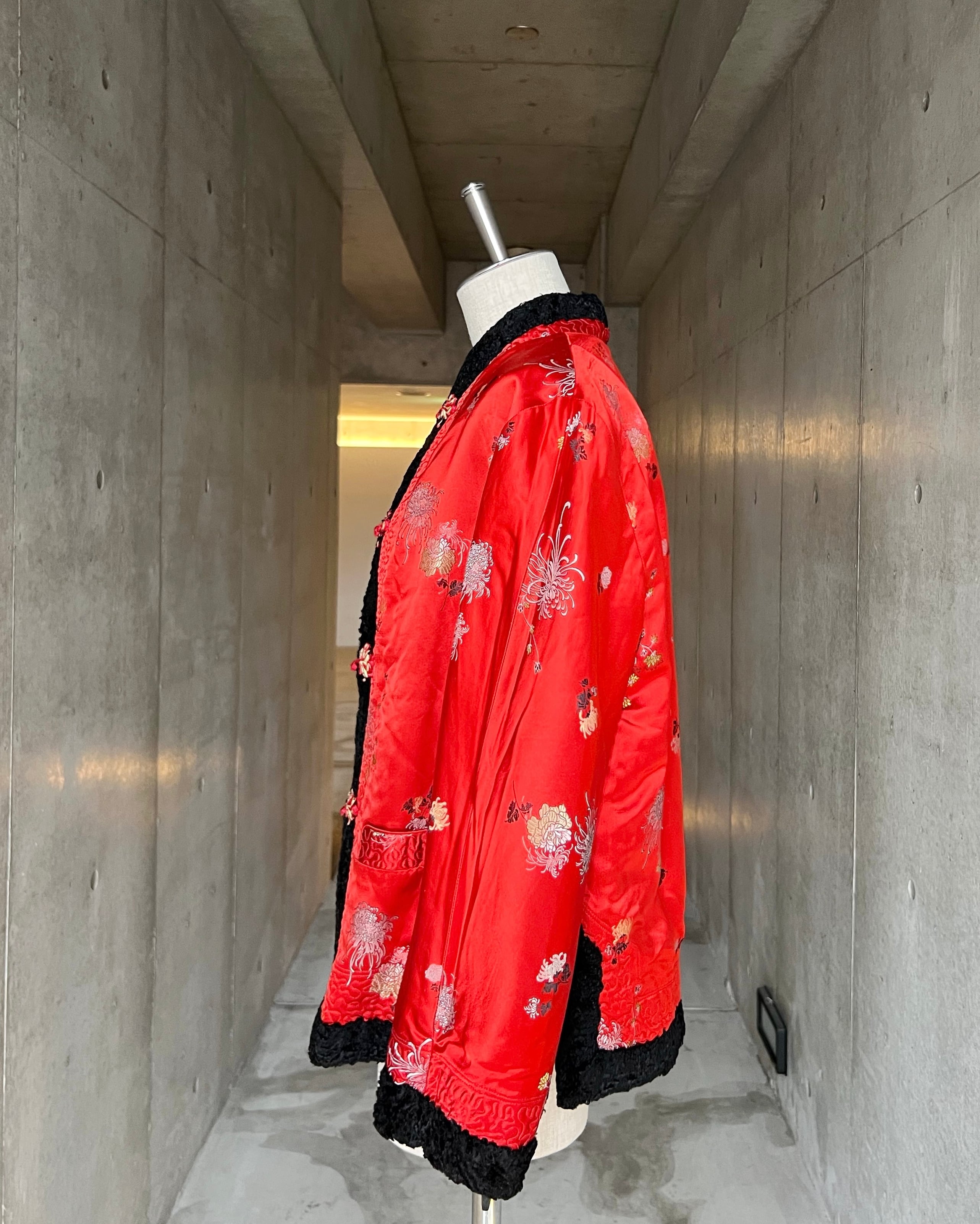 裏側がボアで仕上げられた保温性の高いマンダリンジャケット。リバーシブルで着られる仕様で両面共に適度な光沢感が有るのでどちらが内側に着ても程良いアクセントとなりそうです。
