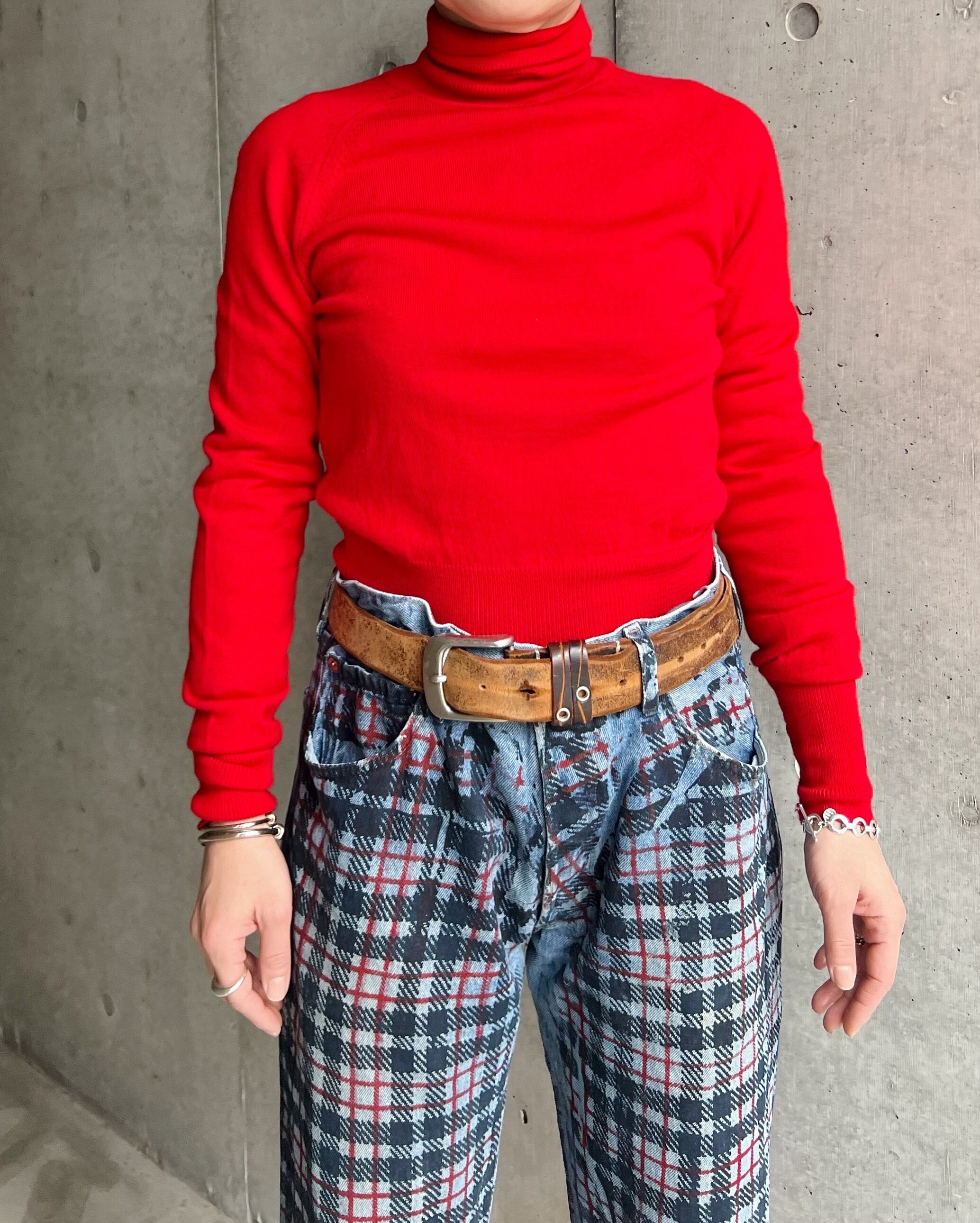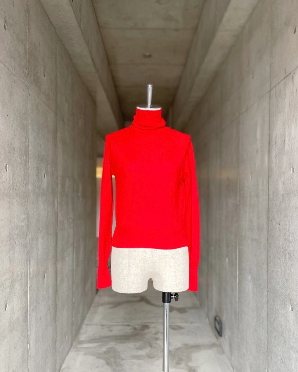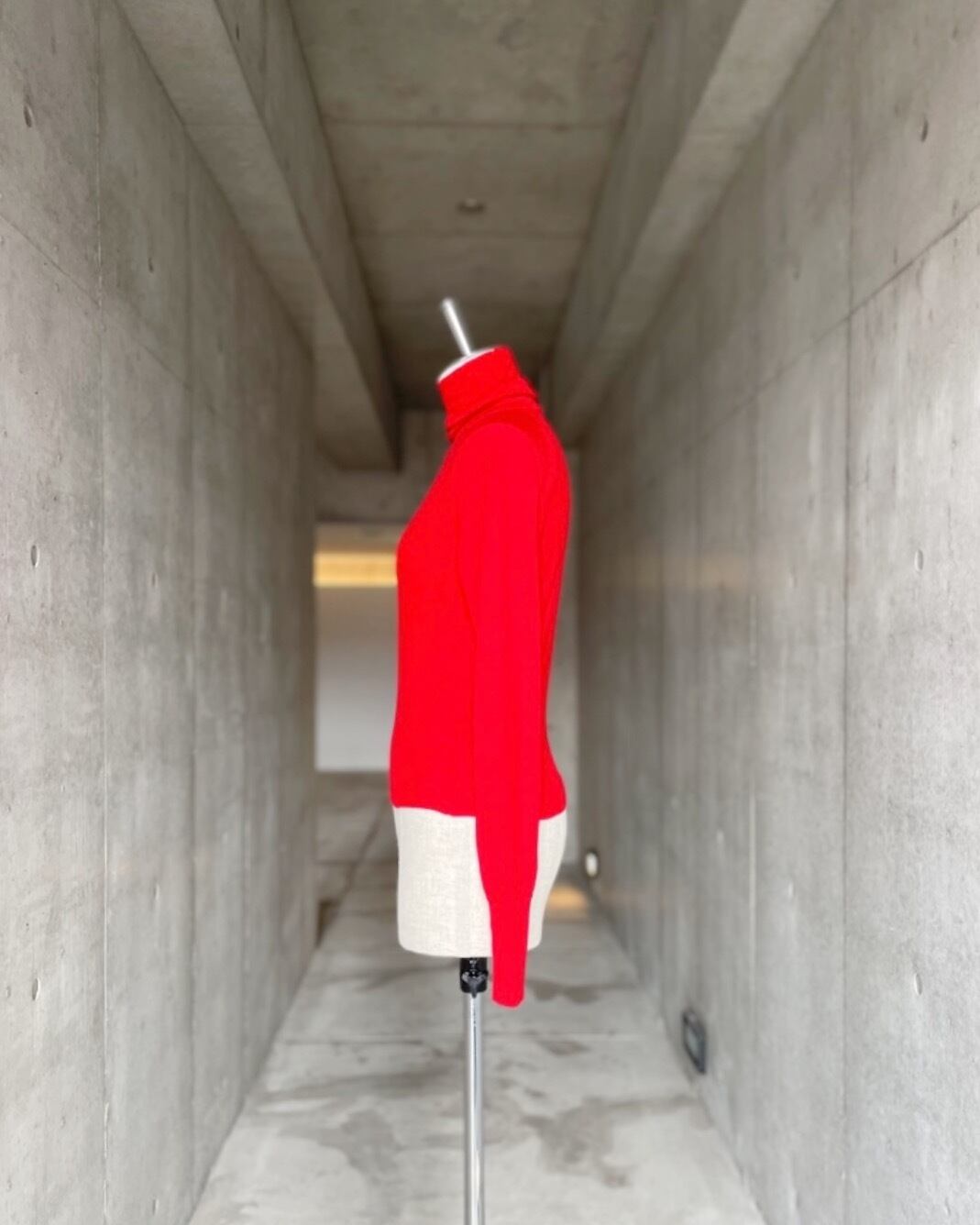ニットならではの鮮やかな赤は気分を高揚させてくれる事間違いなし。カラー物を普段着ない方にもチャレンジして欲しい一枚です