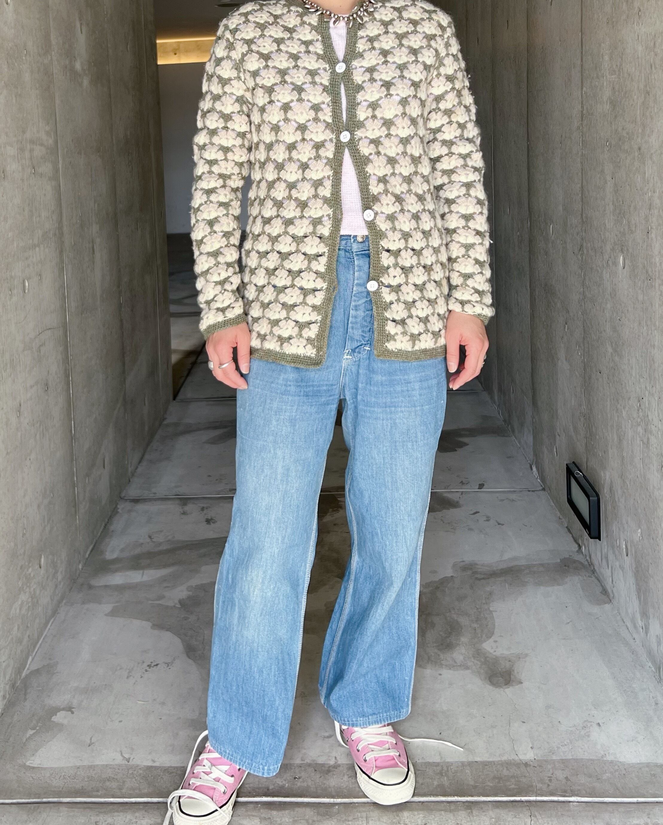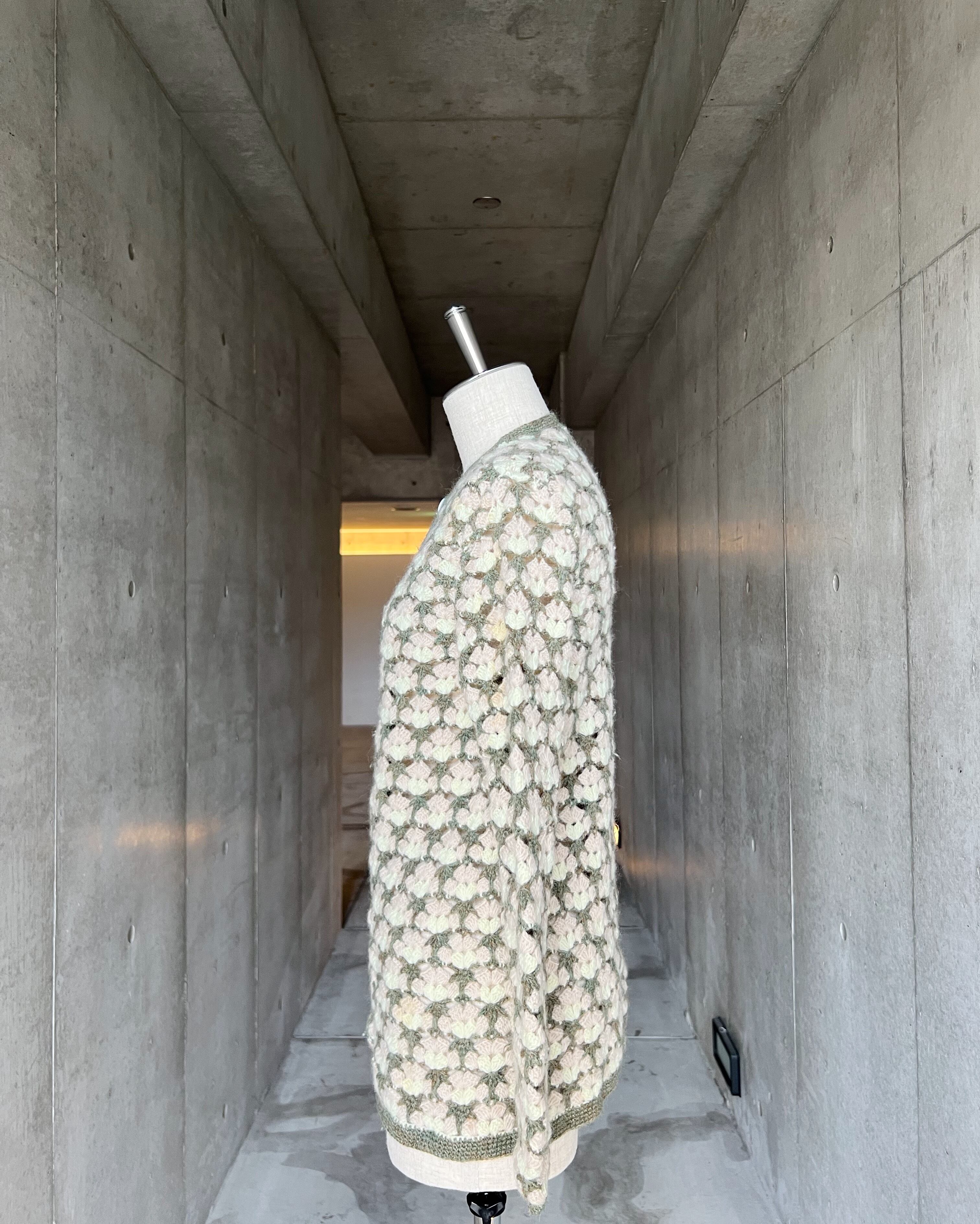 目の詰まった素材(おそらくウール100%)を用いたクロシェニット。色合いや模様のレトロな雰囲気からグラニークロシェ(おばあちゃんが着てそうなニットの意)の名前がマッチしています。ミドルゲージの適度な厚みがあるので秋にはアウターとして。真冬にはインナー使いで差し色としても重宝しそう