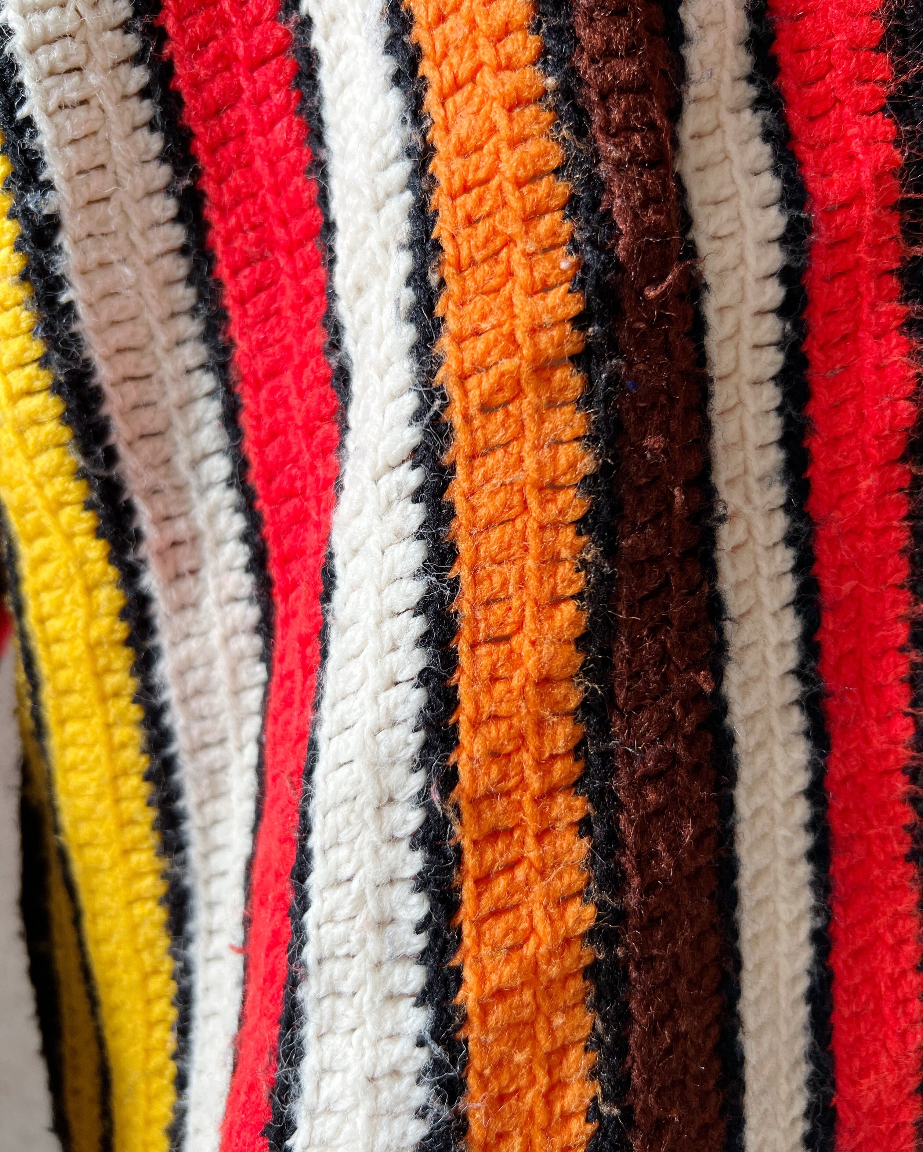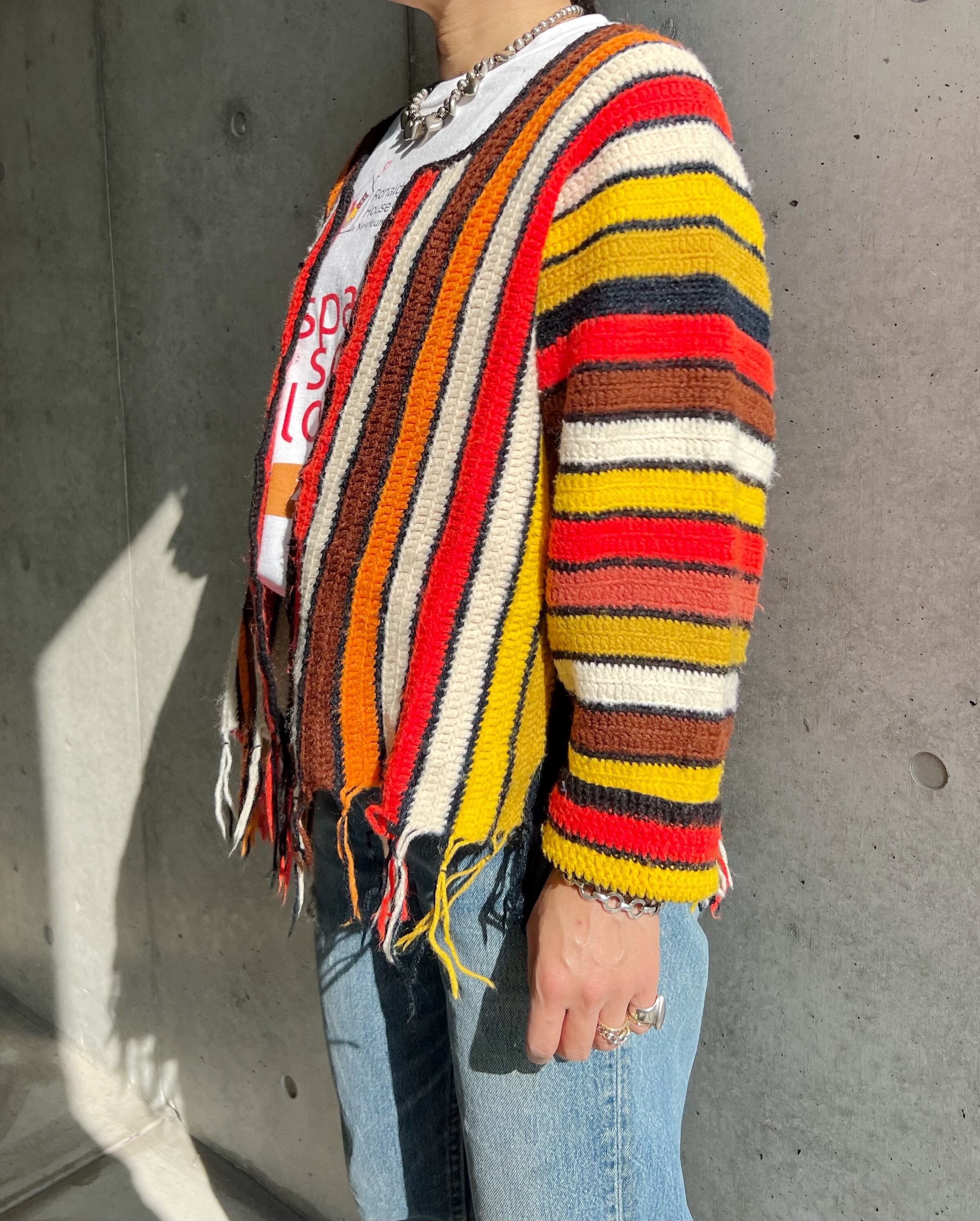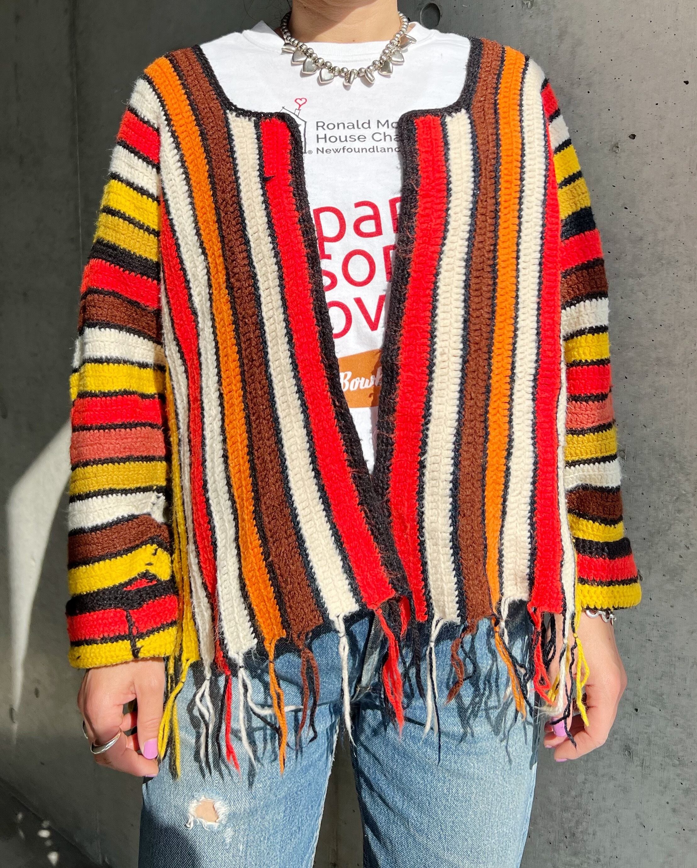 レトロな雰囲気漂うファブリックを用い裾はフリンジのようにデザインされたユニークなニットケープ