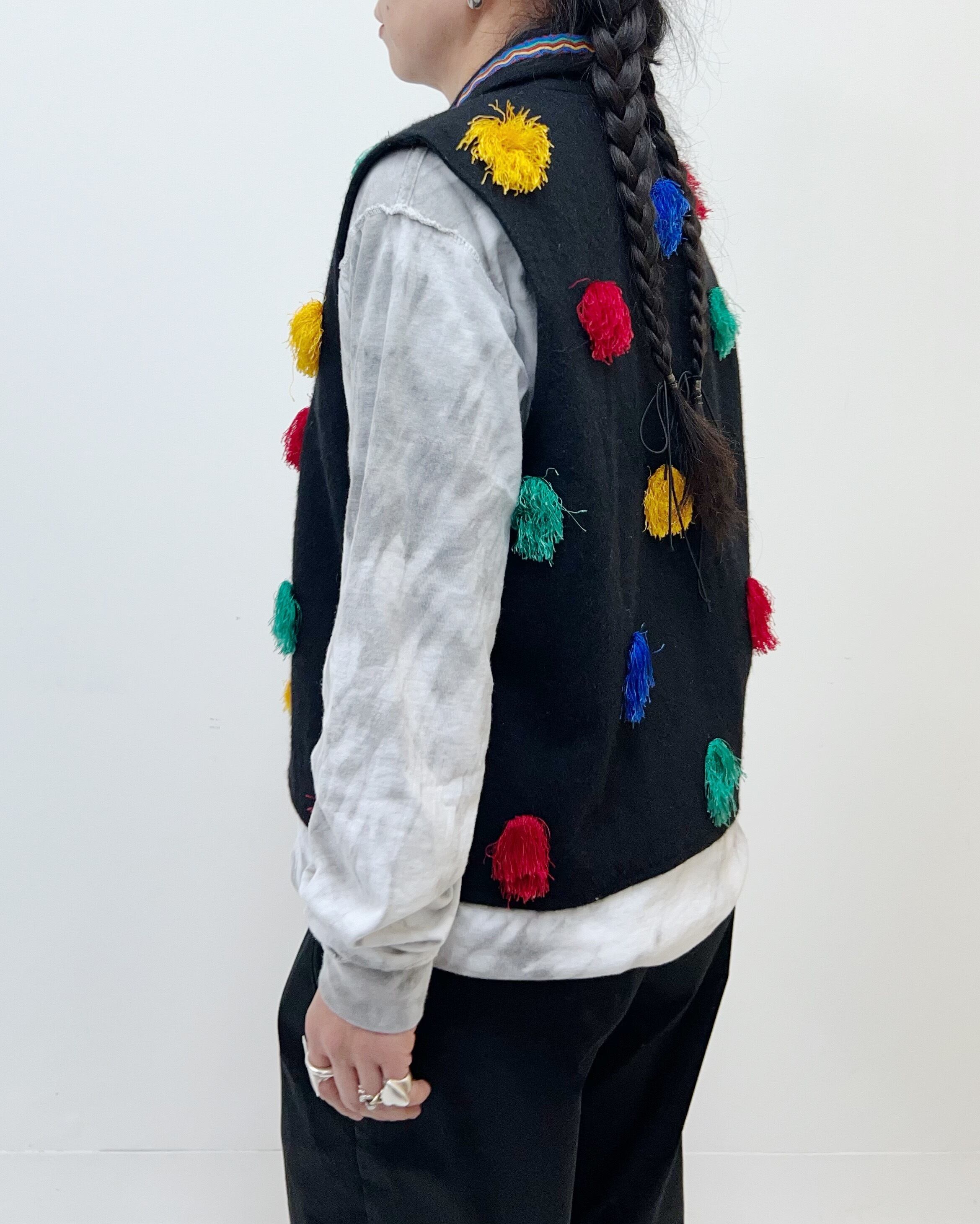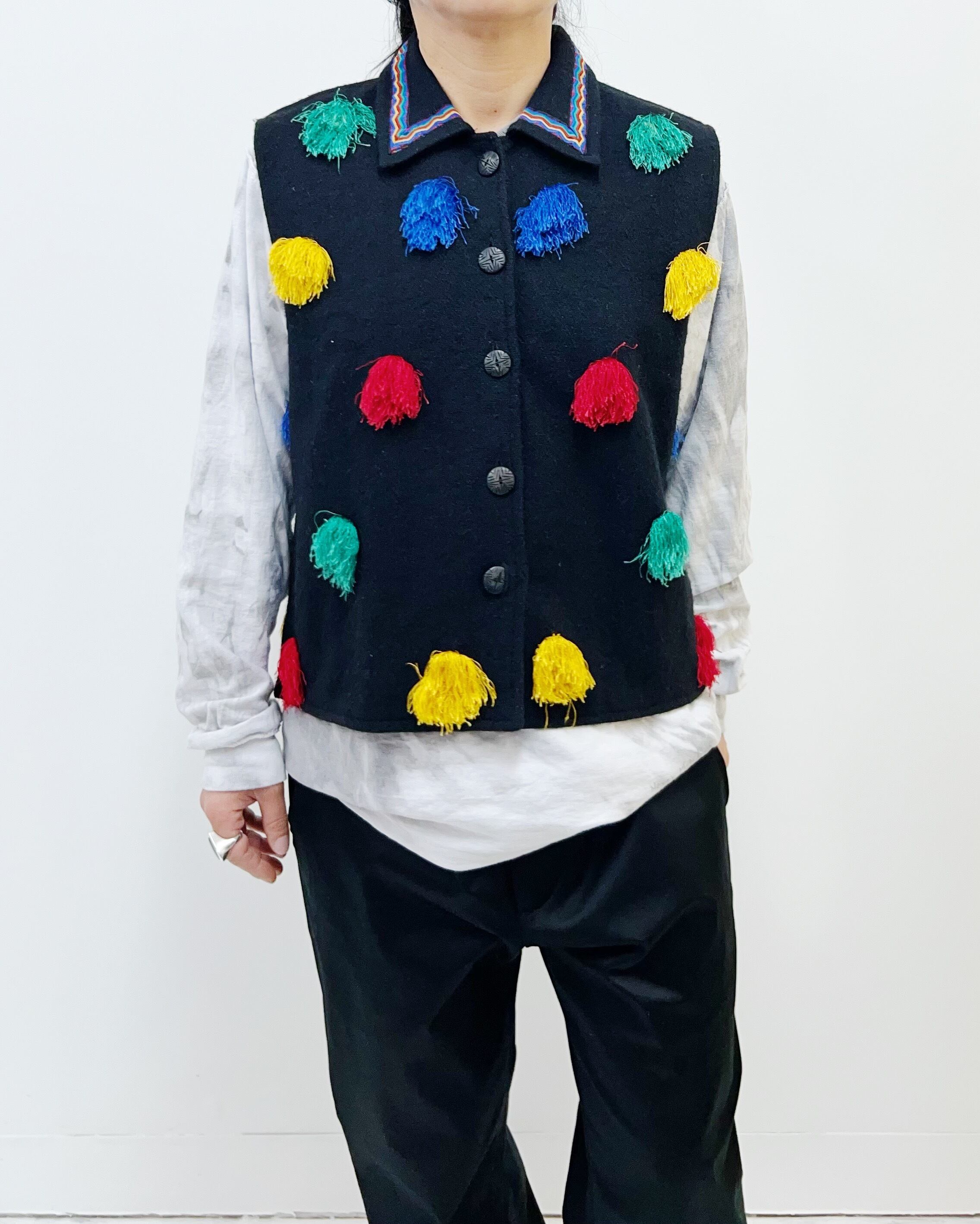 ポンポンのような装飾が均一にデザインされたユニークなメルトンウールベスト