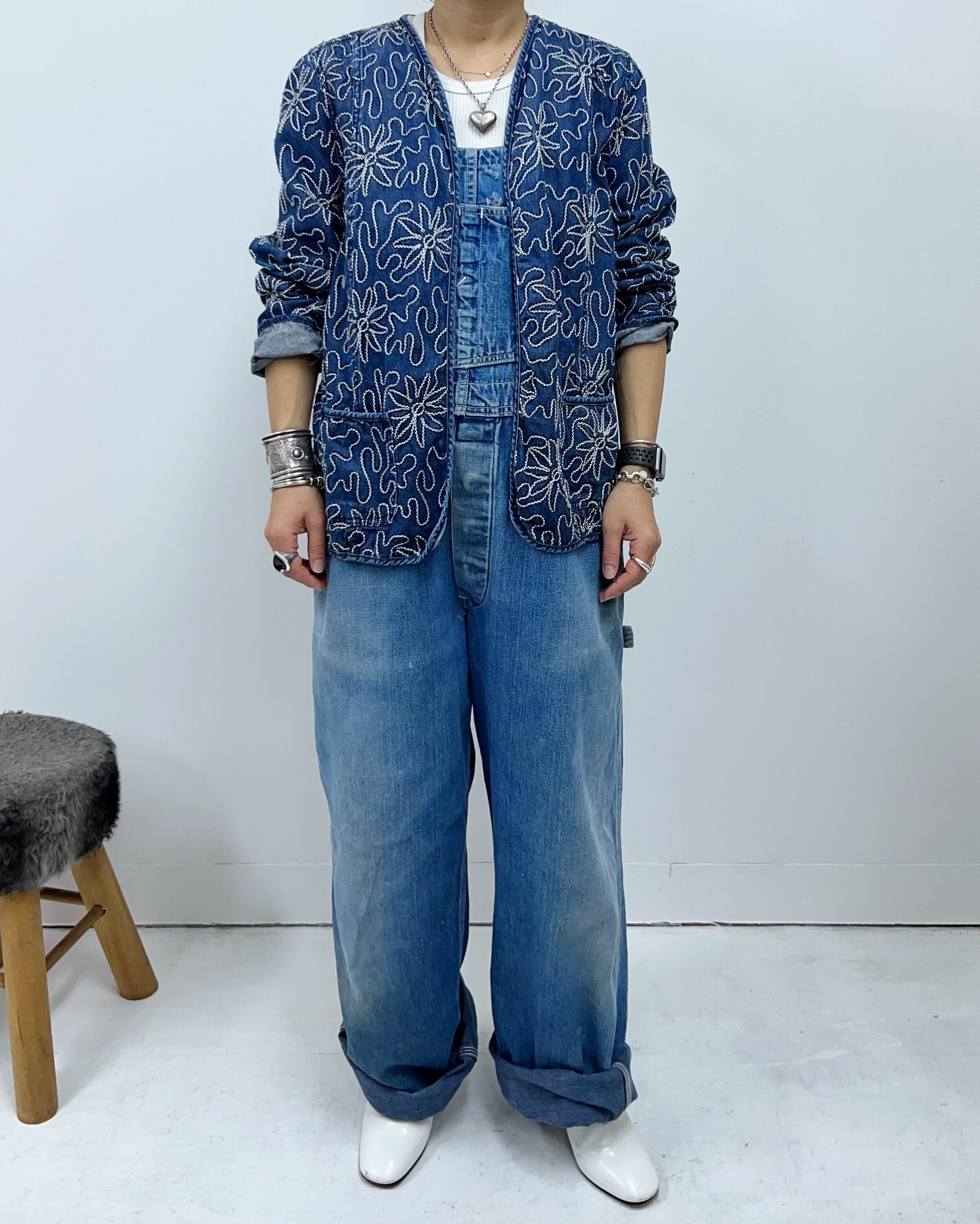 やや濃いめのデニムジャケットとセットアップ風に着て楽しむのも素敵ですね