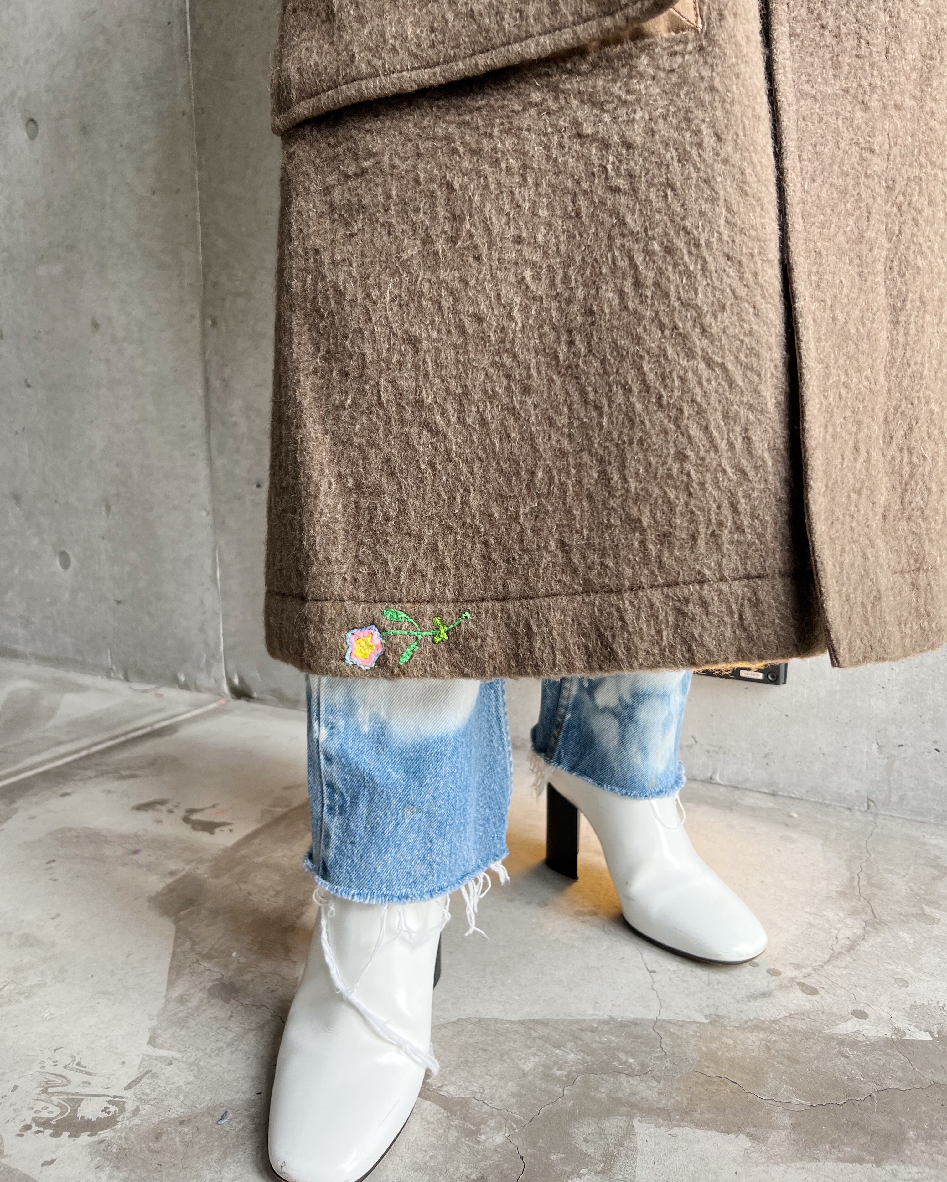 コンディション記載のように茶色い(サビ汚れ?)のようなシミがあったので上から花の刺繍を施しカスタム。ベースの色がアースカラーなのでカラフルな花はワンポイントながら良い存在感を感じさせています。(糸を生地の間で倒しているので裏側には響いていません)