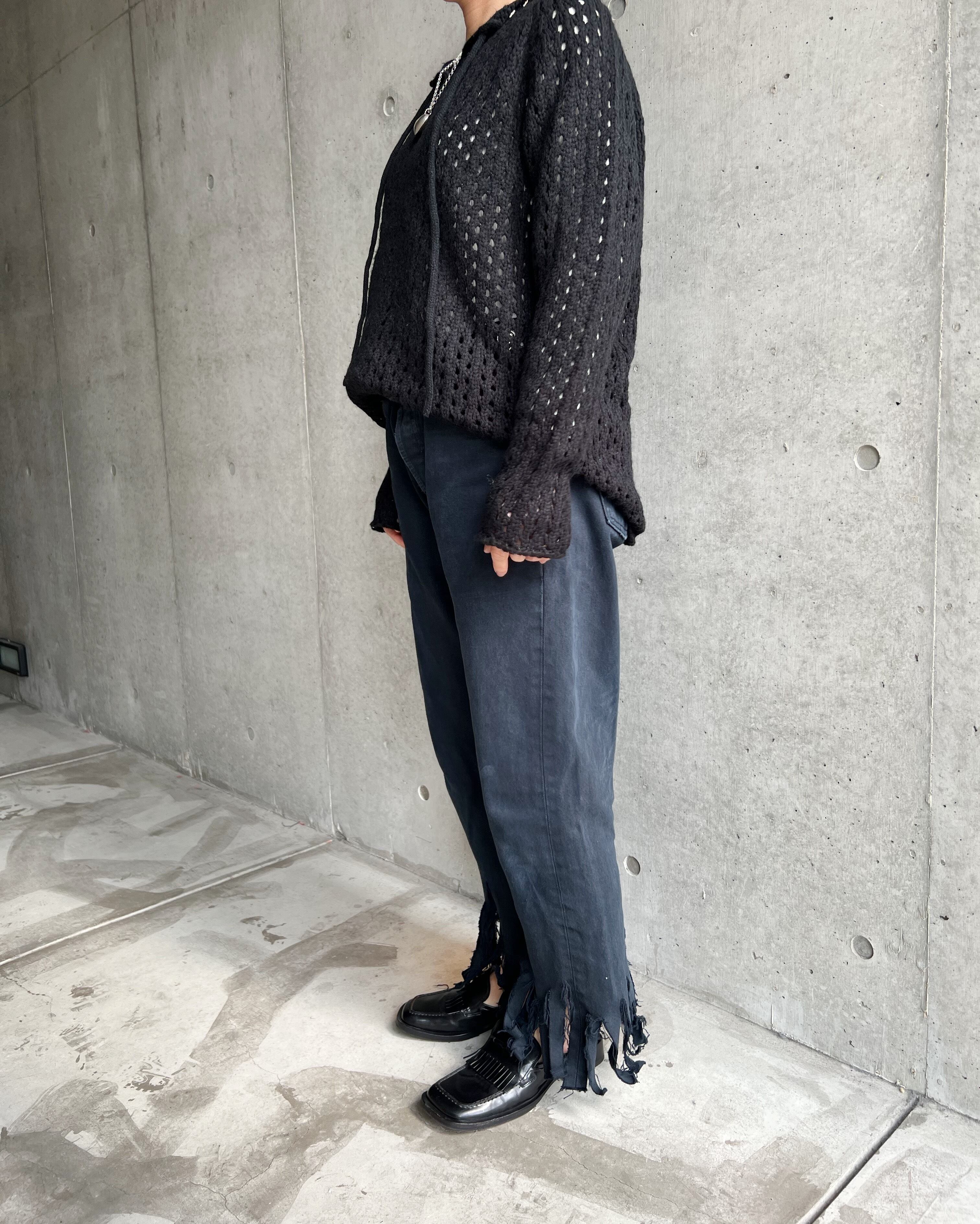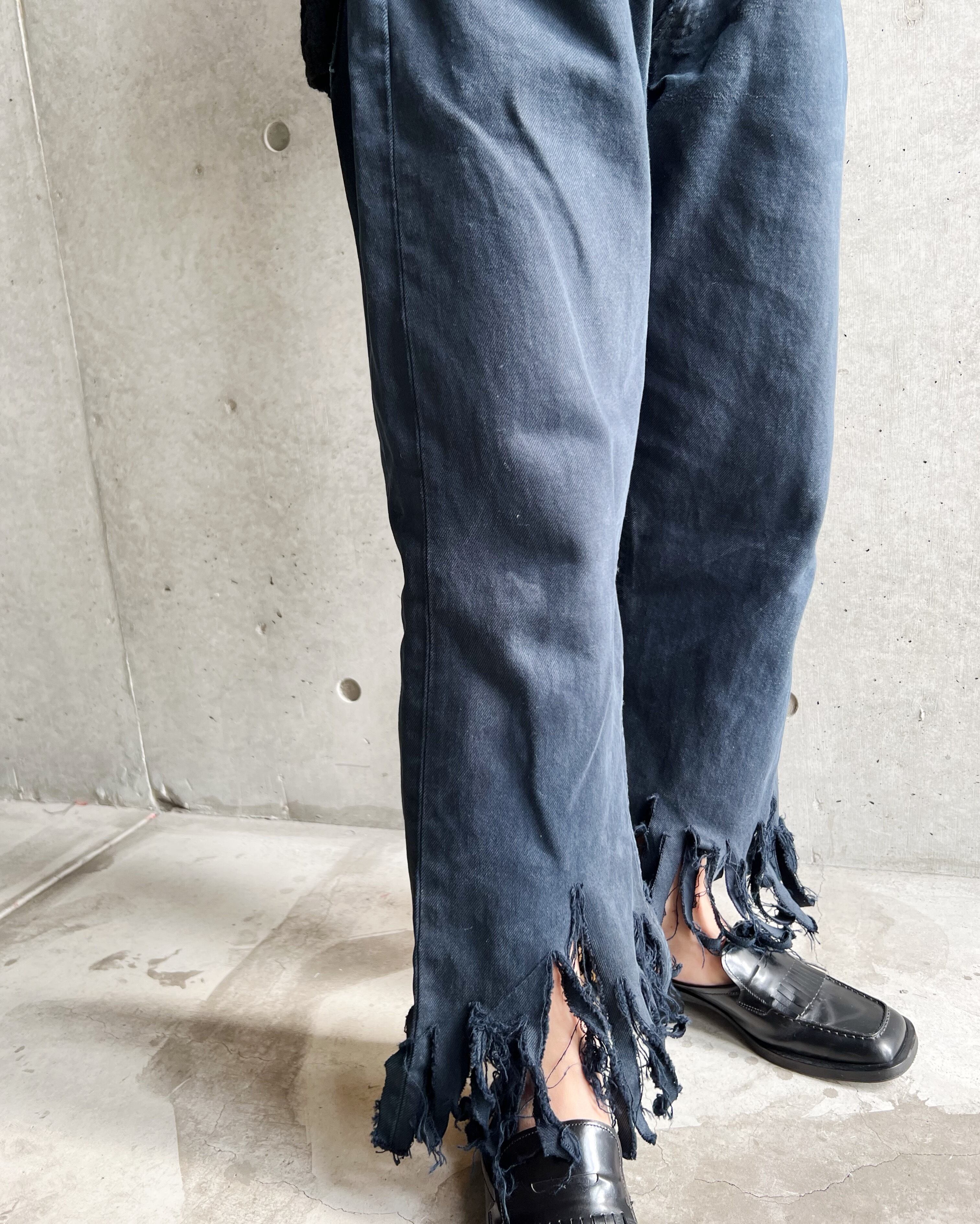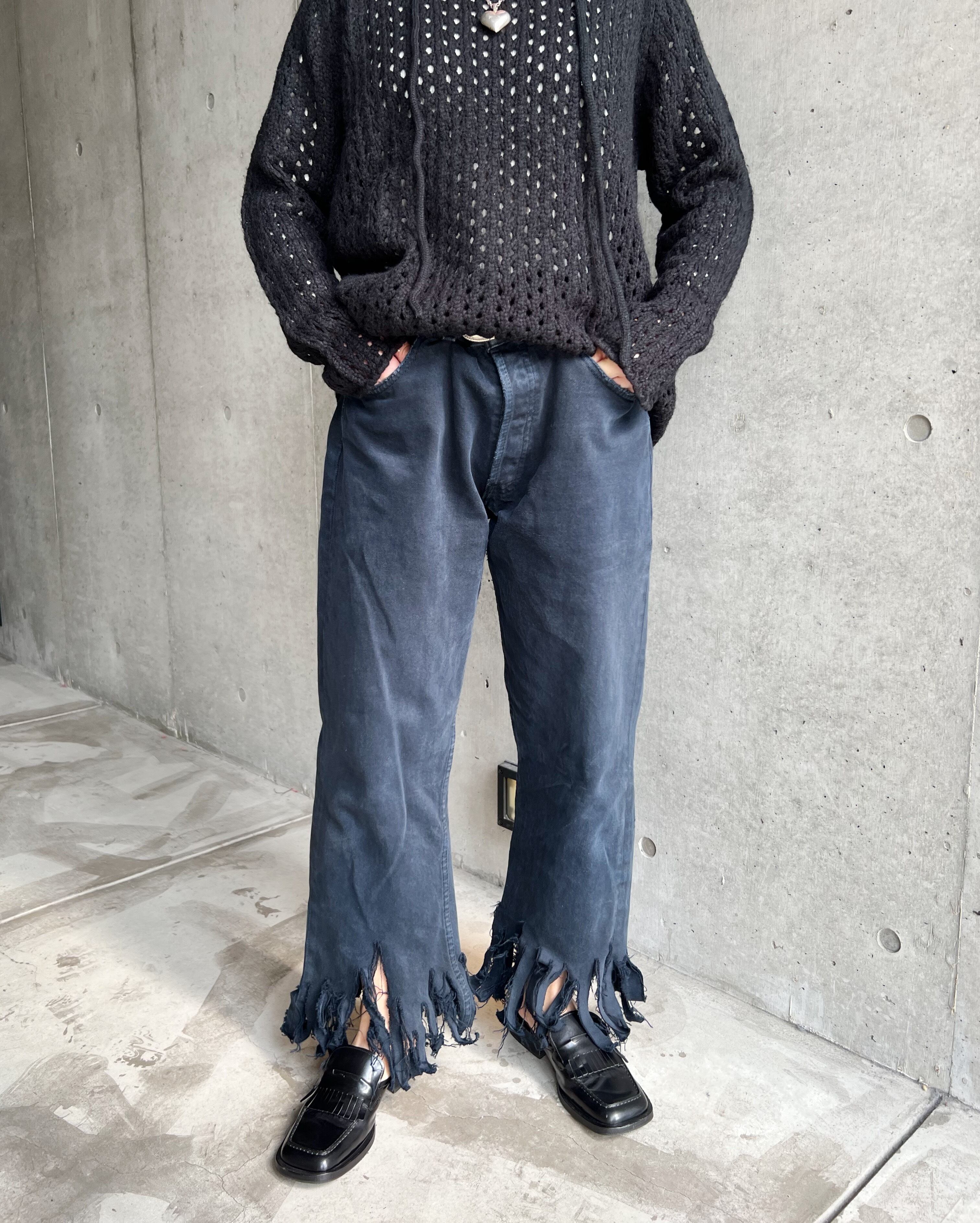 買い付け時のレングスは36inch(約90cm)と非常に長くカットしなければ履きにくい長さでしたが、程よい長さへのカットオフを施し、それぞれが異なる長さ(深さ?)のフリンジデザインにし、合わせるシューズによって色々なコーディネートが楽しめるデニムへと昇華。