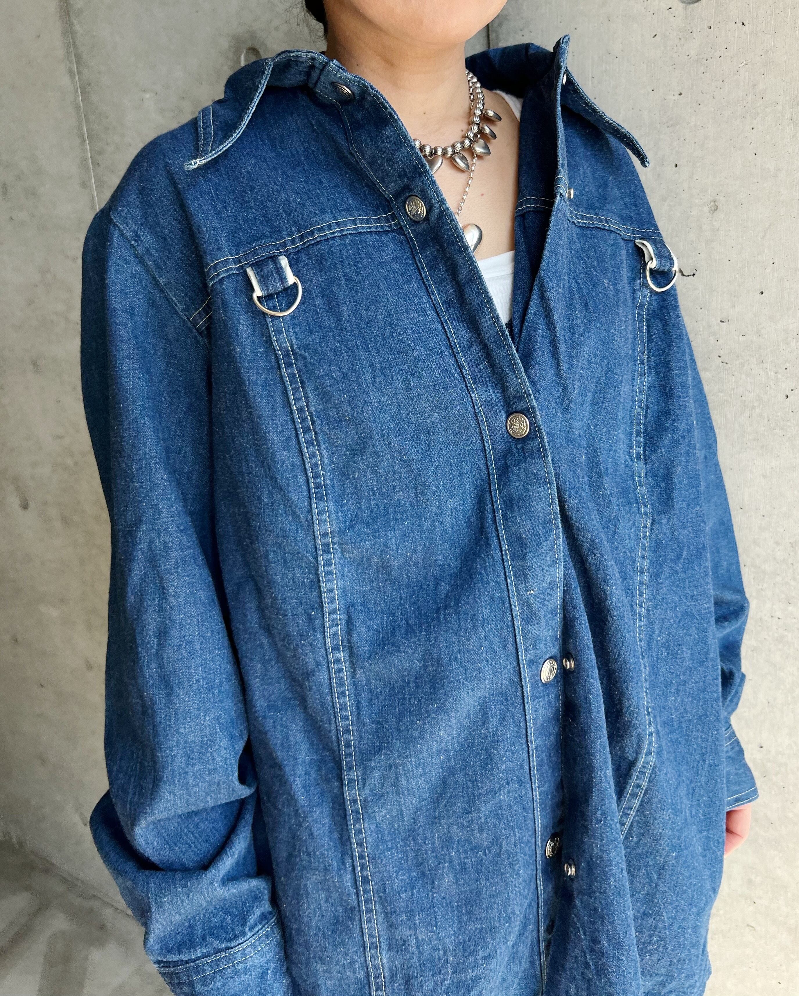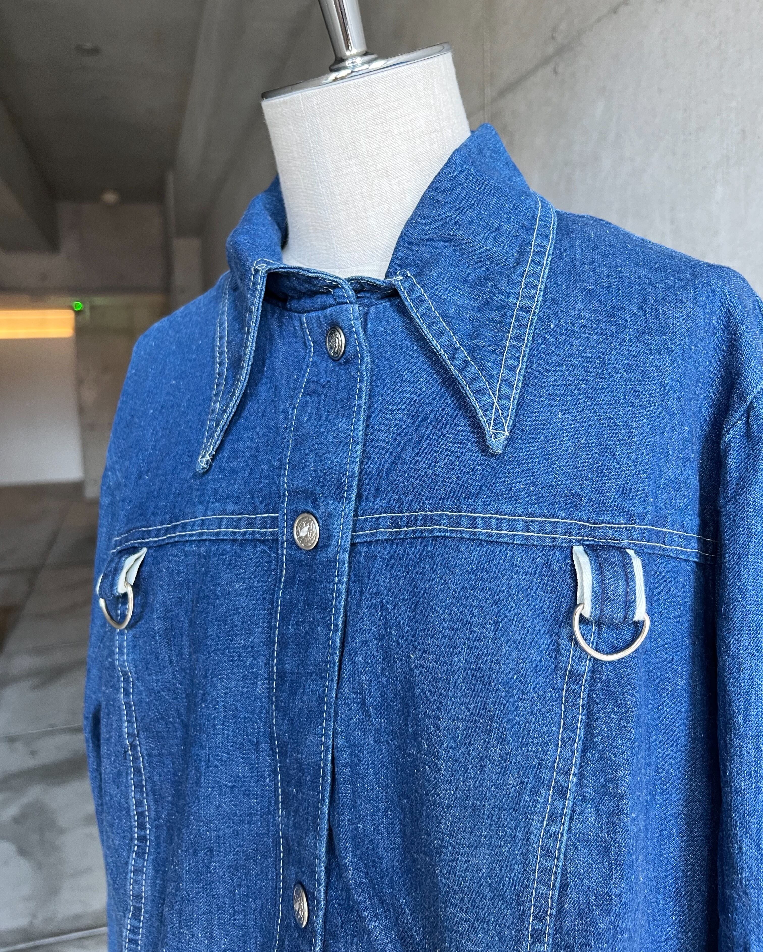 ダンガリーシャツよりも厚みのある生地(ボトムスで使われるくらいの厚さ)を用い、両胸、背中面にDカンが取り付けられたユニークなデニムシャツ