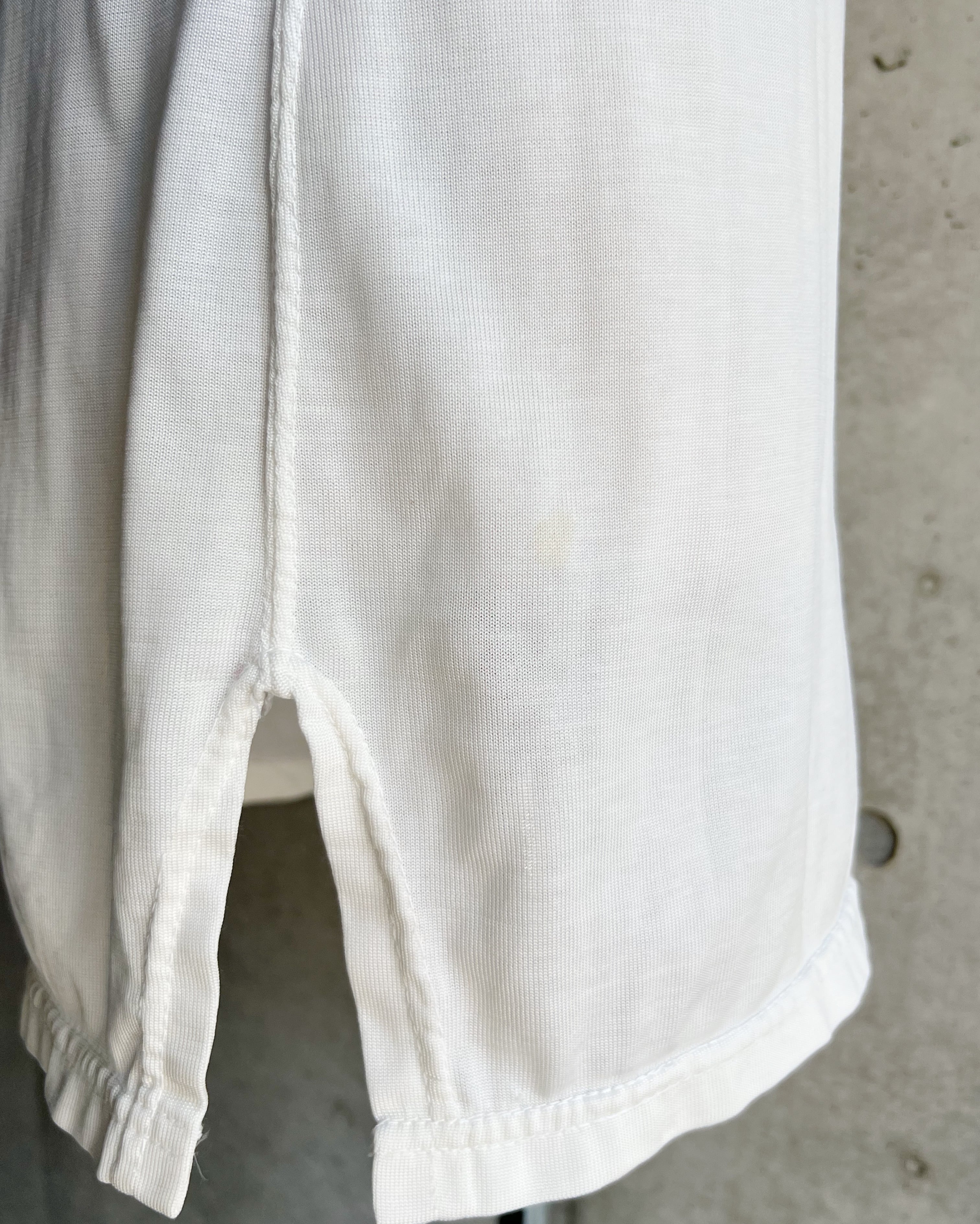 全体的にダメージは見られますが、それが絶妙なアクセントに。襟ぐり、脇周りは動き易いようにゆったり作られているのでTシャツの上からレイヤードして着たり、シャツやジャケットのインナーに用い、スポーツミックスで楽しんだり…コーディネートの幅が拡がる一枚です