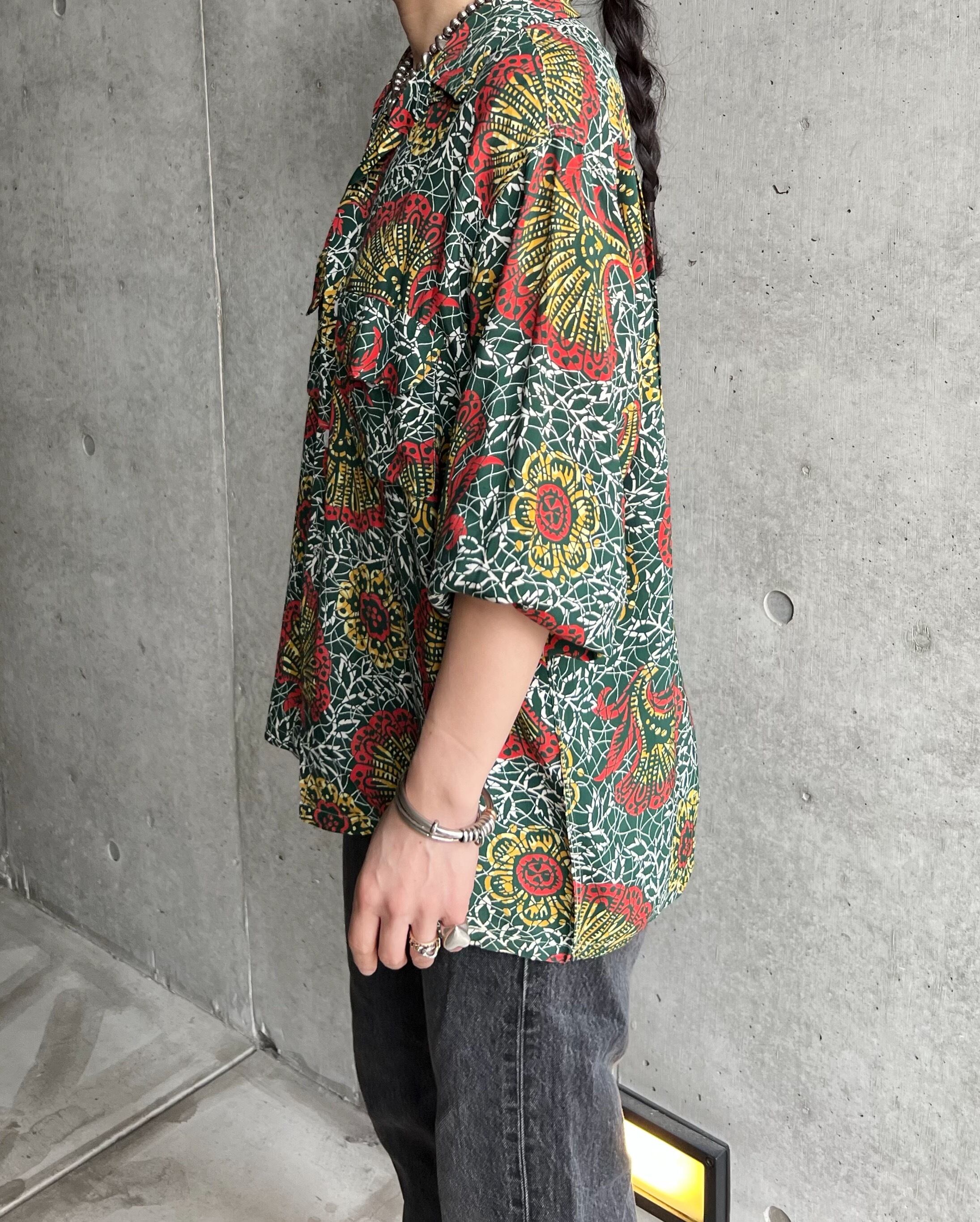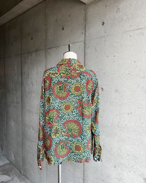 孔雀な羽を思わせる模様や花をモチーフとしたバディック柄に加えて長袖が珍しい1940年代のアロハシャツ。