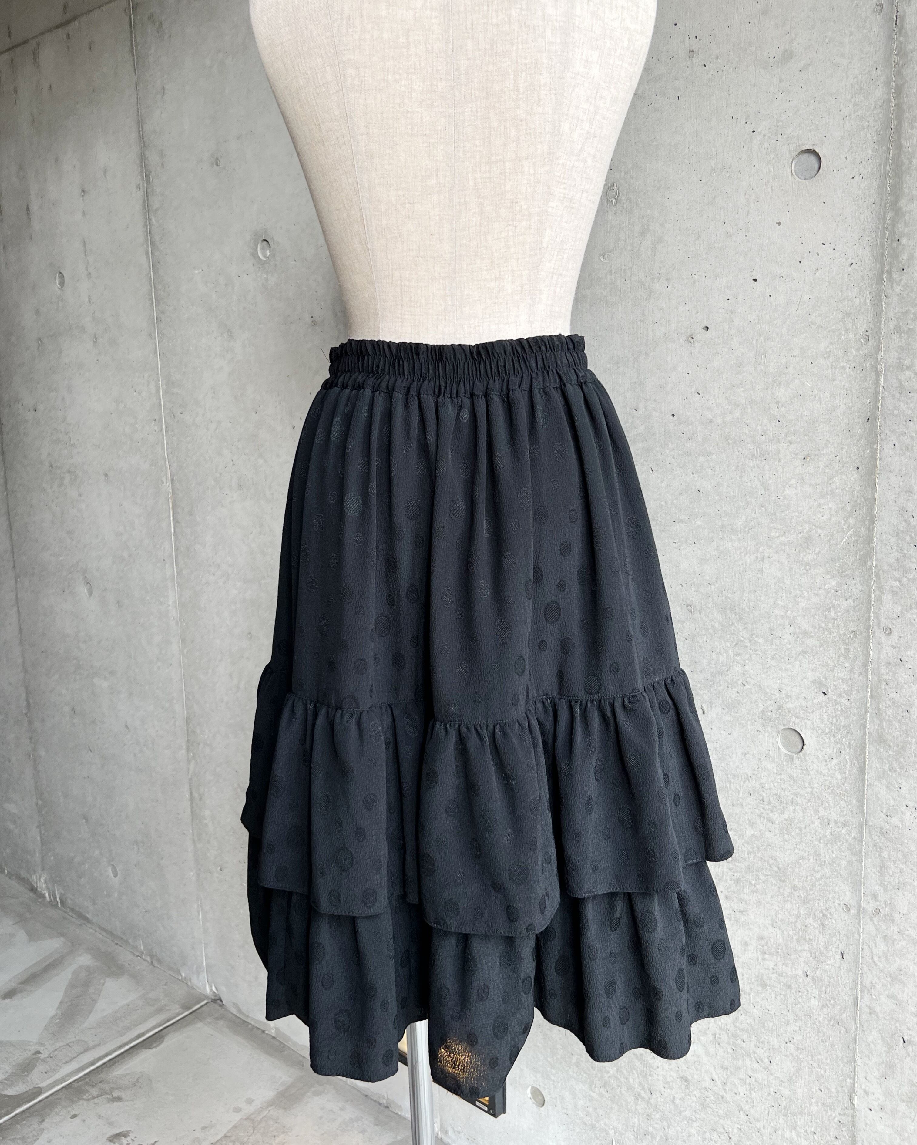 大小微妙に異なるドット柄をランダムにエンボス加工で施したユニークな生地を用い作られたティアードスカート