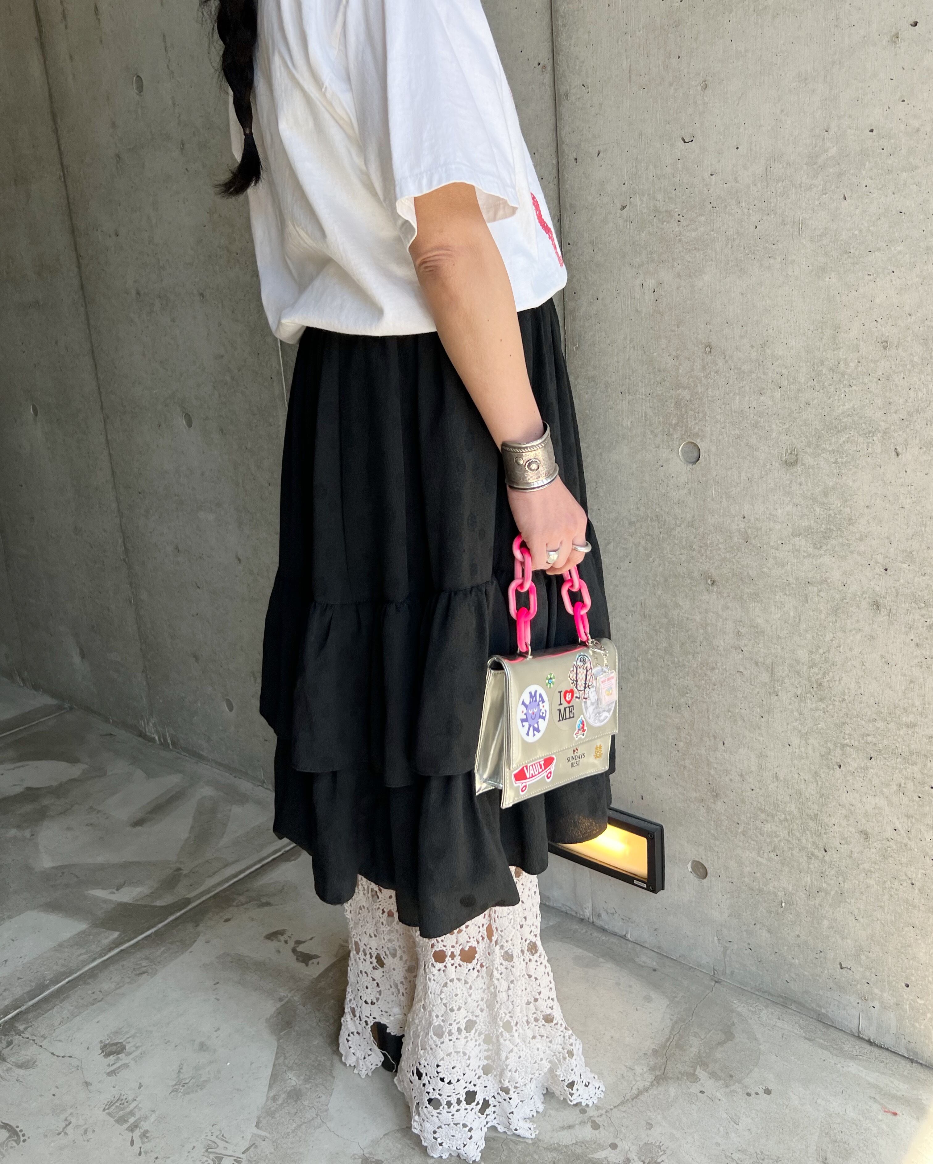 ティアードならではのボリューム感が有るので、トップスはシンプルなシルエットに、足元にボリュームを出したい時に有ると便利な一枚です