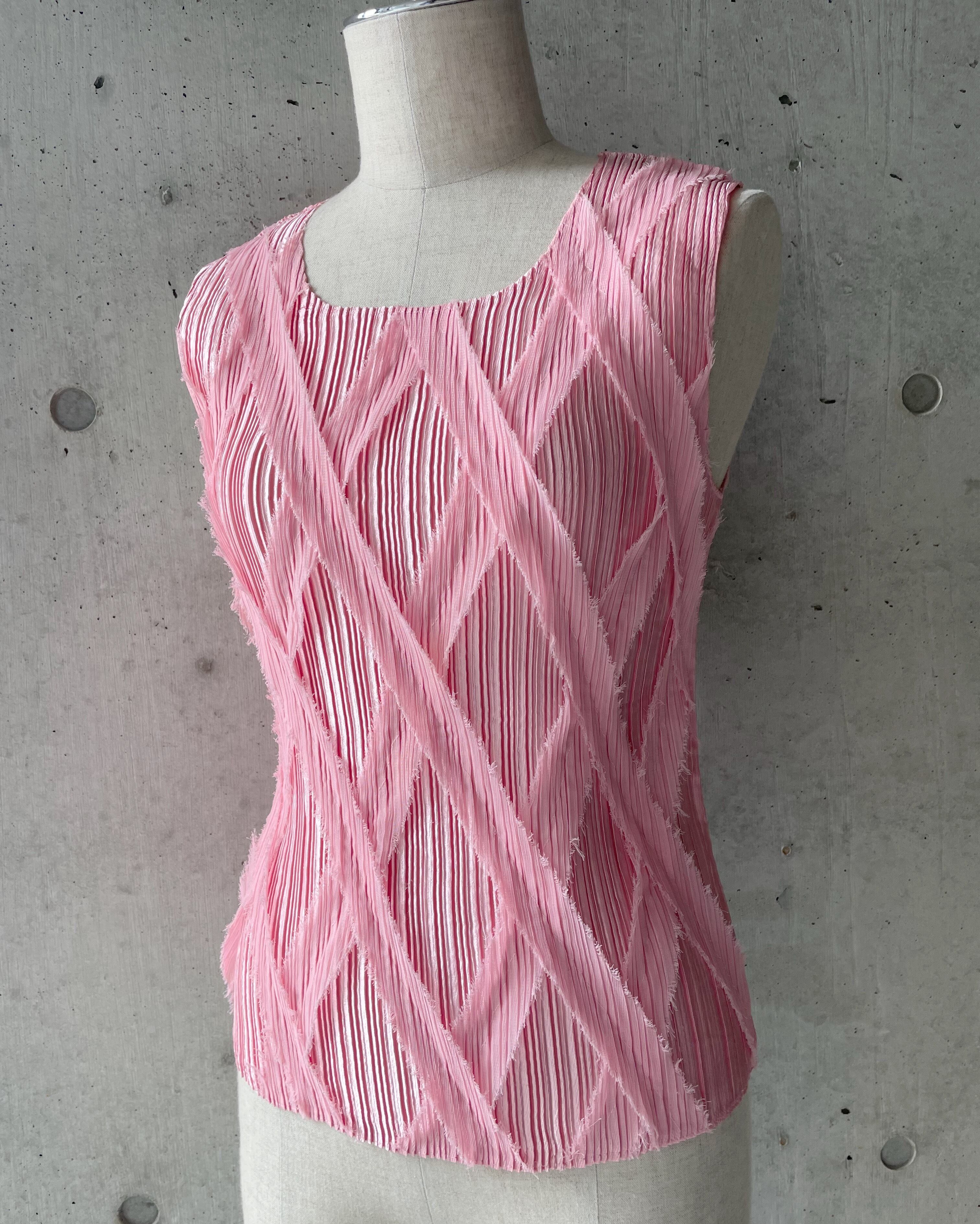 細かい伸縮性のあるプリーツボディの上にダイヤクロスを描くかのように断ち切りの別布を合わせたユニークなトップス