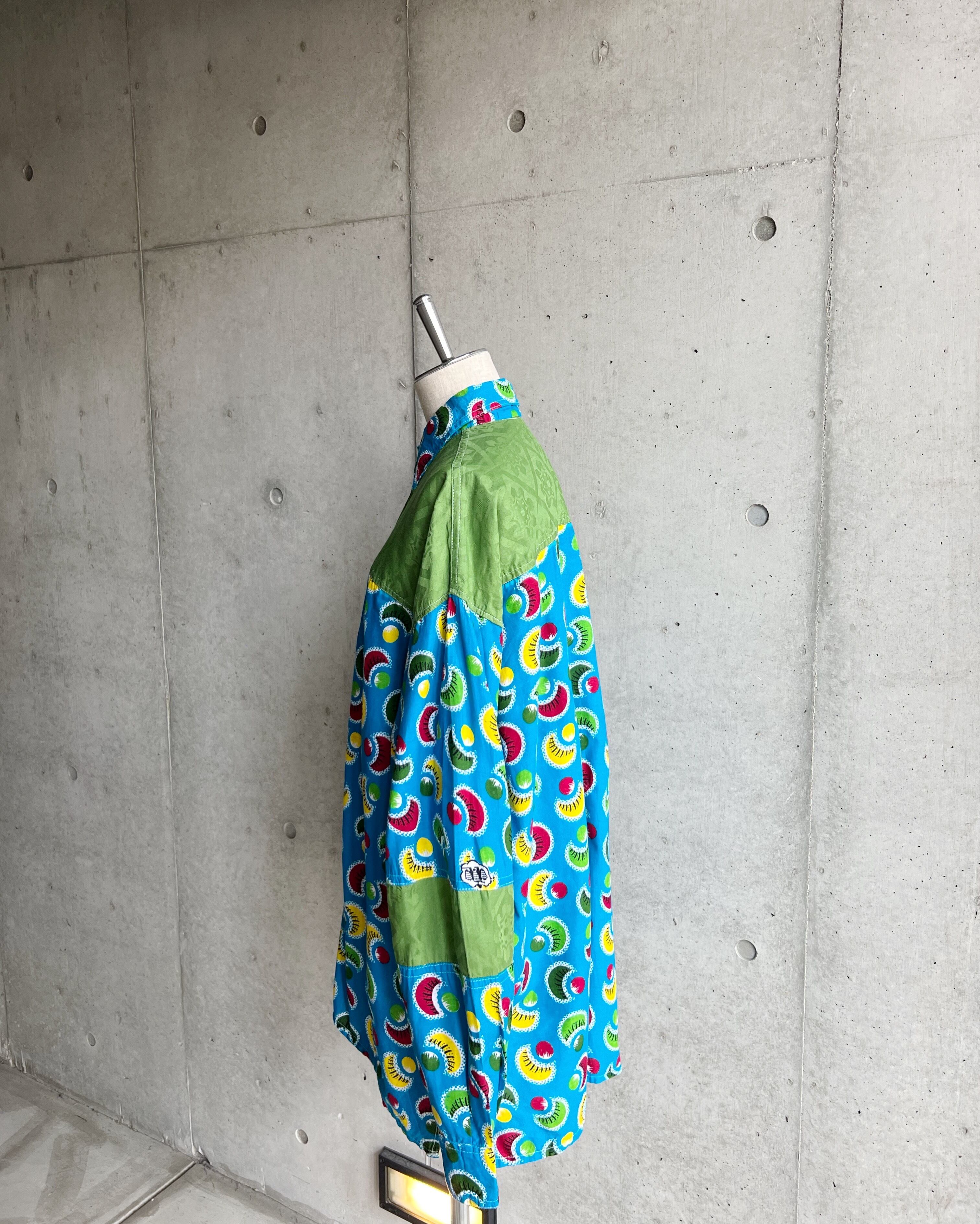 月モチーフと思われるバティック柄を基調に前立て、ヨーク部分や袖にカフス裏まで別布で切り替えられたユニークなシャツ。厚みのあるシェルボタンが程よいエレガントさを演出しています。