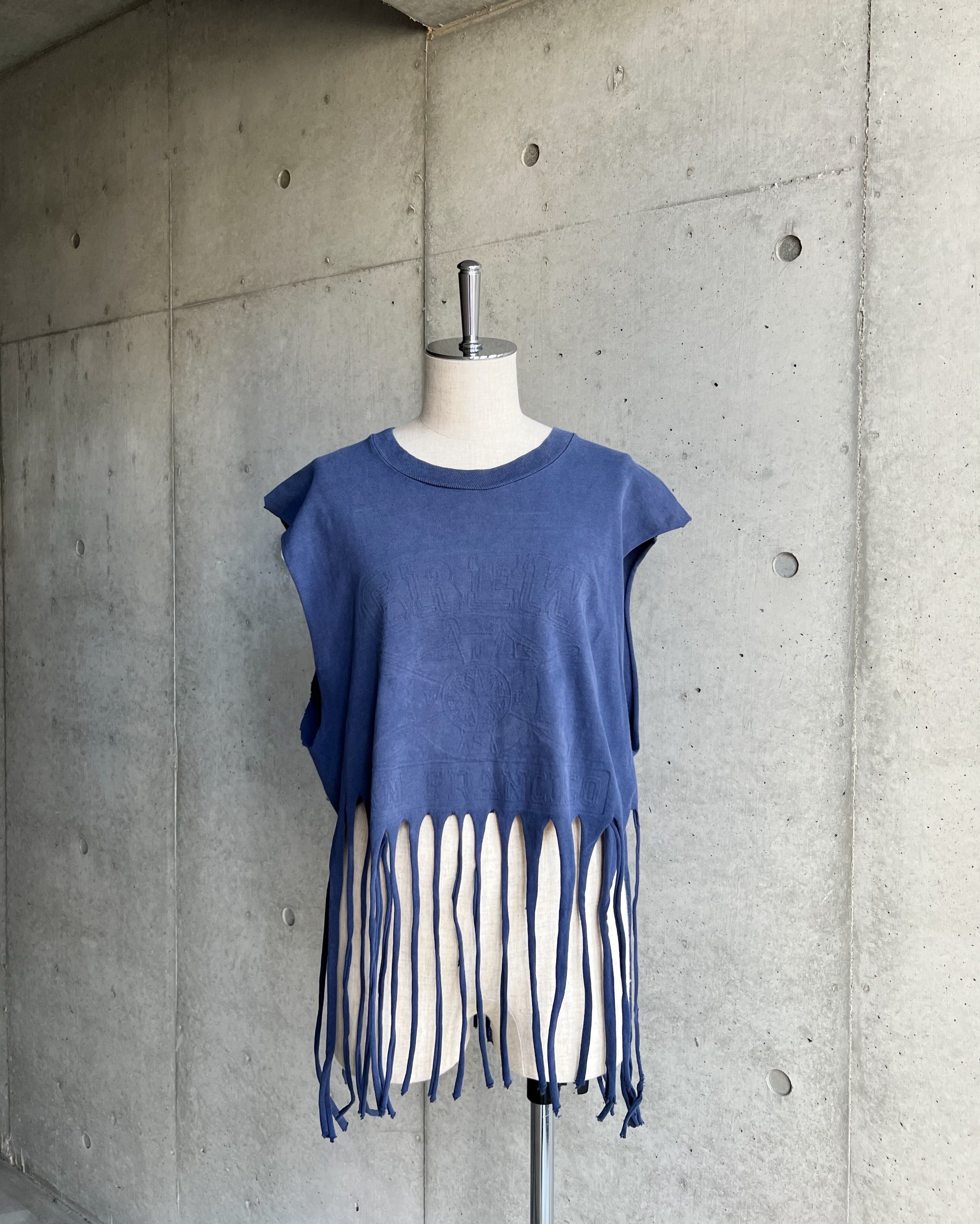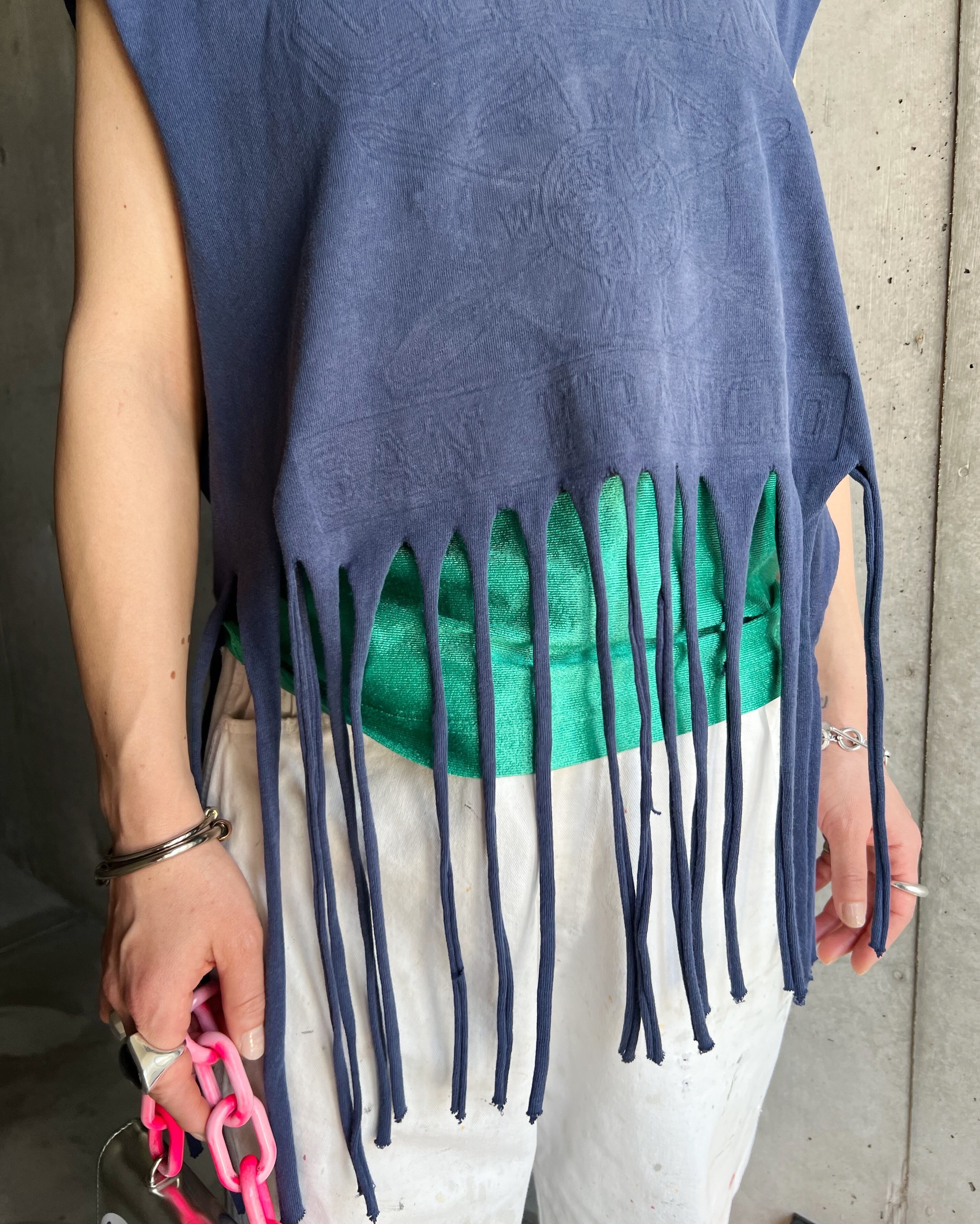 今シーズンのtamago storeの気分でもある袖をカットオフし、60~70年代のリメイクで見受けられるフリンジ調にカスタム。丈を短くする事でインナーとの組み合わせでレイヤードも楽しめます。