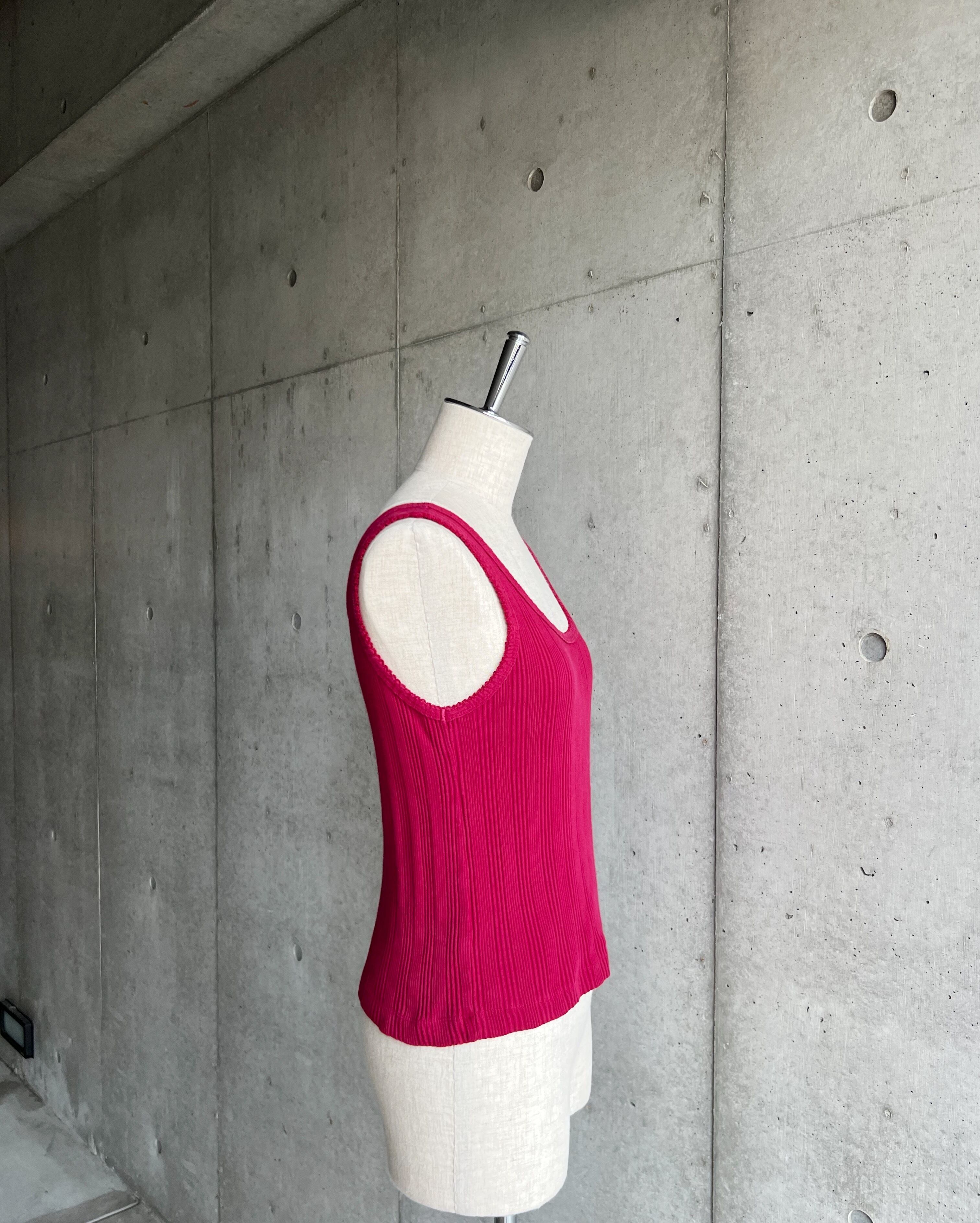 深みのあるボルドーカラーに全体のパイピングに施されたレースのような装飾が施された不規則なピッチ幅のリブタンクトップ