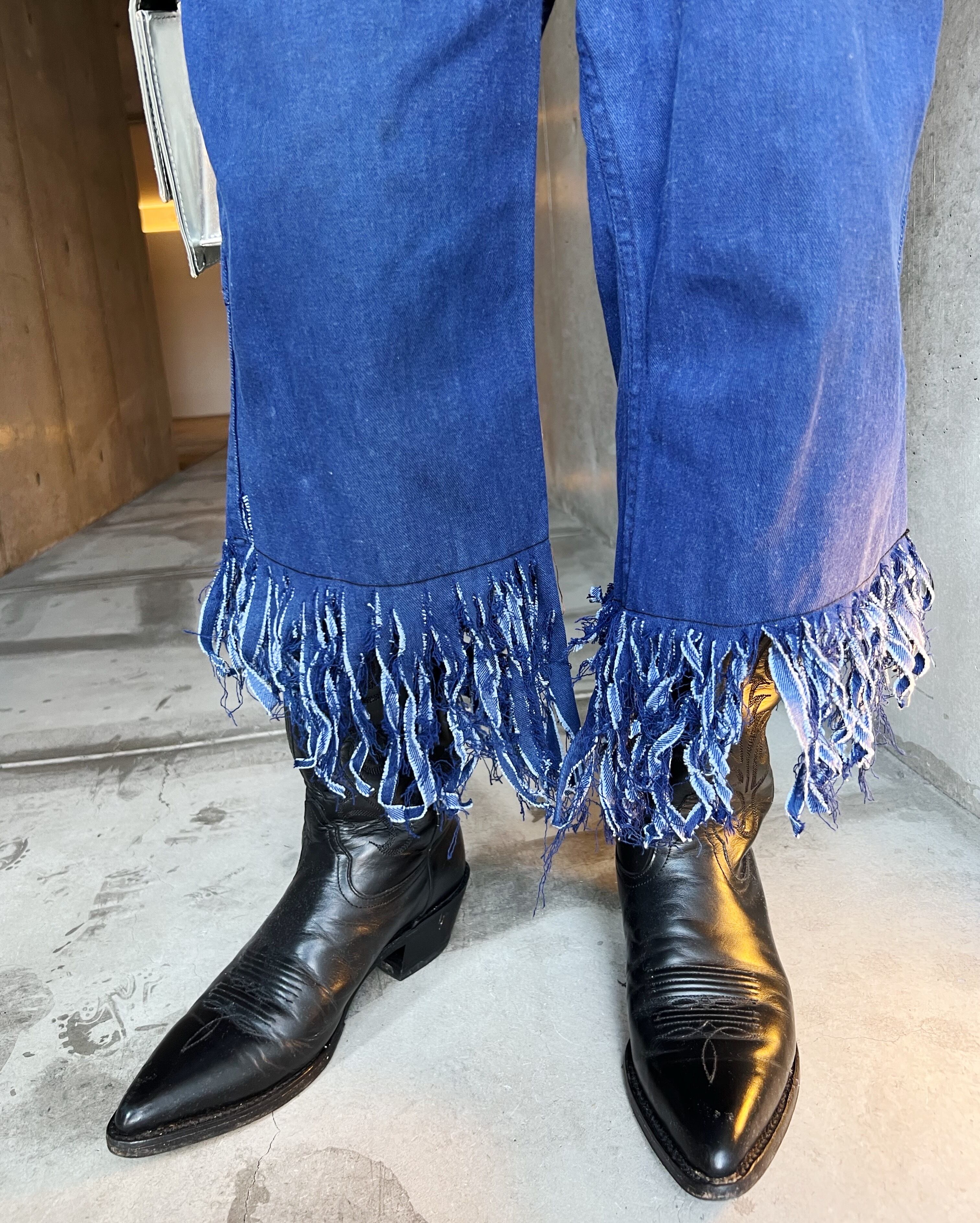 両裾を内側に向けてV字にカットし、断ち切りにてフリンジを作成。部分によってやや長さを変える事によって動いた時に異なる表情を見せてくれます。
