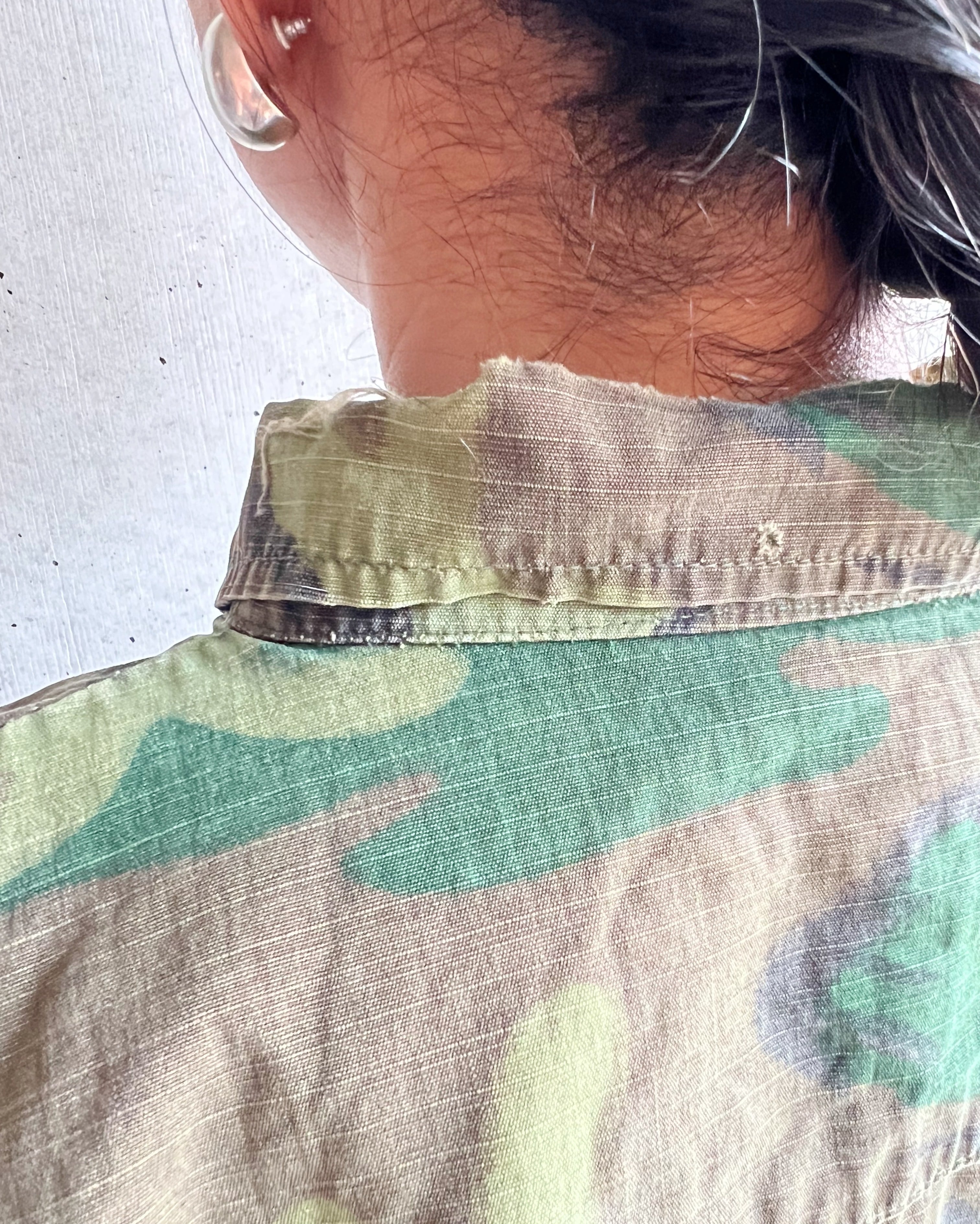 元々少しくすんだ色合いですが、中々着込んでいたようで適度にフェードしたカモフラと襟、裾のダメージが良い雰囲気を放っています。(雰囲気が良かったので修繕なしとなります)