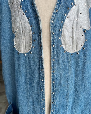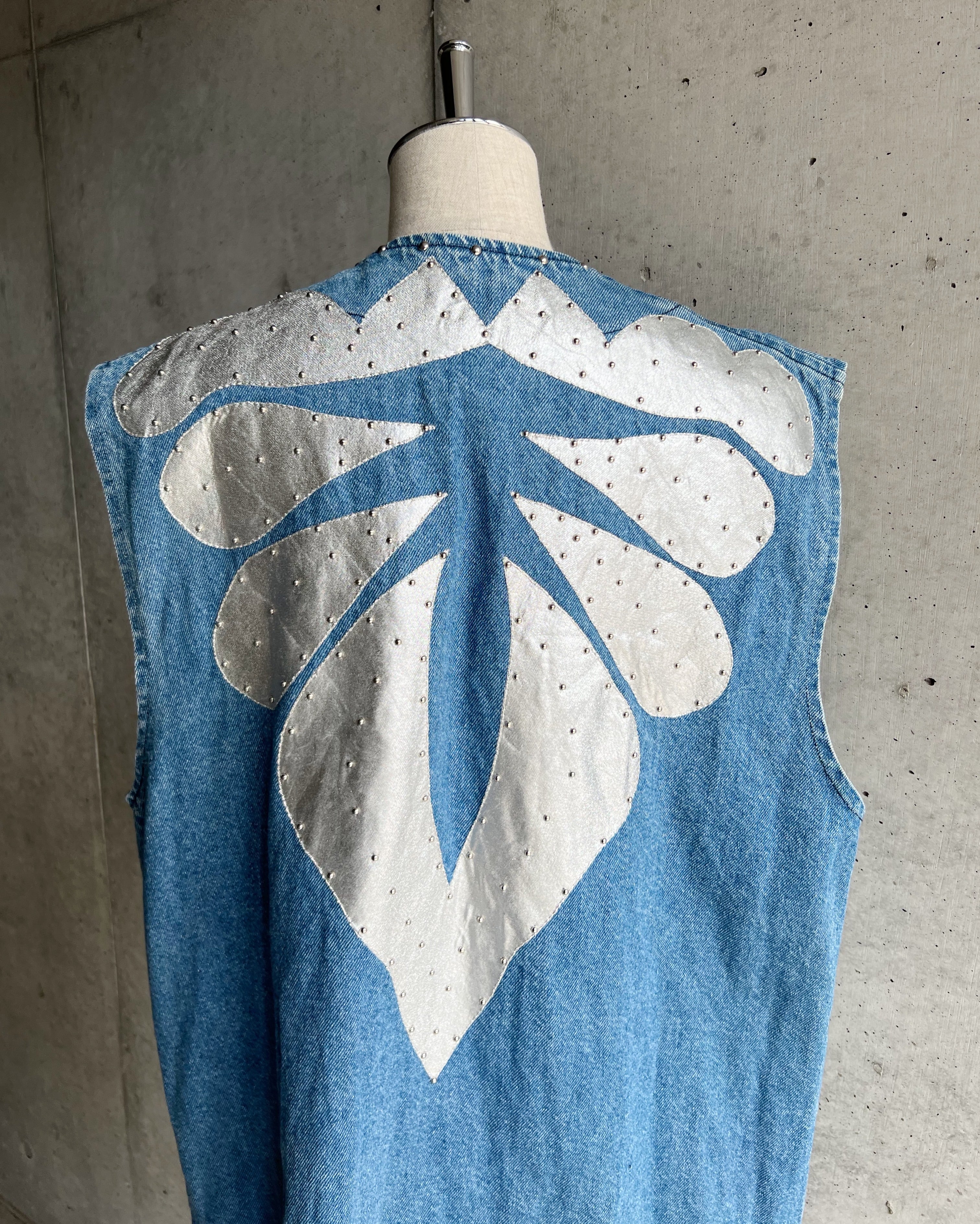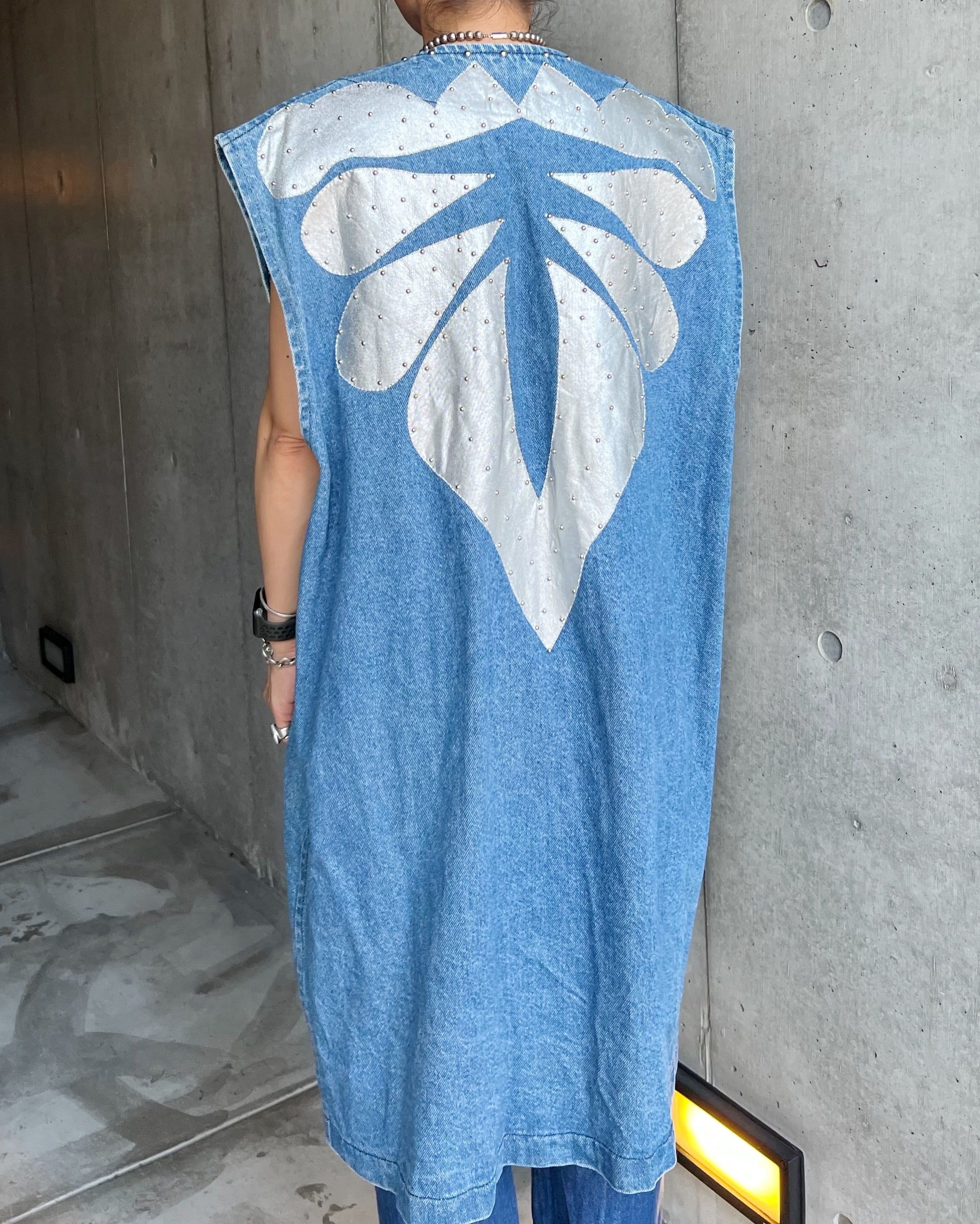 サボテンを連想させるシルバーのパッチワークに加えて均等な間隔で打ち込まれたスタッズが立体感を生み出したユニークデザインのデニムベスト。両サイドにポケットも施されており、機能面も抜群。デニム地でロング丈ベストと珍しいデザインも魅力ですね◎