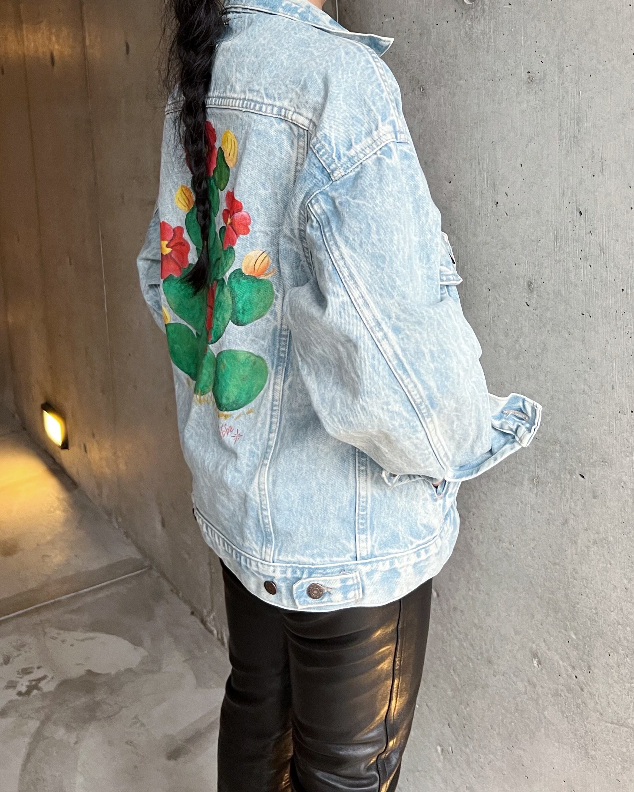 最大の特徴は、なんといっても背中に書かれた花の咲いたサボテン。色落ちしたインディゴブルーにハッキリした色がインパクト大‼︎描かれている絵のサイズ感も程良いのも素敵。キッチュなスタイリングを楽しみたい一枚です。