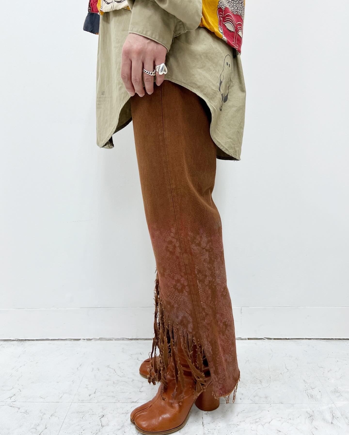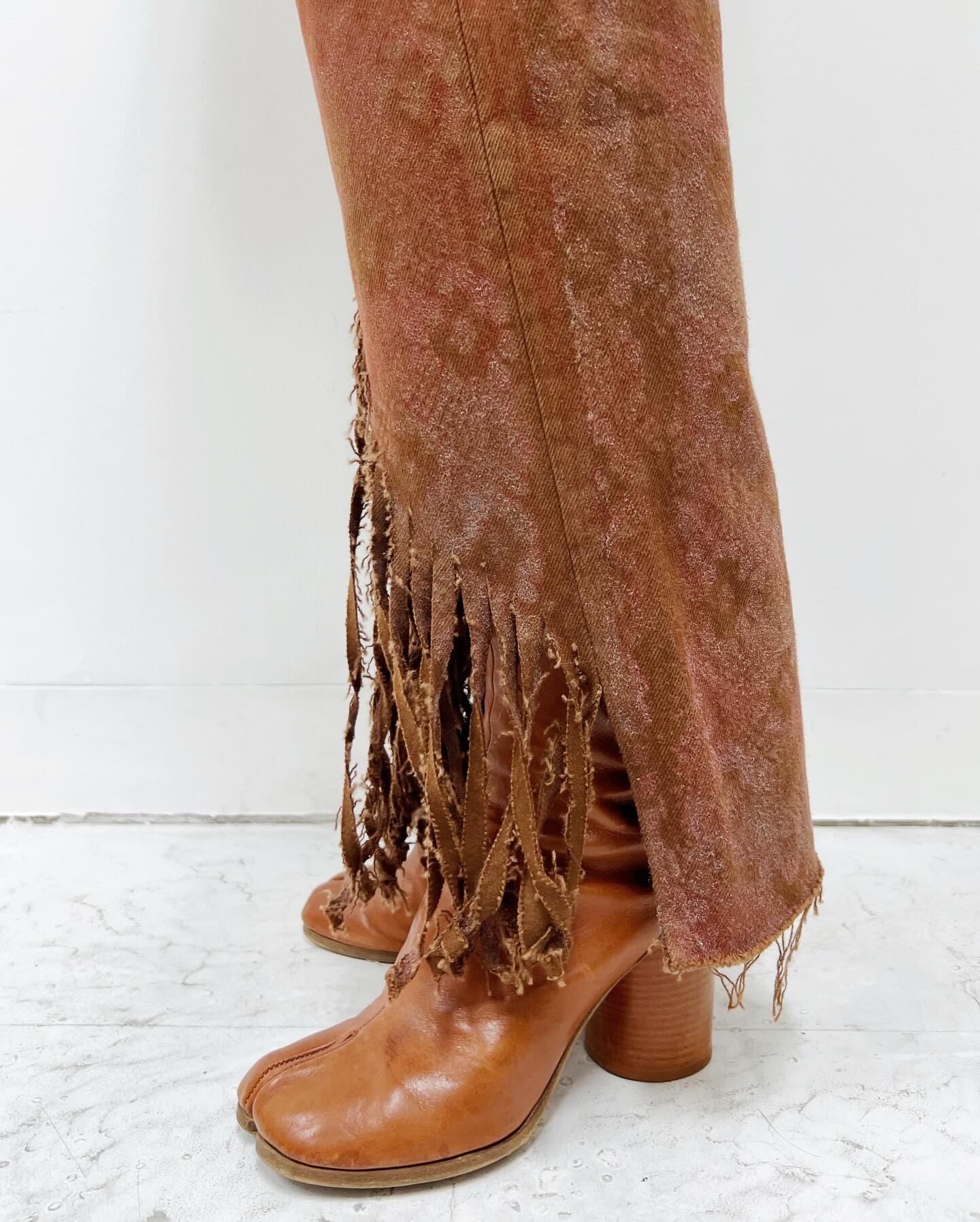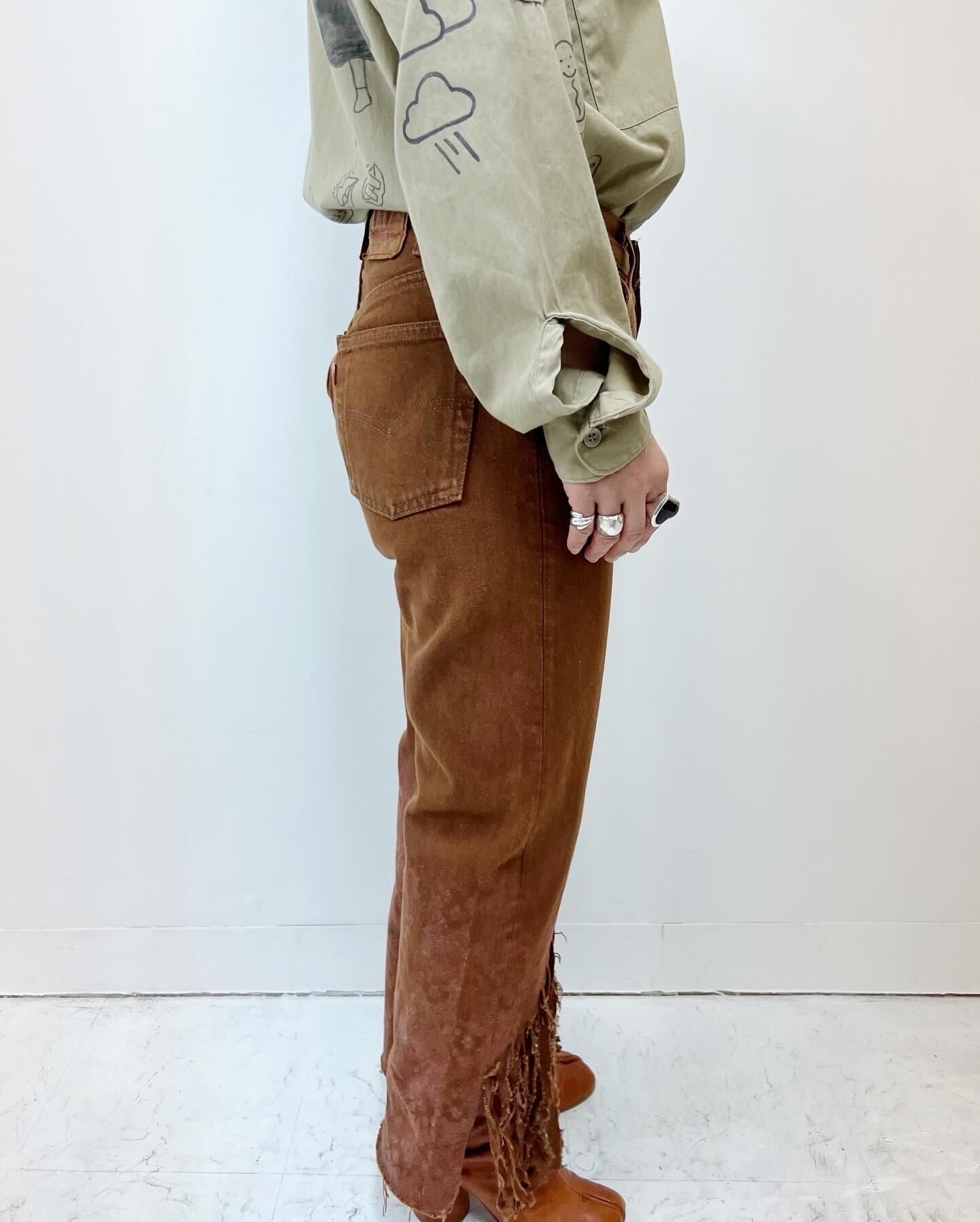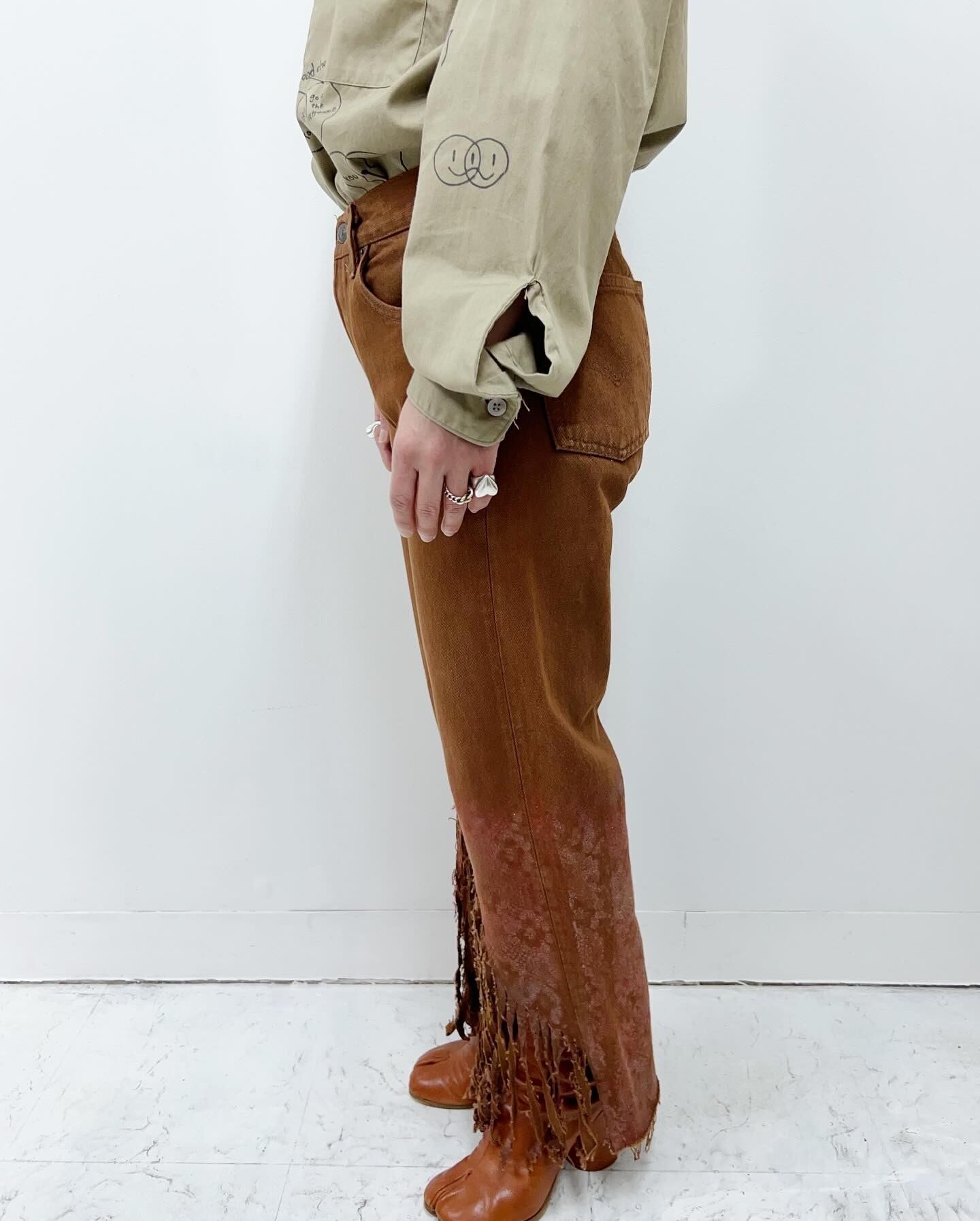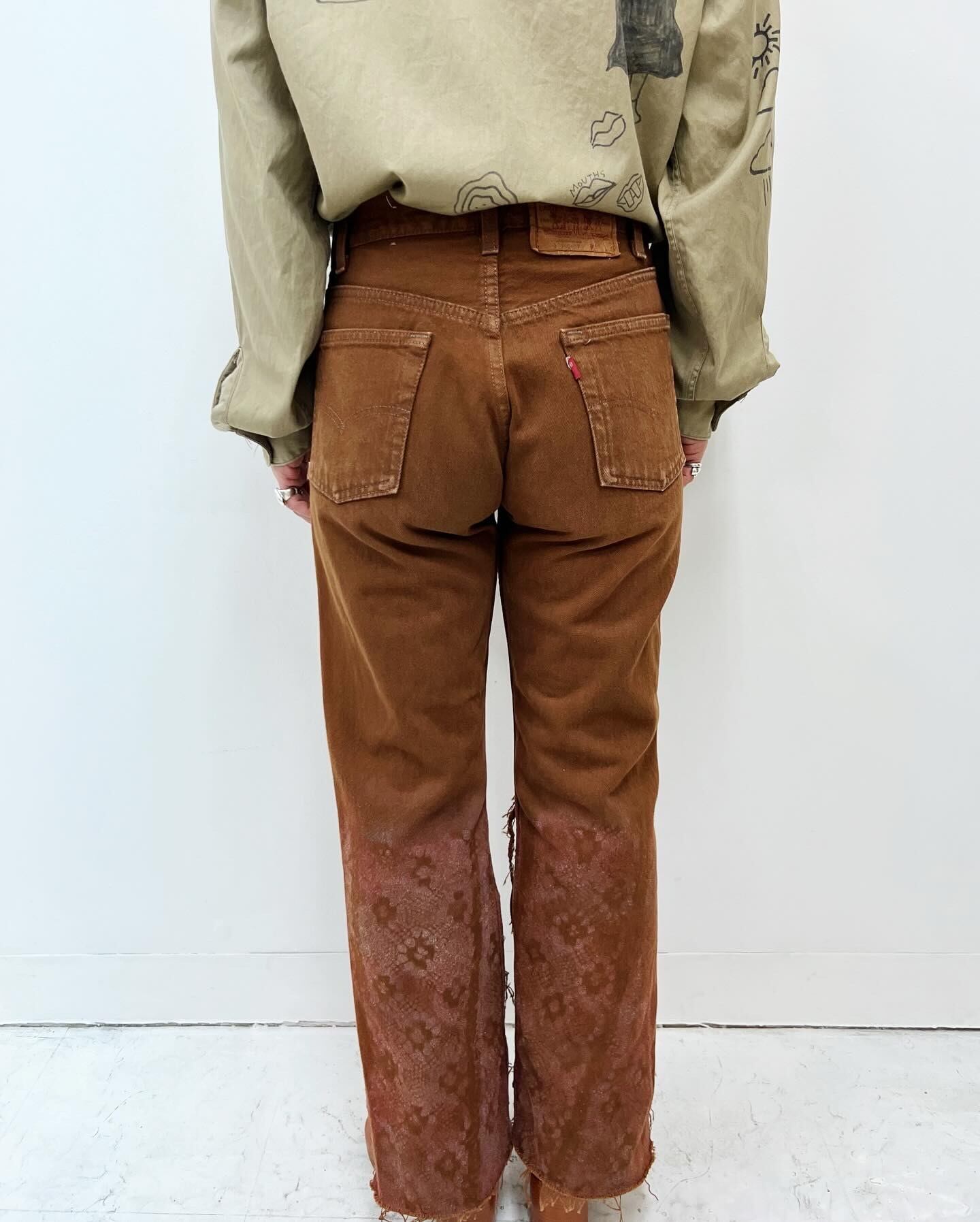 後染めでブラウンに染められたLevi's 501の裾にvintageレース生地でステンシル。更にグラデーションを描くようにカットし、裾周りをフリンジ調へとカスタム。